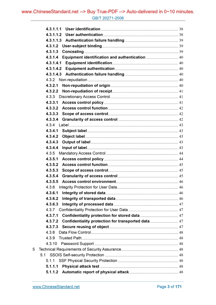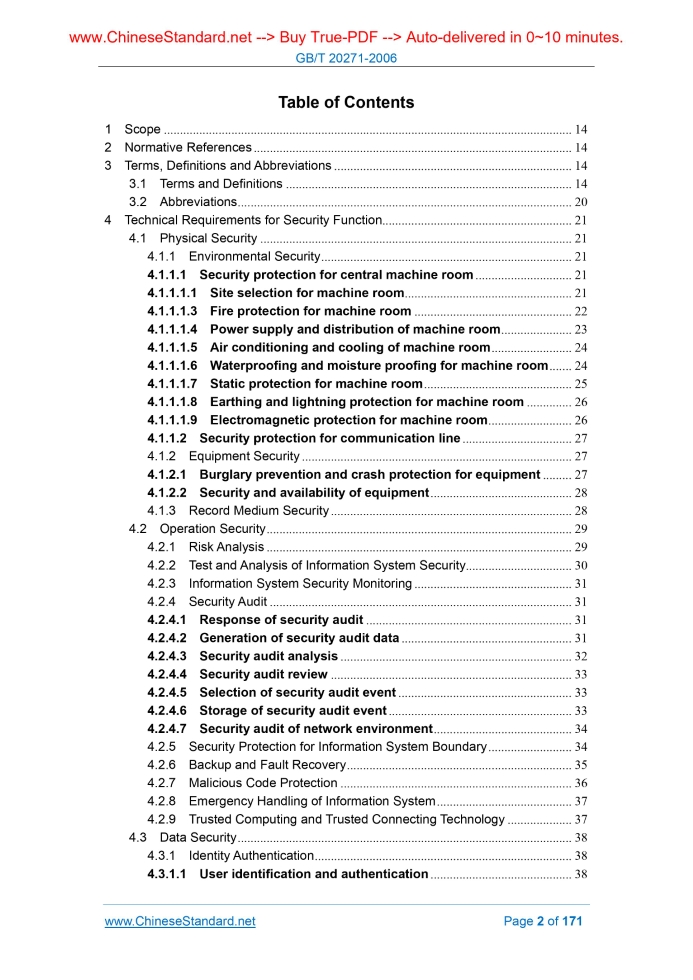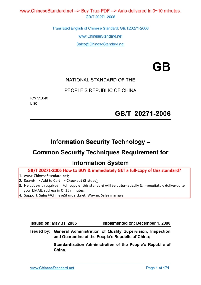 Similar standardsGB/T 20271-2006: Information security technology -- Common security techniques requirement for information system---This is an excerpt. Full copy of true-PDF in English version (including equations, symbols, images, flow-chart, tables, and figures etc.), auto-downloaded/delivered in 9 seconds, can be purchased online: https://www.ChineseStandard.net/PDF.aspx/GBT20271-2006 GB NATIONAL STANDARD OF THE PEOPLE’S REPUBLIC OF CHINA ICS 35.040 L 80 Information Security Technology – Common Security Techniques Requirement for Information System Issued on. MAY 31, 2006 Implemented on. DECEMBER 1, 2006 Issued by. General Administration of Quality Supervision, Inspection and Quarantine of the People’s Republic of China; Standardization Administration of the People’s Republic of China. Table of Contents1 Scope... 14 2 Normative References... 14 3 Terms, Definitions and Abbreviations... 14 4 Technical Requirements for Security Function... 21 5 Technical Requirements of Security Assurance... 48 6 Graded Requirements for Security Technology of Information System... 76 Appendix A (Informative) Explanation of Standard Concept... 132 Appendix B (Informative) Security Design Reference of Graded Information System ... 136 Appendix C (Informative) The Corresponding Relationship between the Elements and Graded Requirements of Security Technology... 156 References... 1711 ScopeThis Standard specifies the requirements of every security level for the security technology required for information system security according to the classification of five security protection levels in GB 17859-1999. This Standard is applicable to the design and realization of security information system according to the graded requirements, and serves for reference for the test and management of the information system security implemented according to graded requirements.2 Normative ReferencesThe following normative documents contain the provisions which, through reference in this text, constitute the provisions of this Standard. For dated references, the subsequent amendments (excluding corrigendum) or revisions of these publications do not apply. However, all parties who enter into an agreement according to this Standard are encouraged to study whether the latest edition of the normative document is applicable. For undated references, the latest edition of the normative document applies. GB 17859-1999 Graded Criteria for Security Protection of Computer Information System GBJ 45-1982 Specifications for the Design of Highrise Civil Buildings (Trial) - Fire Prevention TJ 16-1974 Code for Design of Building Fire Protection3 Terms, Definitions and Abbreviations3.1 Terms and Definitions For the purposes of this Standard, the terms and definitions specified in GB 17859- 1999 AND those listed below apply. 3.2 Abbreviations For the purpose of this Standard, the following abbreviations apply. CM. configuration management CMS. configuration management system PP. protection profile SFP. security function policy SSC SSF. SSF scope of control SSF SSOIS. SSOIS security function SSP SSOIS. SSOIS security policy SSOIS. security subsystem of information system ST. security target4 Technical Requirements for Security Function4.1 Physical Security 4.1.1 Environmental Security 4.1.1.1 Security protection for central machine room 4.2 Operation Security 4.2.1 Risk Analysis The risk analysis of information system shall be carried out according to the following requirements. 4.2.4 Security Audit 4.2.4.1 Response of security audit Security audit SSF shall respond to audit event according to the following requirements. 4.2.4.2 Generation of security audit data Audit data shall be generated by security audit SSF according to the following requirements. 4.2.4.3 Security audit analysis According to different requirements on security audit, security audit analysis is divided into. 4.2.6 Backup and Fault Recovery In order to realize the defined recovery function, periodic backup or backup according to certain conditions must be carried out under normal operation of information system. Different recovery requirements shall be supported with different backup. According to different requirements on operation security of information system, security technology and mechanism for the realization of backup and fault recovery are divided into. 4.2.9 Trusted Computing and Trusted Connecting Technology 4.3 Data Security 4.3.1 Identity Authentication 4.3.1.1 User identification and authentication 4.3.1.4 Equipment identification and authentication 4.3.1.4.1 Equipment identification According to different requirements on equipment identification and authentication, equipment identification is divided into. 4.3.3.4 Granularity of access control According to the different requirements of access control, granularity of discretionary access control is graded into. 4.3.9 Trusted Path Trusted path between the user and SSF shall.5 Technical Requirements of Security Assurance5.1 SSOIS Self-security Protection 5.1.1 SSF Physical Security Protection 5.1.2 SSF Operation Security Protection 5.1.2.1 Security operation test SSF shall provide security operation test for SSF software periodically under normal operation, as required by the authorized user or under other conditions, through operating test suit during the system initialization, so as to verify that the security assumption provided by SSF can be executed correctly. 5.1.2.5 Domain separation SFP shall ensure at least a security domain to protect SSF implementation from external interference and tampering (e.g. modify the SSF code or data structure) by the untrusted subject. According to the different requirements of SSF operation security protection, domain separation is graded into. 5.1.3 SSF Data Security Protection 5.1.3.1 Availability of output SSF data The availability of SSF data (like password, secret key, audit data or executable code of SSF) which are output from SSF to that of remote information 