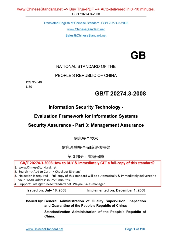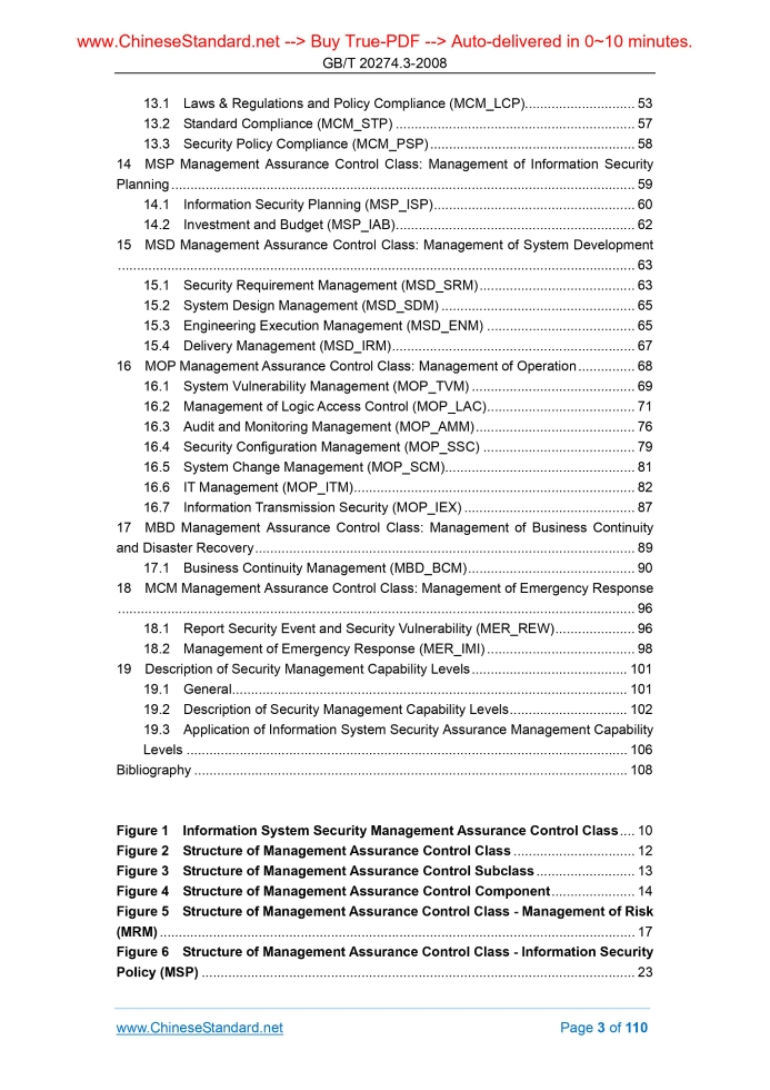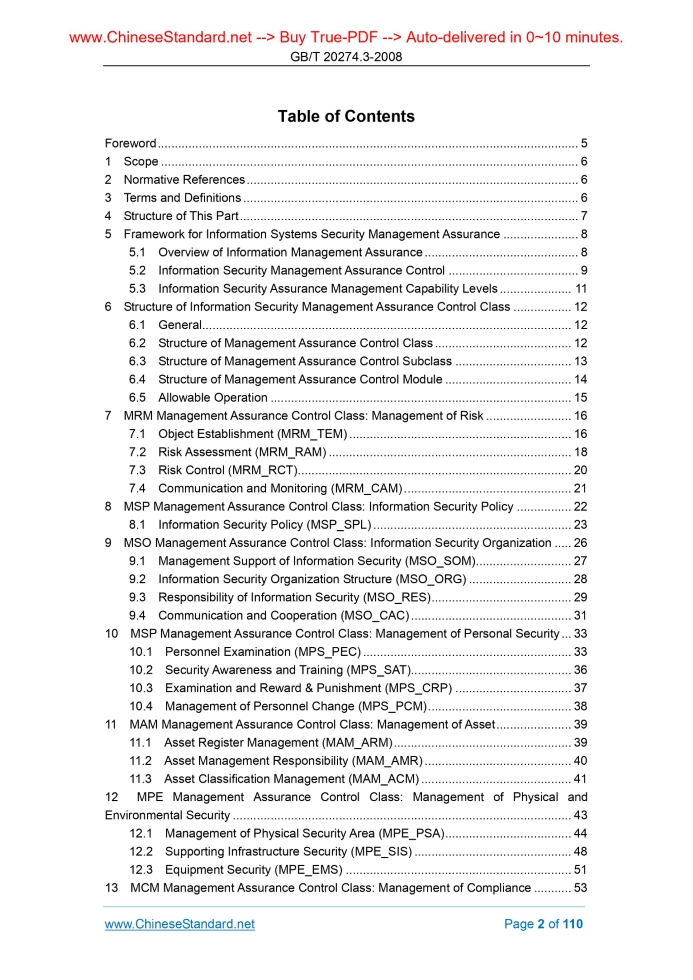 Similar standardsGB/T 20274.3-2008: Information security technology -- Evaluation framework for information systems security assurance -- Part 3: Management assurance---This is an excerpt. Full copy of true-PDF in English version (including equations, symbols, images, flow-chart, tables, and figures etc.), auto-downloaded/delivered in 9 seconds, can be purchased online: https://www.ChineseStandard.net/PDF.aspx/GBT20274.3-2008 GB NATIONAL STANDARD OF THE PEOPLE’S REPUBLIC OF CHINA ICS 35.040 L 80 Information Security Technology - Evaluation Framework for Information Systems Security Assurance - Part 3.Management Assurance Issued on. JULY 18, 2008 Implemented on. DECEMBER 1, 2008 Issued by. General Administration of Quality Supervision, Inspection and Quarantine of the People’s Republic of China; Standardization Administration of the People's Republic of China. Table of ContentsForeword... 5 1 Scope... 6 2 Normative References... 6 3 Terms and Definitions... 6 4 Structure of This Part... 7 5 Framework for Information Systems Security Management Assurance... 8 6 Structure of Information Security Management Assurance Control Class... 12 7 MRM Management Assurance Control Class. Management of Risk... 16 8 MSP Management Assurance Control Class. Information Security Policy... 22 9 MSO Management Assurance Control Class. Information Security Organization... 26 10 MSP Management Assurance Control Class. Management of Personal Security... 33 11 MAM Management Assurance Control Class. Management of Asset... 39 12 MPE Management Assurance Control Class. Management of Physical and Environmental Security... 43 13 MCM Management Assurance Control Class. Management of Compliance... 53 14 MSP Management Assurance Control Class. Management of Information Security Planning... 59 15 MSD Management Assurance Control Class. Management of System Development ... 63 16 MOP Management Assurance Control Class. Management of Operation... 68 17 MBD Management Assurance Control Class. Management of Business Continuity and Disaster Recovery... 89 18 MCM Management Assurance Control Class. Management of Emergency Response ... 96 19 Description of Security Management Capability Levels... 101 Bibliography... 1081 ScopeThis Part of GB/T 20274 establishes the framework for information systems security management assurance, and specifies the guideline & general principle for the organization starting, implementing, maintaining, evaluating and improving information security management. This Part defines and explains the security management capability level that reflects the information security management assurance capability of the organization in the information system security management assurance work, and provides the security management assurance control class requirements of the organization's information security management assurance contents. This Part is applicable to all of the organization’s users, developers and evaluation personnel involved in the information system security management.2 Normative ReferencesThe following documents contain provisions which, through reference in this text, constitute the provisions of this Part. For the dated reference, the subsequent amendments (excluding corrigendum) or revisions of these publications do not apply. However, the parties who enter into agreement based on this Standard are encouraged to investigate the possibility of applying the latest edition of the standard indicated below. For any undated references, the latest edition of the document referred to applies. GB/T 20274.1 Information Security Technology - Evaluation Framework for Information Systems Security Assurance - Part 1.Introduction and General Model3 Terms and DefinitionsFor the purposes of this Part of GB/T 20274, the terms and definitions specified in GB/T 20274.1 AND the following ones apply. 3.1 Control The method that manages risks, including policy, procedure, guide, practice or the structure of the organization; control may be management, technology or engineering control.4 Structure of This PartThe organization structure of this Part of GB/T 20274 is as follows.5 Framework for Information Systems Security Management Assurance5.1 Overview of Information Management Assurance Part 1 of this Standard puts forward the information security assurance model (refer to Figure 3 in Part 1 of this Standard) and describes the relationship of assurance elements (technology, engineering, management and personnel), information features and life cycle of information system security therein. 5.2 Information Security Management Assurance Control Information security management assurance control established the contents and working range of information security management assurance framework of the organization. In Part 1 "Introduction and General Model" of "Evaluation Framework for Information Systems Security Assurance", three-dimensional structure figure of information system security was given, i.e. 5.3 Information Security Assurance Management Capability Levels In the management assurance control module, the management assurance control class involved in information security management is presented, which is the optimal practice reflection abstracted from information security management process.6 Structure of Information Security Management Assurance Control Class6.1 General This chapter defines the structure of information security management assurance class used in this Part. The information security management assurance control class is expressed by management assurance control class, management assurance control subclass, management assurance control module and optional management strengthening elements. 6.2 Structure of Management Assurance Control Class Each management assurance control class includes the name of and introduction to a management assurance control class, and one or more management assurance control subclass(es). Figure 2 shows the structure of management assurance control classes used