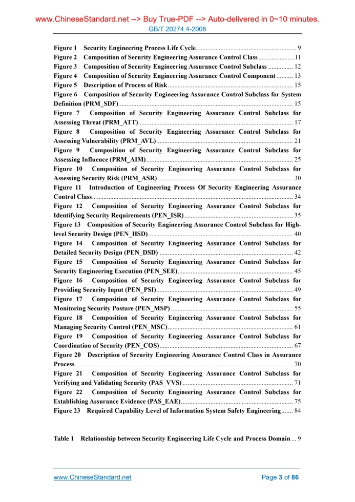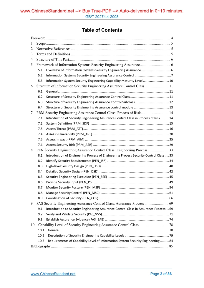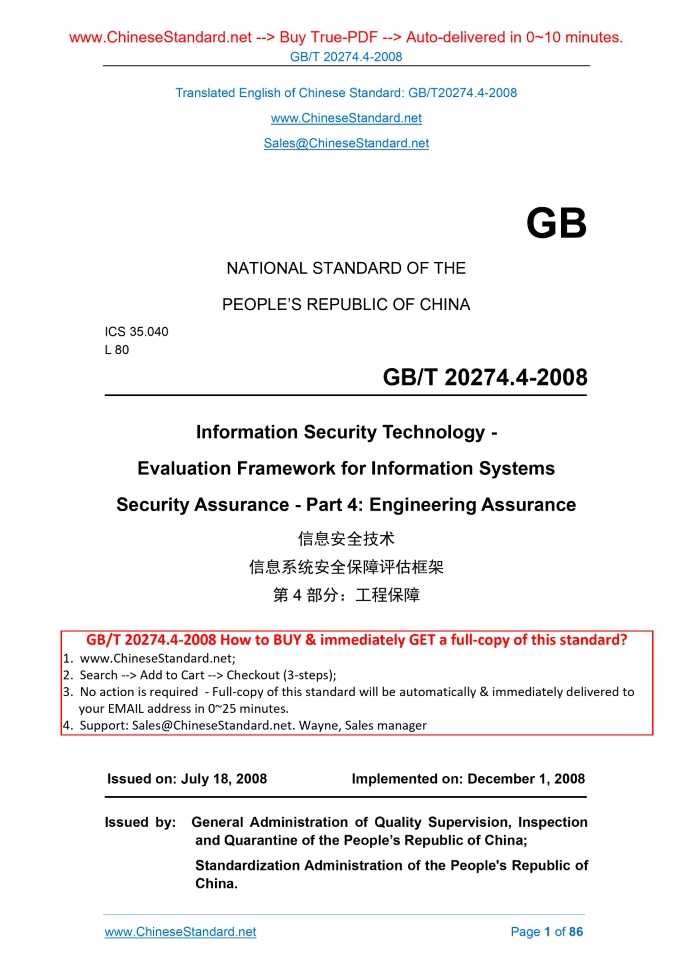 Similar standardsGB/T 20274.4-2008: Information security technology -- Evaluation framework for information systems security assurance -- Part 4: Engineering assurance---This is an excerpt. Full copy of true-PDF in English version (including equations, symbols, images, flow-chart, tables, and figures etc.), auto-downloaded/delivered in 9 seconds, can be purchased online: https://www.ChineseStandard.net/PDF.aspx/GBT20274.4-2008 GB NATIONAL STANDARD OF THE PEOPLE’S REPUBLIC OF CHINA ICS 35.040 L 80 Information Security Technology - Evaluation Framework for Information Systems Security Assurance - Part 4.Engineering Assurance Issued on. JULY 18, 2008 Implemented on. DECEMBER 1, 2008 Issued by. General Administration of Quality Supervision, Inspection and Quarantine of the People’s Republic of China; Standardization Administration of the People's Republic of China. Table of ContentsForeword... 4 1 Scope... 5 2 Normative References... 5 3 Terms and Definitions... 5 4 Structure of This Part... 6 5 Framework of Information Systems Security Engineering Assurance... 6 6 Structure of Information Security Engineering Assurance Control Class... 11 7 PRM Security Engineering Assurance Control Class. Process of Risk... 14 8 PEN Security Engineering Assurance Control Class. Engineering Process... 33 9 PAS Security Engineering Assurance Control Class. Assurance Process... 69 10 Capability Level of Security Engineering Assurance Control Class... 78 Bibliography... 85ForewordGB/T 20274 "Information Security Technology - Evaluation Framework for Information Systems Security Assurance" is divided into the flowing four parts. - Part 1.Introduction and General Model - Part 2.Technical Assurance - Part 3.Management Assurance - Part 4.Engineering Assurance This Part is Part 4 of GB/T 20274. This Part was proposed by and shall be under the jurisdiction of the National Technical Committee on Information Technology Security of Standardization Administration of China. Drafting organization of this Part. China Information Technology Security Certification Center. Chief drafters of this Part. Wu Shizhong, Wang Haisheng, Chen Xiaohua, Wang Guisi, Li Shoupeng, Jiang Changqing, Peng Yong, Zhang Li, Yao Yizhan, Ban Xiaofang, Li Jing, Wang Qing, Zou Qi, Qian Weiming, Jiang Diansheng, Lu Li, Sun Chenghao, Men Xuesong, Du Yuge and Yang Zaishan. Information Security Technology - Evaluation Framework for Information Systems Security Assurance - Part 4.Engineering Assurance1 ScopeThis Part of GB/T 20274 establishes the framework for information system security engineering assurance and the guide & general principle for the organization starting, implementing, maintaining, evaluating and improving information security engineering. This Part defines and explains the security engineering capability level that reflects the information security engineering assurance capability of the organization in the information system security engineering assurance work, and provides the security engineering assurance control class requirements of the organization's information security engineering assurance contents. This Part of GB/T 20274 is applicable to the organization for starting, implementing, maintaining, evaluating and improving the information security engineering; and all the users, developers and evaluation personnel who are involved in the information system security engineering.2 Normative ReferencesThe following documents contain provisions which, through reference in this text, constitute the provisions of this Part. For dated reference, the subsequent amendments (excluding corrigendum) or revisions of these publications do not apply. However, the parties who enter into an agreement based on this Standard are encouraged to investigate the possibility of applying the most recent editions of the standards indicated below. For any undated references, the latest edition of the document referred to applies. GB/T 20274.1 Information Security Technology - Evaluation Framework for Information Systems Security Assurance - Part 1.Introduction and General Model3 Terms and DefinitionsFor the purposes of this Part of GB/T 20274, the terms and definitions specified in GB/T 20274.1 and the following ones apply. 3.1.1 Validation The solution that meets the user's operation security requirements.4 Structure of This PartThe organization structure of this Part of GB/T 20274 is as follows.5 Framework of Information Systems Security Engineering Assurance5.1 Overview of Information Systems Security Engineering Assurance Part 1 of this Standard puts forward the information security assurance model (refer to Figure 3 in Part 1 of this Standard) and describes the relationship among assurance elements (technology, engineering, management and personnel), security features and life cycle of information system security therein. 5.2 Information Systems Security Engineering Assurance Control 5.2.1 Information systems security engineering assurance control class This Part divides information system security engineering into three basic process domains (i.e. information system security engineering assurance control class). risk, engineering and assurance. Although these domains are interdependent, they may be considered separately. In the simplest level, risk process identifies and ranks in the order of priority the inherent risk of the developed product or system. Security engineering process determines and implements the solution to the problems caused by risks by acting together with other engineering disciplines. Finally, assurance process establishes confidence for security solution and transfers such confidence to the users. 5.2.3 Corresponding relationship between security engineering life cycle and process domain The relationship between security engineering life cycle and process domain is shown in Table 1. 5.3 Information System Security Engineering Capability Maturity Level In the engineering process modules, the process domain involved in info