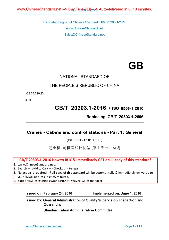 GB/T 20303.1-2016: Cranes -- Cabins and control stations -- Part 1: General Delivery: 9 seconds. True-PDF full-copy in English & invoice will be downloaded + auto-delivered via email. See step-by-step procedure Status: Valid GB/T 20303.1: Historical versions