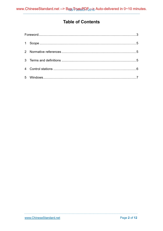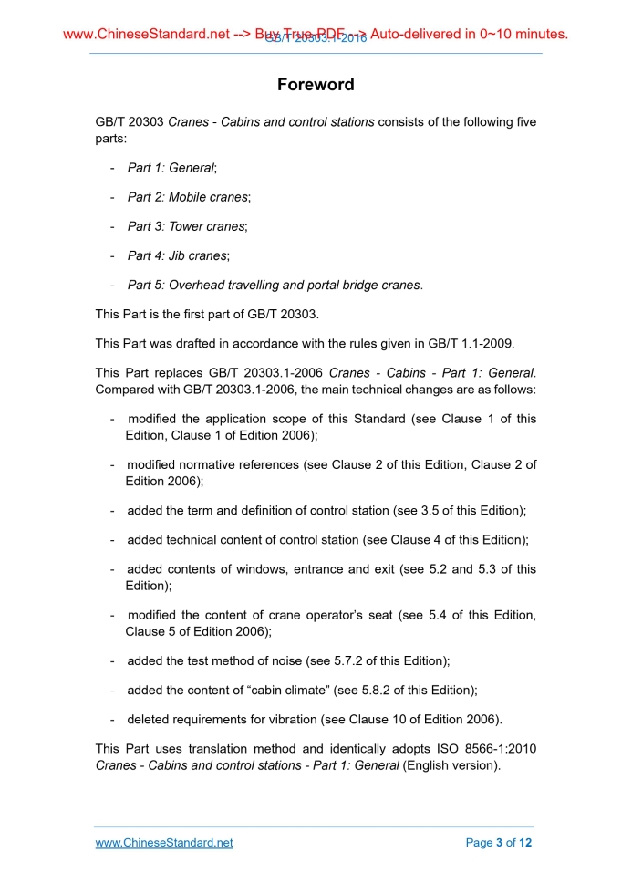 Similar standardsGB/T 20303.1-2016: Cranes -- Cabins and control stations -- Part 1: General---This is an excerpt. Full copy of true-PDF in English version (including equations, symbols, images, flow-chart, tables, and figures etc.), auto-downloaded/delivered in 9 seconds, can be purchased online: https://www.ChineseStandard.net/PDF.aspx/GBT20303.1-2016GB NATIONAL STANDARD OF THE PEOPLE’S REPUBLIC OF CHINA ICS 53.020.20 J 80 GB/T 20303.1-2016 / ISO 8566-1.2010 Replacing GB/T 20303.1-2006 Cranes - Cabins and control stations - Part 1. General (ISO 8566-1.2010, IDT) Issued on: FEBRUARY 24, 2016 Implemented on: JUNE 1, 2016 Issued by. General Administration of Quality Supervision, Inspection and Quarantine; Standardization Administration Committee. Table of ContentsForeword ... 3 1 Scope ... 5 2 Normative references ... 5 3 Terms and definitions ... 5 4 Control stations ... 6 5 Windows ... 7ForewordGB/T 20303 Cranes - Cabins and control stations consists of the following five parts. - Part 1. General; - Part 2. Mobile cranes; - Part 3. Tower cranes; - Part 4. Jib cranes; - Part 5. Overhead travelling and portal bridge cranes. This Part is the first part of GB/T 20303. This Part was drafted in accordance with the rules given in GB/T 1.1-2009. This Part replaces GB/T 20303.1-2006 Cranes - Cabins - Part 1. General. Compared with GB/T 20303.1-2006, the main technical changes are as follows. - modified the application scope of this Standard (see Clause 1 of this Edition, Clause 1 of Edition 2006); - modified normative references (see Clause 2 of this Edition, Clause 2 of Edition 2006); - added the term and definition of control station (see 3.5 of this Edition); - added technical content of control station (see Clause 4 of this Edition); - added contents of windows, entrance and exit (see 5.2 and 5.3 of this Edition); - modified the content of crane operator’s seat (see 5.4 of this Edition, Clause 5 of Edition 2006); - added the test method of noise (see 5.7.2 of this Edition); - added the content of “cabin climate” (see 5.8.2 of this Edition); - deleted requirements for vibration (see Clause 10 of Edition 2006). This Part uses translation method and identically adopts ISO 8566-1.2010 Cranes - Cabins and control stations - Part 1. General (English version). The Chinese documents which have consistency with the international normative references in this Part are as follows. GB 5226.2-2002 Safety of Machinery - Electrical Equipment of Machines - Part 32. Requirements for Hoisting Machines (idt IEC 60204-32.1998) GB/T 6974.1-2008 Cranes - Vocabulary - Part 1. General (ISO 4306-1.2007, IDT) GB/T 8591-2000 Earth-moving machinery - Seat index point (eqv ISO 5353.1995) GB/T 17248.2-1999 Acoustics--Noise emitted by machinery and equipment- -Measurement of emission sound pressure levels at a work station and at other specified positions--Engineering method in an essentially free field over a reflecting plane (eqv ISO 11201.1995) GB/T 20953-2007 Tractors and machinery for agriculture and forestry - Determination of burning behavior of cab interior materials (ISO 3795.1989, MOD) GB/T 24817.1-2009 Lifting appliances - Controls - Layout and characteristics - Part 1. General principles (ISO 7752-1.1983, IDT) GB/T 25624-2010 Earth-moving machinery - Operators seat - Dimensions and requirements (ISO 11112.1995, IDT) This Part was proposed by China Machinery Industry Federation. This Part shall be under the jurisdiction of National Technical Committee on Hoisting Machinery of Standardization Administration of China (SAC/TC 227). Main drafting organizations of this Part. Zhejiang Sankang Lifting Electric Appliance Co., Ltd., Beijing Hoisting and Transportation Machinery Design & Research Institute. The drafting organizations of this Part. Wuqiao Heavy Industry Group Co., Ltd., Ningbo Hugo Heavy Industry Co., Ltd., Yang Ge Technology Co., Ltd., Guangxi Construction Engineering Group Construction Machinery Manufacturing Co., Ltd., Zhejiang Jianhuan Electric Switch Co., Ltd., Tianjin Port (Group) Company Limited, Anhui Duojie Electric Co., Ltd. Main drafters of this Part. Han Yumen, Lin Fukui, Ren Jixin, Zhao Xueming, Lin Yong, Yang Xianghai, Yan Deshun. Version of standard substituted by this Standard is. - GB/T 20303.1-2006. Cranes - Cabins and control stations - Part 1. General1 ScopeThis Part of GB/T 20303 specifies the general requirements for cabins and control stations from which cranes, as defined in ISO 4306-1, are operated. It takes the conditions of use of the cabin into consideration.2 Normative referencesThe following referenced documents are indispensable for the application of this document. For dated references, only the edition cited applies. For undated references, the latest edition of the referenced document (including any amendments) applies. ISO 3795, Road vehicles, and tractors and machinery for agriculture and forestry - Determination of burning behaviour of interior materials ISO 4306-1, Cranes - Vocabulary - Part 1. General ISO 5353.1995, Earth-moving machinery, and tractors and machinery for agriculture and forestry - Seat index point ISO 7752-1, Cranes - Controls - Layout and characteristics - Part 1. General principles ISO 11112, Earth-moving machinery - Operator’s seat - Dimensions and requirements ISO 11201, Acoustics - Noise emitted by machinery and equipment - Measurement of emission sound pressure levels at a work station and at other specified positions - Engineering method in an essentially free field over a reflecting plane IEC 60204-32.2008, Safety of machinery - Electrical equipment of machines - Part 32. Requirements for hoisting machines3 Terms and definitionsFor the purposes of this document, the following terms and definitions apply. 3.1 crane cabin space in a crane or in its immediate vicinity which is specially designed, built ......Source: Above contents are excerpted from the full-copy PDF -- translated/reviewed by: www.ChineseStandard.net / Wayne Zheng et al.