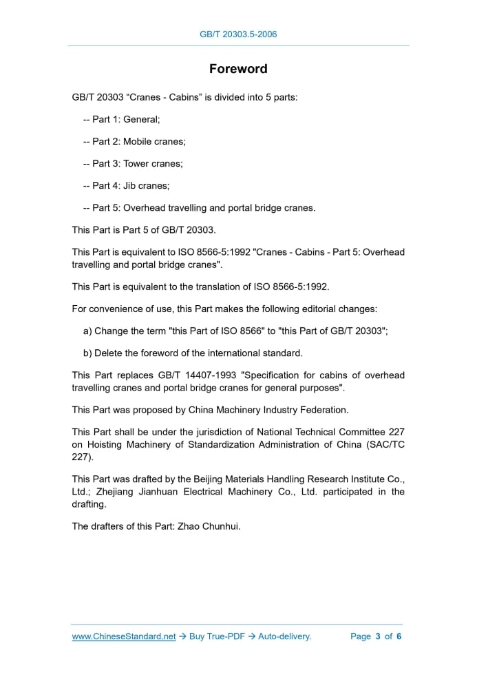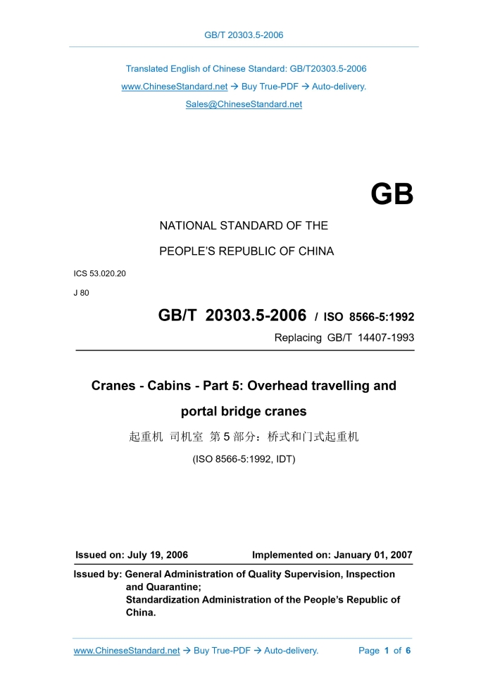Similar standardsGB/T 20303.5-2006: Cranes -- Cabins -- Part 5: Overhead travelling and portal bridge cranes---This is an excerpt. Full copy of true-PDF in English version (including equations, symbols, images, flow-chart, tables, and figures etc.), auto-downloaded/delivered in 9 seconds, can be purchased online: https://www.ChineseStandard.net/PDF.aspx/GBT20303.5-2006GB NATIONAL STANDARD OF THE PEOPLE’S REPUBLIC OF CHINA ICS 53.020.20 J 80 GB/T 20303.5-2006 / ISO 8566-5.1992 Replacing GB/T 14407-1993 Cranes - Cabins - Part 5.Overhead travelling and portal bridge cranes (ISO 8566-5.1992, IDT) Issued on: JULY 19, 2006 Implemented on: JANUARY 01, 2007 Issued by. General Administration of Quality Supervision, Inspection and Quarantine; Standardization Administration of the People’s Republic of China. Table of ContentsForeword... 3 1 Scope... 4 2 Normative references... 4 3 Cabin structure... 4 4 Driver seat... 5 5 Control elements... 5 6 Heating and cooling... 5ForewordGB/T 20303 “Cranes - Cabins” is divided into 5 parts. -- Part 1.General; -- Part 2.Mobile cranes; -- Part 3.Tower cranes; -- Part 4.Jib cranes; -- Part 5.Overhead travelling and portal bridge cranes. This Part is Part 5 of GB/T 20303. This Part is equivalent to ISO 8566-5.1992 "Cranes - Cabins - Part 5.Overhead travelling and portal bridge cranes". This Part is equivalent to the translation of ISO 8566-5.1992. For convenience of use, this Part makes the following editorial changes. a) Change the term "this Part of ISO 8566" to "this Part of GB/T 20303"; b) Delete the foreword of the international standard. This Part replaces GB/T 14407-1993 "Specification for cabins of overhead travelling cranes and portal bridge cranes for general purposes". This Part was proposed by China Machinery Industry Federation. This Part shall be under the jurisdiction of National Technical Committee 227 on Hoisting Machinery of Standardization Administration of China (SAC/TC 227). This Part was drafted by the Beijing Materials Handling Research Institute Co., Ltd.; Zhejiang Jianhuan Electrical Machinery Co., Ltd. participated in the drafting. The drafters of this Part. Zhao Chunhui. Cranes - Cabins - Part 5.Overhead travelling and portal bridge cranes1 ScopeThis Part of GB/T 20303 specifies the requirements for overhead travelling and portal bridge cranes that are defined in ISO 4306-1.2 Normative referencesThe terms in the following documents become the terms of this Part by reference to this Part of GB/T 20303.For dated references, all subsequent amendments (not including errata content) or revisions do not apply to this Part. However, parties to agreements that are based on this Part are encouraged to study whether the latest versions of these documents can be used. For undated references, the latest edition (including all amendments) applies to this document. GB/T 20303.1-2006, Cranes - Cabins - Part 1.General (ISO 8566-1.1992, IDT) ISO 4306-1.1991, Cranes - Vocabulary - Part 1.General ISO 7752-1.1983, Lifting appliances - Controls - Layout and characteristics - Part 1.General principles ISO 7752-5.1985, Lifting appliances - Controls - Layout and characteristics - Part 5.Overhead travelling cranes and portal bridge cranes3 Cabin structure3.1 The general requirements of the cabin structure that is specified by GB/T 20303.1 are applicable in this Part. 3.2 The cabin size that is specified in Figure 1 is the minimum value; a larger value can be used in practical applications. Through the seat index point (SIP), the clear height shall not be less than 1 600 mm; the clear width shall not be less than 900 mm; the clear depth shall not be less than 1 300 mm (see Figure 1). ......Source: Above contents are excerpted from the full-copy PDF -- translated/reviewed by: www.ChineseStandard.net / Wayne Zheng et al. |