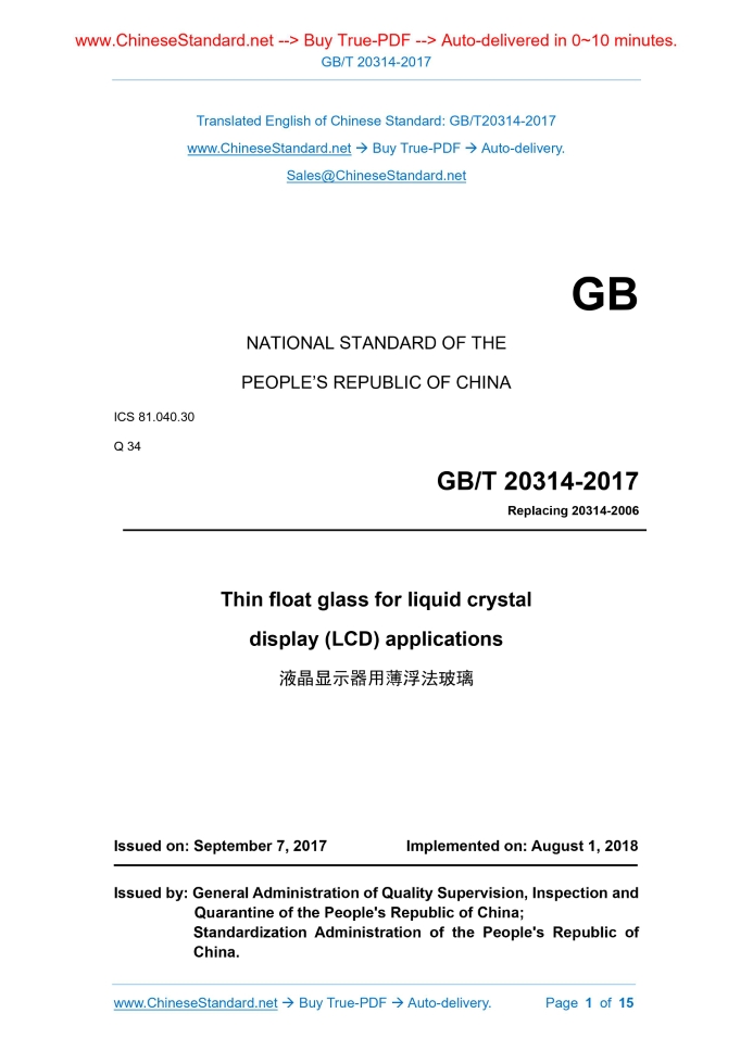 GB/T 20314-2017: Thin float glass for liquid crystal display (LCD) applications Delivery: 9 seconds. True-PDF full-copy in English & invoice will be downloaded + auto-delivered via email. See step-by-step procedure Status: Valid GB/T 20314: Historical versions