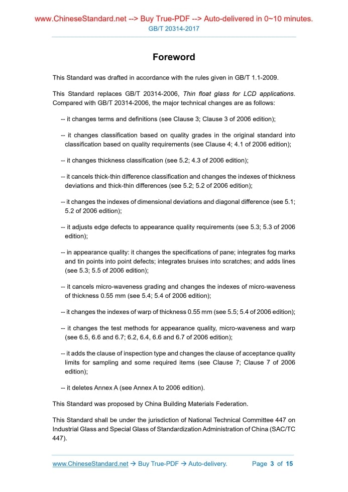 Similar standardsGB/T 20314-2017: Thin float glass for liquid crystal display (LCD) applications---This is an excerpt. Full copy of true-PDF in English version (including equations, symbols, images, flow-chart, tables, and figures etc.), auto-downloaded/delivered in 9 seconds, can be purchased online: https://www.ChineseStandard.net/PDF.aspx/GBT20314-2017GB NATIONAL STANDARD OF THE PEOPLE’S REPUBLIC OF CHINA ICS 81.040.30 Q 34 Replacing 20314-2006 Thin float glass for liquid crystal display (LCD) applications Issued on: SEPTEMBER 7, 2017 Implemented on: AUGUST 1, 2018 Issued by. General Administration of Quality Supervision, Inspection and Quarantine of the People's Republic of China; Standardization Administration of the People's Republic of China. Table of ContentsForeword ... 3 1 Scope ... 5 2 Normative references ... 5 3 Terms and definitions ... 6 4 Classification ... 6 5 Requirements... 7 6 Test methods ... 9 7 Inspection rules ... 11 8 Packaging, marking, transport and storage ... 14ForewordThis Standard was drafted in accordance with the rules given in GB/T 1.1-2009. This Standard replaces GB/T 20314-2006, Thin float glass for LCD applications. Compared with GB/T 20314-2006, the major technical changes are as follows. -- it changes terms and definitions (see Clause 3; Clause 3 of 2006 edition); -- it changes classification based on quality grades in the original standard into classification based on quality requirements (see Clause 4; 4.1 of 2006 edition); -- it changes thickness classification (see 5.2; 4.3 of 2006 edition); -- it cancels thick-thin difference classification and changes the indexes of thickness deviations and thick-thin differences (see 5.2; 5.2 of 2006 edition); -- it changes the indexes of dimensional deviations and diagonal difference (see 5.1; 5.2 of 2006 edition); -- it adjusts edge defects to appearance quality requirements (see 5.3; 5.3 of 2006 edition); -- in appearance quality. it changes the specifications of pane; integrates fog marks and tin points into point defects; integrates bruises into scratches; and adds lines (see 5.3; 5.5 of 2006 edition); -- it cancels micro-waveness grading and changes the indexes of micro-waveness of thickness 0.55 mm (see 5.4; 5.4 of 2006 edition); -- it changes the indexes of warp of thickness 0.55 mm (see 5.5; 5.4 of 2006 edition); -- it changes the test methods for appearance quality, micro-waveness and warp (see 6.5, 6.6 and 6.7; 6.2, 6.4, 6.6 and 6.7 of 2006 edition); -- it adds the clause of inspection type and changes the clause of acceptance quality limits for sampling and some required items (see Clause 7; Clause 7 of 2006 edition); -- it deletes Annex A (see Annex A to 2006 edition). This Standard was proposed by China Building Materials Federation. This Standard shall be under the jurisdiction of National Technical Committee 447 on Industrial Glass and Special Glass of Standardization Administration of China (SAC/TC 447). Thin float glass for liquid crystal display (LCD) applications1 ScopeThis Standard specifies the terms and definitions, classification, requirements, test methods, inspection rules, packaging, marking, transport and storage of thin float glass for liquid crystal display (LCD) applications. This Standard applies to soda-lime-silica thin float glass for TN-LCD and STN-LCD with the thickness not greater than 1.10 mm.2 Normative referencesThe following referenced documents are indispensable for the application of this document. For dated references, only the edition dated applies to this document. For undated references, the latest edition of the referenced documents (including all amendments) applies to this document. GB/T 1216, External micrometer GB/T 2680, Determination of light transmittance, solar direct transmittance, total solar energy transmittance and ultraviolet transmittance for glass in building and related glazing factors GB/T 2828.1-2012, Sampling procedures for inspection by attributes – Part 1. Sampling schemes indexed by acceptance quality limit (AQL) for lot-by-lot inspection GB/T 8170, Rules of rounding off for numerical values and expression and judgement of limiting values GB/T 9056, Metal ruler GB 11614-2009, Flat glass GB/T 15764, Standard terminology of flat glass GB/T 18680-2002, The transparent conductive glass with indium-tin oxide films used in liquid crystal display JB/T 2369, Reading microscope SJ/T 10793, Terms for glass used in electronic applications3 Terms and definitionsFor the purposes of this document, the following terms and definitions apply, in addition to those defined in GB 11614-2009, GB/T 15764, GB/T 18680-2002 and SJ/T 10793. 3.1 TN-LCD Liquid crystal display of the twisted nematic type. 3.2 STN-LCD Liquid crystal display of the super-twisted nematic type. 3.3 edge defects Cracks, bulges, missing parts, etc. of glass pane, including chips, edge irregularities, missing angles and so on. 3.4 micro-waveness Degree of tiny unevenness of glass pane. 3.5 warp Misfit between glass surface and reference plane, which is expressed as degree of warp.4 ClassificationClassified into grades A and B in accordance with the quality requirements. Light transmittance of thin float glass for LCD applications shall not be less than 91%.6 Test methods6.1 Dimensional deviation As specified in 6.1 of GB 11614-2009. 6.2 Diagonal difference Measure the length of two diagonal lines as specified in 6.2 of GB 11614-2009. The percentage of the difference of diagonal line lengths to the average length of diagonal lines is the diagonal difference. 6.3 Thickness deviation Use an external micrometer of division value 0.001 mm as specified in GB/T 1216 to measure 5 points in the direction perpendicular to the stretching direction of glass pane, including one point inwards about 15 mm from the edge respectively and three points equally dividing the distance between the two points. Round the measure values off to the third decimal place. The difference between actual value and nomina