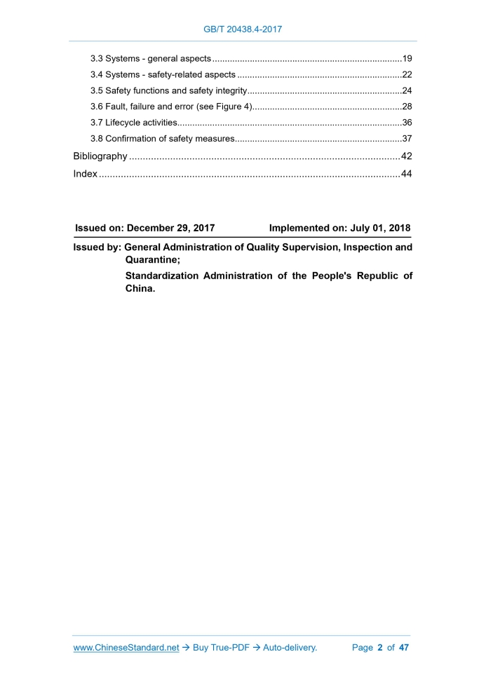 Similar standardsGB/T 20438.4-2017: Functional safety of electrical/electronic/programmable electronic safety-related systems -- Part 4: Definitions and abbreviations---This is an excerpt. Full copy of true-PDF in English version (including equations, symbols, images, flow-chart, tables, and figures etc.), auto-downloaded/delivered in 9 seconds, can be purchased online: https://www.ChineseStandard.net/PDF.aspx/GBT20438.4-2017 GB NATIONAL STANDARD OF THE PEOPLE’S REPUBLIC OF CHINA ICS 25.040 N 10 GB/T 20438.4-2017 / IEC 61508-4:2010 Replacing GB/T 20438.4-2006 Functional safety of electrical / electronic / programmable electronic safety-related systems - Part 4: Definitions and abbreviations (IEC 61508-4:2010, IDT) Foreword ... 4 Introduction ... 6 1 Scope ... 9 2 Normative references ... 10 3 Definitions and abbreviations ... 11 3.1 Safety terms ... 12 3.2 Equipment and devices ... 14 3.3 Systems - general aspects ... 19 3.4 Systems - safety-related aspects ... 22 3.5 Safety functions and safety integrity ... 24 3.6 Fault, failure and error (see Figure 4) ... 28 3.7 Lifecycle activities... 36 3.8 Confirmation of safety measures ... 37 Bibliography ... 42 Index ... 44 ISSUED ON: DECEMBER 29, 2017 IMPLEMENTED ON: JULY 01, 2018 Issued by: General Administration of Quality Supervision, Inspection and Quarantine; Standardization Administration of the People's Republic of China. Table of ContentsForeword ... 4 Introduction ... 6 1 Scope ... 9 2 Normative references ... 10 3 Definitions and abbreviations ... 11 3.1 Safety terms ... 12 3.2 Equipment and devices ... 14 3.3 Systems - general aspects ... 19 3.4 Systems - safety-related aspects ... 22 3.5 Safety functions and safety integrity ... 24 3.6 Fault, failure and error (see Figure 4) ... 28 3.7 Lifecycle activities... 36 3.8 Confirmation of safety measures ... 37 Bibliography ... 42 Index ... 44ForewordGB/T 20438 "Functional safety of electrical/electronic/programmable electronic safety-related systems" consists of the following seven parts: - Part 1: General requirements; - Part 2: Requirements for electrical/electronic/programmable electronic safety-related systems; - Part 3: Software requirements; - Part 4: Definitions and abbreviations; - Part 5: Examples of methods for the determination of safety integrity levels; - Part 6: Guidelines on the application of GB/T 20438.2 and GB/T 20438.3; - Part 7: Overview of techniques and measures. This Part is Part 4 of GB/T 20438. This Part was drafted in accordance with the rules given in GB/T 1.1-2009. This Part replaces GB/T 20438.4-2006 "Functional safety of electrical/electronic/programmable electronic safety-related systems - Part 4: Definitions and abbreviations". Compared with GB/T 20438.4-2006, the main technical changes in this Part are as follows: - add the term and definition of "software on-line support tool" (see 3.2.10 and 3.2.11); - add the term and definition of "application specific integrated circuit" (see 3.2.15); - add the terms and definitions of "systematic safety integrity" and "systematic capability" (see 3.5.6 and 3.5.9); - add the terms and definitions of "no part failure" and "no effect failure" (see 3.6.13 and 3.6.14); - add the terms and definitions of "mean time to restoration" and "mean repair time" (see 3.6.21 and 3.6.22). This Part uses translation method to identically adopt IEC 61508-4:2010 "Functional safety of electrical/electronic/programmable electronic safety- related systems - Part 4: Definitions and abbreviations". Functional safety of electrical / electronic / programmable electronic safety-related systems - Part 4: Definitions and abbreviations1 Scope1.1 This Part of GB/T 20438 contains the definitions and explanation of terms that are used in GB/T 20438.1~GB/T 20438.7. 1.2 The definitions are grouped under general headings so that related terms can be understood within the context of each other. However, it should be noted that these headings are not intended to add meaning to the definitions. 1.3 GB/T 20438.1, GB/T 20438.2, GB/T 20438.3 and GB/T 20438.4 are basic safety publications, although this status does not apply in the context of low complexity E/E/PE safety-related systems (see 3.4.3 of GB/T 20438.4-2017). As basic safety publications, they are intended for use by technical committees in the preparation of standards in accordance with the principles contained in IEC Guide 104 and ISO/IEC Guide 51. GB/T 20438.1, GB/T 20438.2, GB/T 20438.3 and GB/T 20438.4 are also intended for use as stand-alone publications. The horizontal safety function of GB/T 20438 does not apply to medical equipment in compliance with the IEC 60601 series. 1.4 One of the responsibilities of a technical committee is, wherever applicable, to make use of basic safety publications in the preparation of its publications. In this context, the requirements, test methods or test conditions of this basic safety publication will not apply unless specifically referred to or included in the publications prepared by those technical committees. 1.5 Figure 1 shows the overall framework of the GB/T 20438 series and indicates the role that this Part plays in the achievement of functional safety for E/E/PE safety-related systems. ......Source: Above contents are excerpted from the full-copy PDF -- translated/reviewed by: www.ChineseStandard.net / Wayne Zheng et al. Tips & Frequently Asked Questions:Question 1: How long will the true-PDF of English version of GB/T 20438.4-2017 be delivered?Answer: The full copy PDF of English version of GB/T 20438.4-2017 can be downloaded in 9 seconds, and it will also be emailed to you in 9 seconds (double mechanisms to ensure the delivery reliably), with PDF-invoice.Question 2: Can I share the purchased PDF of GB/T 20438.4-2017_English with my colleagues?Answer: Yes. The purchased PDF of GB/T 20438.4-2017_English will be deemed to be sold to your employer/organization who actually paid for it, including your colleagues and your employer's intranet.Questio