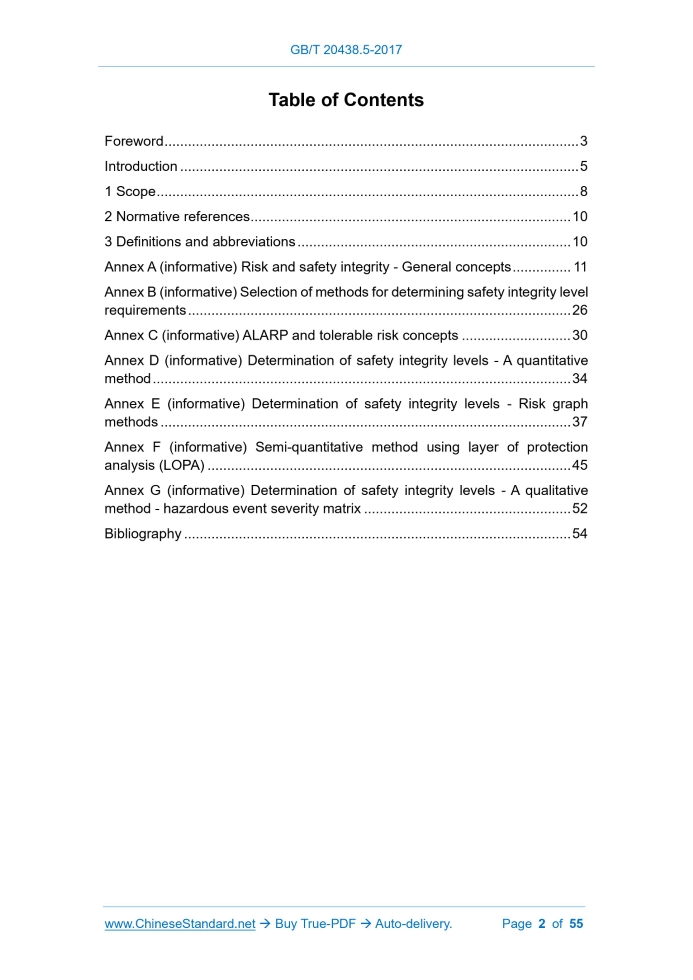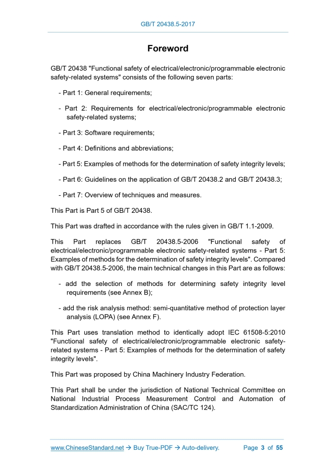 Similar standardsGB/T 20438.5-2017: Functional safety of electrical/electronic/programmable electronic safety-related systems -- Part 5: Examples of methods for the determination of safety integrity levels---This is an excerpt. Full copy of true-PDF in English version (including equations, symbols, images, flow-chart, tables, and figures etc.), auto-downloaded/delivered in 9 seconds, can be purchased online: https://www.ChineseStandard.net/PDF.aspx/GBT20438.5-2017 GB NATIONAL STANDARD OF THE PEOPLE’S REPUBLIC OF CHINA ICS 25.040 N 10 GB/T 20438.5-2017 / IEC 61508-5.2010 Replacing GB/T 20438.5-2006 Functional safety of electrical / electronic / programmable electronic safety-related systems - Part 5.Examples of methods for the determination of safety integrity levels (IEC 61508-5.2010, IDT) Issued on. DECEMBER 29, 2017 Implemented on. JULY 01, 2018 Issued by. General Administration of Quality Supervision, Inspection and Quarantine; Standardization Administration of the People's Republic of China. Table of ContentsForeword... 3 Introduction... 5 1 Scope... 8 2 Normative references... 10 3 Definitions and abbreviations... 10 Annex A (informative) Risk and safety integrity - General concepts... 11 Annex B (informative) Selection of methods for determining safety integrity level requirements... 26 Annex C (informative) ALARP and tolerable risk concepts... 30 Annex D (informative) Determination of safety integrity levels - A quantitative method... 34 Annex E (informative) Determination of safety integrity levels - Risk graph methods... 37 Annex F (informative) Semi-quantitative method using layer of protection analysis (LOPA)... 45 Annex G (informative) Determination of safety integrity levels - A qualitative method - hazardous event severity matrix... 52 Bibliography... 54ForewordGB/T 20438 "Functional safety of electrical/electronic/programmable electronic safety-related systems" consists of the following seven parts. - Part 1.General requirements; - Part 2.Requirements for electrical/electronic/programmable electronic safety-related systems; - Part 3.Software requirements; - Part 4.Definitions and abbreviations; - Part 5.Examples of methods for the determination of safety integrity levels; - Part 6.Guidelines on the application of GB/T 20438.2 and GB/T 20438.3; - Part 7.Overview of techniques and measures. This Part is Part 5 of GB/T 20438. This Part was drafted in accordance with the rules given in GB/T 1.1-2009. This Part replaces GB/T 20438.5-2006 "Functional safety of electrical/electronic/programmable electronic safety-related systems - Part 5. Examples of methods for the determination of safety integrity levels". Compared with GB/T 20438.5-2006, the main technical changes in this Part are as follows. - add the selection of methods for determining safety integrity level requirements (see Annex B); - add the risk analysis method. semi-quantitative method of protection layer analysis (LOPA) (see Annex F). This Part uses translation method to identically adopt IEC 61508-5.2010 "Functional safety of electrical/electronic/programmable electronic safety- related systems - Part 5.Examples of methods for the determination of safety integrity levels". This Part was proposed by China Machinery Industry Federation. This Part shall be under the jurisdiction of National Technical Committee on National Industrial Process Measurement Control and Automation of Standardization Administration of China (SAC/TC 124). The drafting organizations of this Part. Mechanical Industry Instrument and Meter Comprehensive Technology and Economic Research Institute, Beijing Guodian Zhishen Control Technology Co., Ltd., Hangzhou Hollysys Automation Co., Ltd., Beijing Labor Protection Science Research Institute, Risk Control (Beijing) Engineering Technology Co., Ltd., Beijing United Puken Engineering Technology Co., Ltd., Shanghai Zhonghu Electronics Co., Ltd., Siemens (China) Co., Ltd. Main drafters of this Part. Shi Xueling, Xiong Wenze, Jin Jianghong, Chen Yong, Yang Liu, Xiao Songqing, Zhou Youzheng, Mei Hao, Huang Jinsong, Lu Yi, Feng Xiaosheng, Luo An, Gu Zheng, Li Jia, Tian Yucong, Zuo Xin, Jiang Xuelian, Bai Yan. Version of standard substituted by this Part is. - GB/T 20438.5-2006.1 ScopeOne of the responsibilities of a technical committee is, wherever applicable, to make use of basic safety publications in the preparation of its publications. In this context, the requirements, test methods or test conditions of this basic safety publication will not apply unless specifically referred to or included in the publications prepared by those technical committees.2 Normative referencesThe following referenced documents are indispensable for the application of this document. For dated references, only the edition cited applies. For undated references, the latest edition of the referenced document (including any amendments) applies. GB/T 20438.1-2017, Functional safety of electrical/electronic/programmable electronic safety-related systems - Part 1.General requirements (IEC 61508- 1.2010, IDT)3 Definitions and abbreviationsFor the purposes of this document, the definitions and abbreviations given in GB/T 20438.4-2017 apply.Annex A(informative) Risk and safety integrity - General concepts This annex provides information on the underlying concepts of risk and the relationship of risk to safety integrity.Annex B(informative) Selection of methods for determining safety integrity level requirements This annex lists a number of techniques that can be used for determination of safety integrity levels. None of the methods are suitable for all applications and users will need to select the most suitable. In selecting the most appropriate method consideration should be given to the following factors.Annex C(informative) ALARP and tolerable risk concepts This annex considers one particular approach to the achievement of a tolerable risk. The intention is not to provide a definitive account of the method but rather an illustrati
