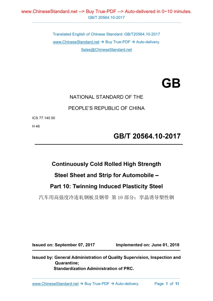 GB/T 20564.10-2017: Continuously Cold Rolled High Strength Steel Sheet and Strip for Automobile - Part 10: Twinning Induced Plasticity Steel Delivery: 9 seconds. True-PDF full-copy in English & invoice will be downloaded + auto-delivered via email. See step-by-step procedure Status: Valid
