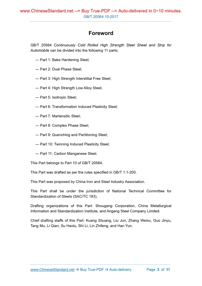 Similar standardsGB/T 20564.10-2017: Continuously Cold Rolled High Strength Steel Sheet and Strip for Automobile - Part 10: Twinning Induced Plasticity Steel---This is an excerpt. Full copy of true-PDF in English version (including equations, symbols, images, flow-chart, tables, and figures etc.), auto-downloaded/delivered in 9 seconds, can be purchased online: https://www.ChineseStandard.net/PDF.aspx/GBT20564.10-2017 GB NATIONAL STANDARD OF THE PEOPLE’S REPUBLIC OF CHINA ICS 77.140.50 H 46 Continuously Cold Rolled High Strength Steel Sheet and Strip for Automobile – Part 10. Twinning Induced Plasticity Steel Issued on: SEPTEMBER 07, 2017 Implemented on: JUNE 01, 2018 Issued by. General Administration of Quality Supervision, Inspection and Quarantine; Standardization Administration of PRC. Table of ContentsForeword ... 3 1 Scope ... 4 2 Normative References ... 4 3 Terms and Definitions ... 6 4 Classification and Grade Expression Method ... 6 5 Ordering Content ... 7 6 Dimension, Shape, Weight ... 7 7 Technical Requirements ... 8 8 Test Method ... 9 9 Inspection Rules ... 10 10 Package, Mark and Quality Certificate ... 10 Appendix A (Informative) Chemical Compositions of Steel ... 11ForewordGB/T 20564 Continuously Cold Rolled High Strength Steel Sheet and Strip for Automobile can be divided into the following 11 parts. --- Part 1. Bake Hardening Steel; --- Part 2. Dual Phase Steel; --- Part 3. High Strength Interstitial Free Steel; --- Part 4. High Strength Low Alloy Steel; --- Part 5. Isotropic Steel; --- Part 6. Transformation Induced Plasticity Steel; --- Part 7. Martensitic Steel; --- Part 8. Complex Phase Steel; --- Part 9. Quenching and Partitioning Steel; --- Part 10. Twinning Induced Plasticity Steel; --- Part 11. Carbon Manganese Steel. This Part belongs to Part 10 of GB/T 20564. This Part was drafted as per the rules specified in GB/T 1.1-200. This Part was proposed by China Iron and Steel Industry Association. This Part shall be under the jurisdiction of National Technical Committee for Standardization of Steels (SAC/TC 183). Drafting organizations of this Part. Shougang Corporation, China Metallurgical Information and Standardization Institute, and Angang Steel Company Limited. Chief drafting staffs of this Part. Kuang Shuang, Liu Jun, Zhang Weixu, Guo Jinyu, Tang Mu, Li Qian, Su Haolu, Shi Li, Lin Zhifeng, and Han Yun. Continuously Cold Rolled High Strength Steel Sheet and Strip for Automobile – Part 10. Twinning Induced Plasticity Steel1 ScopeThis Part of GB/T 20564 specifies the terms and definitions, classification and grade expression method, ordering content, dimension, shape, weight, technical requirements, test methods, inspection rules, package, mark and quality certificate of continuously cold rolled twinning induced plasticity high strength steel sheet and strip. This Part is applicable to steel sheet and strip (hereinafter referred to as “steel sheet and strip”) manufactured automotive complex structural parts, reinforcements, etc., with the thickness of 0.50mm~3.00mm.2 Normative ReferencesThe following documents are essential to the application of this document. For the dated documents, only the versions with the dates indicated are applicable to this document; for the undated documents, only the latest version (including all the amendments) are applicable to this document. GB/T 223.4 Alloyed Steel - Determination of Manganese Content - Potentiometric or Visual Titration Method GB/T 223.5 Steel and Iron – Determination of Acid-Soluble Silicon and Total Silicon Content - Reduced Molybdosilicate Spectrophotometric Method GB/T 223.9 Iron Steel and Alloy - Determination of Aluminum Content - Chrom Azurol S Photometric Method GB/T 223.59 Iron, Steel and Alloy - Determination of Phosphorus Content - Bismuth Phosphomolybdate Blue Spectrophotometric Method and Antimony Phosphomolybdate Blue Spectrophotometric Method GB/T 223.60 Methods for Chemical Analysis of Iron, Steel and Alloy - The Perchloric Acid Dehydration Gravimetric Method for the Determination of Silicon Content GB/T 223.68 Methods for Chemical Analysis of Iron, Steel and Alloy - The Potassium Iodate Titration Method after Combustion in the Pipe Furnace for the Determination of Sulfur Content GB/T 223.71 Methods for Chemical Analysis of Iron, Steel and Alloy the Gravimetric Method after Combustion in the Pipe Furnace for the Determination of Carbon Content GB/T 223.79 Iron and Steel - Determination of Multi-Element Contents - X-Ray Fluorescence Spectrometry GB/T 228.1-2010 Metallic Materials - Tensile Testing - Part 1. Method of Test at Room Temperature GB/T 247 General Rule of Package, Mark and Certification for Steel Plates (Sheets) and Strips GB/T 708 Dimension, Shape, Weight, and Tolerance for Cold-Rolled Steel Plate and Strip GB/T 2523 Measuring Method of Surface Roughness and Peak Count for Cold- Rolled Metal Sheet (Strip) GB/T 2975 Steel and Steel Products - Location and Preparation of Test Pieces for Mechanical Testing GB/T 4336 Carbon and Low-Alloy Steel - Determination of Multi-Element Contents -Spark Discharge Atomic Emission Spectrometric Method (Routine Method) GB/T 8170 Rules of Rounding Off for Numerical Values & Expression and Judgement of Limiting Values GB/T 17505 Steel and Steel Products General Technical Delivery Requirements GB/T 20066 Steel and Iron-Sampling and Preparation of Samples for the Determination of Chemical Composition GB/T 20123 Steel and Iron – Determination of Total Carbon and Sulfur Content Infrared Absorption Method after Combustion in an Induction Furnace (Routine Method) GB/T 20125 Low-Alloy Steel - Determination of Multi-Element Contents - Inductively Coupled Plasma Atomic Emission Spectrometric Method GB/T 20126 Unalloyed Steel - Determination of Low Carbon Content - Part 2. Infrared Absorption Method after Combustion in an Induction Furnace (with Preheating) 400/950 – specified minimum yield strength value/specified minimum tensile strength value, in 