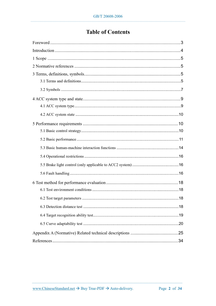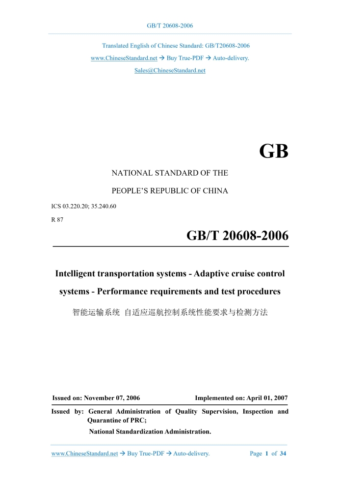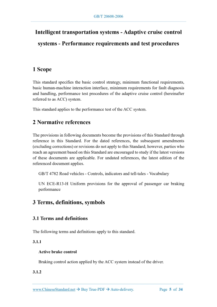 Similar standardsGB/T 20608-2006: Intelligent transportation systems -- Adaptive cruise control systems -- Performance requirements and test procedures---This is an excerpt. Full copy of true-PDF in English version (including equations, symbols, images, flow-chart, tables, and figures etc.), auto-downloaded/delivered in 9 seconds, can be purchased online: https://www.ChineseStandard.net/PDF.aspx/GBT20608-2006 GB NATIONAL STANDARD OF THE PEOPLE’S REPUBLIC OF CHINA ICS 03.220.20; 35.240.60 R 87 Intelligent transportation systems - Adaptive cruise control systems - Performance requirements and test procedures Issued on: NOVEMBER 07, 2006 Implemented on: APRIL 01, 2007 Issued by. General Administration of Quality Supervision, Inspection and Quarantine of PRC; National Standardization Administration. Table of ContentsForeword... 3 Introduction... 4 1 Scope... 5 2 Normative references... 5 3 Terms, definitions, symbols... 5 3.1 Terms and definitions... 5 3.2 Symbols... 7 4 ACC system type and state... 9 4.1 ACC system type... 9 4.2 ACC system state... 10 5 Performance requirements... 10 5.1 Basic control strategy... 10 5.2 Basic performance... 11 5.3 Basic human-machine interaction functions... 14 5.4 Operational restrictions... 16 5.5 Brake light control (only applicable to ACC2 system)... 16 5.6 Fault handling... 16 6 Test method for performance evaluation... 18 6.1 Test environment conditions... 18 6.2 Test target parameters... 18 6.3 Detection distance test... 18 6.4 Target recognition ability test... 19 6.5 Curve adaptability test... 20 Appendix A (Normative) Related technical descriptions... 25 References... 34 Intelligent transportation systems - Adaptive cruise control systems - Performance requirements and test procedures1 ScopeThis standard specifies the basic control strategy, minimum functional requirements, basic human-machine interaction interface, minimum requirements for fault diagnosis and handling, performance test procedures of the adaptive cruise control (hereinafter referred to as ACC) system. This standard applies to the performance test of the ACC system.2 Normative referencesThe provisions in following documents become the provisions of this Standard through reference in this Standard. For the dated references, the subsequent amendments (excluding corrections) or revisions do not apply to this Standard; however, parties who reach an agreement based on this Standard are encouraged to study if the latest versions of these documents are applicable. For undated references, the latest edition of the referenced document applies. GB/T 4782 Road vehicles - Controls, indicators and tell-tales - Vocabulary UN ECE-R13-H Uniform provisions for the approval of passenger car braking performance3 Terms, definitions, symbols3.1 Terms and definitions The following terms and definitions apply to this standard. 3.1.1 Active brake control Braking control action applied by the ACC system instead of the driver. 3.1.2 - When ACC is in operation, the vehicle automatically controls the speed to maintain a certain time gap or a pre-set speed (whichever is lower) with the forward vehicle. The conversion between these two control modes can be automatically completed by the ACC system. - The time gap in a stable state can be adjusted automatically by the system or by the driver (see 5.3.1). - When the speed of the subject vehicle is lower than the minimum working speed vlow, the transition from "ACC waiting state" to "ACC working state" shall be prohibited. In addition, if the system is in "ACC working state" and the speed is lower than vlow, the automatic acceleration function shall be prohibited. At this time, the ACC system can automatically switch from "ACC working state" to "ACC waiting state" (see 5.3.2). - If there are multiple forward vehicles, the ACC system shall automatically choose to follow the closest forward vehicle in the lane (see 5.2.5.3). 5.2 Basic performance 5.2.1 Control mode The control mode (time gap control and vehicle speed control) shall be automatically switched. 5.2.2 Time gap τmin is the minimum available steady-state time gap, which can be applied to ACC control under various vehicle speeds v. τmin (v) shall be greater than or equal to 1 s; it shall provide at least one time gap τ in the range of 1.5 s ~ 2.2 s. 5.2.3 Subject vehicle speed The speed of the subject vehicle that can be controlled by the ACC system. 5.2.4 Stationary targets Response to stationary targets is not a function that the ACC system shall have. If the ACC system cannot respond to static targets, this shall be stated in the vehicle's user manual. 5.2.5 Tracking 5.2.5.1 Overview Under steady state, the ACC system shall comply with the minimum time gap critical value specified in 5.2.2. 5.3.1.5 The wheel locking time in the automatic braking state (applicable only to the ACC2 system) shall not exceed the ABS allowable value. The ACC system does not interfere with the ABS. 5.3.1.6 The wheel slip time caused by the engine power control of the ACC system shall not exceed the traction control system allowable value. The ACC system does not interfere with the traction control system. 5.3.1.7 The ACC system can appropriately adjust the time gap to adapt to changes in the driving environment (such as bad weather), but the adjusted time gap shall not be lower than the driver's setting value. 5.3.1.8 If the ACC system allows the driver to select the desired time gap, one of the following methods shall be adopted. a) If the ACC system still stores the most recently selected time gap value after being turned off (see Figure 3), then when the system is reactivated, the time gap value shall be displayed to the driver; b) If the ACC system does not store the most recently selected time gap value after being turned off (see Figure 3), then the time gap value shall be set to the default value (greater than or equal to 1.5 s). 5.3.1.9 If the vehicle is equipped with both the ACC system and the conventional crui