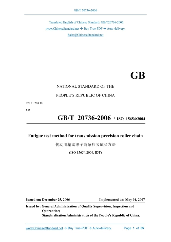 GB/T 20736-2006: Fatigue test method for transmission precision roller chain Delivery: 9 seconds. True-PDF full-copy in English & invoice will be downloaded + auto-delivered via email. See step-by-step procedure Status: Valid