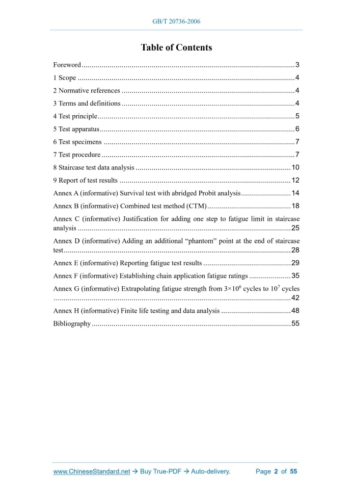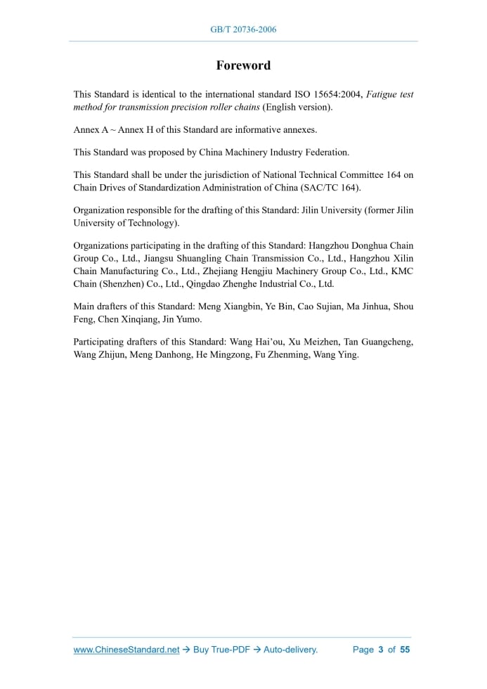 Similar standardsGB/T 20736-2006: Fatigue test method for transmission precision roller chain---This is an excerpt. Full copy of true-PDF in English version (including equations, symbols, images, flow-chart, tables, and figures etc.), auto-downloaded/delivered in 9 seconds, can be purchased online: https://www.ChineseStandard.net/PDF.aspx/GBT20736-2006GB NATIONAL STANDARD OF THE PEOPLE’S REPUBLIC OF CHINA ICS 21.220.30 J 18 GB/T 20736-2006 / ISO 15654.2004 Fatigue test method for transmission precision roller chain (ISO 15654.2004, IDT) Issued on. DECEMBER 25, 2006 Implemented on. MAY 01, 2007 Issued by. General Administration of Quality Supervision, Inspection and Quarantine; Standardization Administration of the People’s Republic of China. Table of ContentsForeword... 3 1 Scope... 4 2 Normative references... 4 3 Terms and definitions... 4 4 Test principle... 5 5 Test apparatus... 6 6 Test specimens... 7 7 Test procedure... 7 8 Staircase test data analysis... 10 9 Report of test results... 12 Annex A (informative) Survival test with abridged Probit analysis... 14 Annex B (informative) Combined test method (CTM)... 18 Annex C (informative) Justification for adding one step to fatigue limit in staircase analysis... 25 Annex D (informative) Adding an additional “phantom” point at the end of staircase test... 28 Annex E (informative) Reporting fatigue test results... 29 Annex F (informative) Establishing chain application fatigue ratings... 35 Annex G (informative) Extrapolating fatigue strength from 3×106 cycles to 107 cycles ... 42 Annex H (informative) Finite life testing and data analysis... 48 Bibliography... 55ForewordThis Standard is identical to the international standard ISO 15654.2004, Fatigue test method for transmission precision roller chains (English version). Annex A ~ Annex H of this Standard are informative annexes. This Standard was proposed by China Machinery Industry Federation. This Standard shall be under the jurisdiction of National Technical Committee 164 on Chain Drives of Standardization Administration of China (SAC/TC 164). Organization responsible for the drafting of this Standard. Jilin University (former Jilin University of Technology). Organizations participating in the drafting of this Standard. Hangzhou Donghua Chain Group Co., Ltd., Jiangsu Shuangling Chain Transmission Co., Ltd., Hangzhou Xilin Chain Manufacturing Co., Ltd., Zhejiang Hengjiu Machinery Group Co., Ltd., KMC Chain (Shenzhen) Co., Ltd., Qingdao Zhenghe Industrial Co., Ltd. Main drafters of this Standard. Meng Xiangbin, Ye Bin, Cao Sujian, Ma Jinhua, Shou Feng, Chen Xinqiang, Jin Yumo. Participating drafters of this Standard. Wang Hai’ou, Xu Meizhen, Tan Guangcheng, Wang Zhijun, Meng Danhong, He Mingzong, Fu Zhenming, Wang Ying. Fatigue test method for transmission precision roller chain1 ScopeThis Standard specifies an axial force fatigue test method for transmission roller chains, the tests being of the fluctuating tension type, carried out at room temperature in air, with the force applied along the longitudinal axis of the chain. It also specifies procedures for statistically analyzing the test results and gives formats and elements for presenting the results of fatigue tests and analyses.2 Normative referencesThe following referenced documents are indispensable for the application of this document. For dated references, all subsequent amendments (not including errata content) or revisions do not apply to this standard. However, parties to agreements that are based on this Standard are encouraged to study whether the latest versions of these documents can be used. For undated references, the latest edition applies to this Standard. GB/T 1243-2006, Short-pitch transmission precision roller and bush chains, attachments and associated chain sprockets (ISO 606.2004, IDT)3 Terms and definitionsSymbols, terms, definitions and units are given in Table 1 and Figure 1.4 Test principleFatigue tests are made on transmission roller chains to determine fatigue properties of chain plates such as those shown on Figure B.1 or to verify conformance to dynamic strength requirements in GB/T 1243 and GB/T 14212.5 Test apparatusThe test fixtures shall be capable of transmitting an axial force to the test piece without inducing a subsidiary force caused by the fixtures. Universal type fixtures shall be used for fatigue testing of transmission chains.6 Test specimensAt least 5 free pitches of chain shall be used as a fatigue test specimen, except for chain pitch over 50.8 mm where a minimum of 3 free pitches are acceptable. Free pitches are those chain pitches that do not contact the fixtures.7 Test procedureFor analyses of fatigue test data, maximum forces shall be corrected to zero minimum force. A test force is obtained by correcting the maximum force to zero minimum force by means of the Johnson–Goodman method [Equation (3)]. The Johnson–Goodman relationship is illustrated by Figure 3. A longitudinal tensile force shall be applied, sinusoidally varying between the minimum test force determined according to 7.1.1 and the maximum test force determined according to 7.1.2.The fatigue test shall continue to endurance or until the specimen fails without reaching the endurance.8 Staircase test data analysisIt is customary to tabulate and plot the data as a staircase test progresses to ensure that the rules for constructing a staircase are followed. An example of such a data plot (three levels and 95% confidence level) is shown in Table 3. The standard deviations of the staircase data shall be calculated using Equation (7). The fatigue limit of the staircase test shall be calculated using Equation (8).9 Report of test resultsThe originator shall provide to the user the following. The originator shall provide to the user the following.Annex A(informative) Survival test with abridged Probit analysis The purpose of the survival test with abridged Probit analysis is determine the mean fatigue limit and its