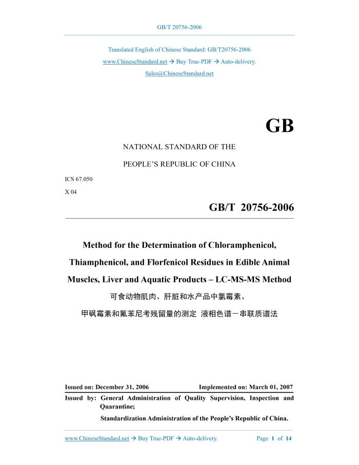 GB/T 20756-2006: Method for the determination of chloramphenicol, thiamphenicol, and florfenicol residues in edible animal muscles, liver and aquatic products - LC-MS-MS method Delivery: 9 seconds. True-PDF full-copy in English & invoice will be downloaded + auto-delivered via email. See step-by-step procedure Status: Valid