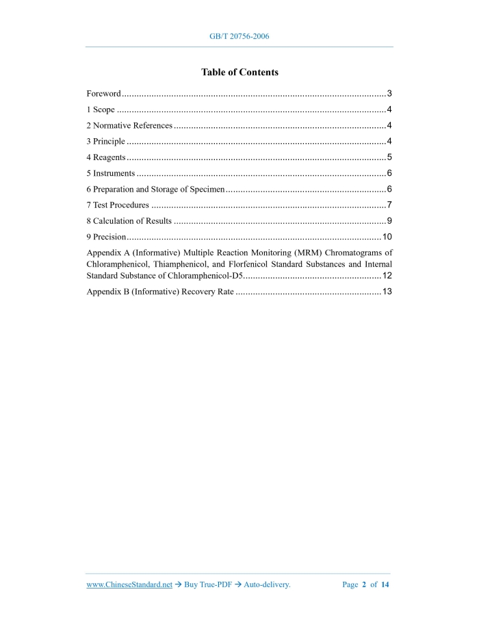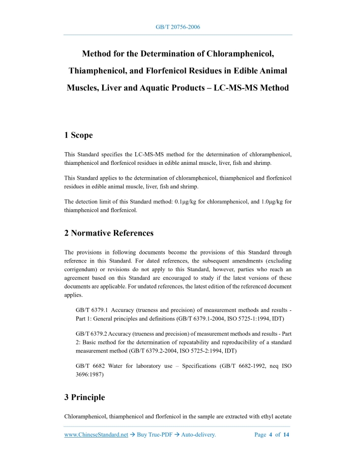 Similar standardsGB/T 20756-2006: Method for the determination of chloramphenicol, thiamphenicol, and florfenicol residues in edible animal muscles, liver and aquatic products - LC-MS-MS method---This is an excerpt. Full copy of true-PDF in English version (including equations, symbols, images, flow-chart, tables, and figures etc.), auto-downloaded/delivered in 9 seconds, can be purchased online: https://www.ChineseStandard.net/PDF.aspx/GBT20756-2006 GB NATIONAL STANDARD OF THE PEOPLE’S REPUBLIC OF CHINA ICS 67.050 X 04 Method for the Determination of Chloramphenicol, Thiamphenicol, and Florfenicol Residues in Edible Animal Muscles, Liver and Aquatic Products – LC-MS-MS Method ISSUED ON: DECEMBER 31, 2006 IMPLEMENTED ON: MARCH 01, 2007 Issued by: General Administration of Quality Supervision, Inspection and Quarantine; Standardization Administration of the People’s Republic of China. Table of ContentsForeword ... 3 1 Scope ... 4 2 Normative References ... 4 3 Principle ... 4 4 Reagents ... 5 5 Instruments ... 6 6 Preparation and Storage of Specimen ... 6 7 Test Procedures ... 7 8 Calculation of Results ... 9 9 Precision ... 10 Appendix A (Informative) Multiple Reaction Monitoring (MRM) Chromatograms of Chloramphenicol, Thiamphenicol, and Florfenicol Standard Substances and Internal Standard Substance of Chloramphenicol-D5 ... 12 Appendix B (Informative) Recovery Rate ... 13 Method for the Determination of Chloramphenicol, Thiamphenicol, and Florfenicol Residues in Edible Animal Muscles, Liver and Aquatic Products – LC-MS-MS Method1 ScopeThis Standard specifies the LC-MS-MS method for the determination of chloramphenicol, thiamphenicol and florfenicol residues in edible animal muscle, liver, fish and shrimp. This Standard applies to the determination of chloramphenicol, thiamphenicol and florfenicol residues in edible animal muscle, liver, fish and shrimp. The detection limit of this Standard method: 0.1μg/kg for chloramphenicol, and 1.0μg/kg for thiamphenicol and florfenicol.2 Normative ReferencesThe provisions in following documents become the provisions of this Standard through reference in this Standard. For dated references, the subsequent amendments (excluding corrigendum) or revisions do not apply to this Standard, however, parties who reach an agreement based on this Standard are encouraged to study if the latest versions of these documents are applicable. For undated references, the latest edition of the referenced document applies. GB/T 6379.1 Accuracy (trueness and precision) of measurement methods and results - Part 1: General principles and definitions (GB/T 6379.1-2004, ISO 5725-1:1994, IDT) GB/T 6379.2 Accuracy (trueness and precision) of measurement methods and results - Part 2: Basic method for the determination of repeatability and reproducibility of a standard measurement method (GB/T 6379.2-2004, ISO 5725-2:1994, IDT) GB/T 6682 Water for laboratory use – Specifications (GB/T 6682-1992, neq ISO 3696:1987)3 PrincipleChloramphenicol, thiamphenicol and florfenicol in the sample are extracted with ethyl acetate under alkaline conditions. After the extract was spun to dryness; the residue is dissolved in water and degreased by n-hexane liquid-liquid partitioning. Take liquid chromatography- tandem mass spectrometer for detection.4 ReagentsUnless otherwise specified, the used reagents are of analytically pure; and the water is the first- grade water specified in GB/T 6682. 4.1 Methanol: chromatographically pure. 4.2 Ethyl acetate 4.3 n-hexane. 4.4 Ammonium hydroxide: 25% ~ 28%. 4.5 Anhydrous sodium sulfate: burn at 650 °C for 4 h; and store in a desiccator for later-use. 4.6 Standard substances of chloramphenicol, thiamphenicol and florfenicol: with purity ≥99.5%. 4.7 Internal standard solution of Chloramphenicol D5: 100μg/mL. 4.8 Standard stock solution: 100μg/mL. Accurately weigh appropriate amounts of standard substances of chloramphenicol, thiamphenicol and florfenicol, respectively; and use methanol to make a standard stock solution of 100μg/mL. The solution can be stored at -18 °C and can be used for 1 year. 4.9 Mixed standard stock solution: 1μg/mL. Accurately pipette 1 mL of chloramphenicol, thiamphenicol and florfenicol standard stock solution (4.8) respectively into a 100 mL volumetric flask; and dilute to the mark with methanol. The solution can be stored at -18°C and can be used for 6 months. 4.10 Intermediate concentration mixed standard solution: 20ng/mL. Accurately pipette 1 mL of the mixed standard stock solution (4.9) in a 50 mL volumetric flask and dilute with water to the mark. The solution can be stored at 4°C and can be used for 3 months. 4.11 Internal standard stock solution: 1μg/mL. Accurately pipette 100μL of chloramphenicol- D5 (d5-chloramphenicol) standard solution (4.7) into a 10 mL volumetric flask; and dilute to the mark with methanol. The solution is stored at -18°C and can be used for 6 months. 4.12 Intermediate concentration internal standard solution: 20ng/mL. Accurately pipette 1 mL of internal standard stock solution (4.11) into a 50 mL volumetric flask; and dilute to the mark with water. The solution is stored the at 4°C and can be used for 3 months. 4.13 Matrix mixed standard working solution: according to the sensitivity of each standard and the linear range of the instrument, pipette a certain amount of intermediate concentration mixed standard solution (4.10) and intermediate concentration internal standard solution (4.12); and use the blank sample extract to prepare a series of matrix mixed standard working solutions; and the internal standard concentration is 0.3ng/mL. It shall be prepared in the same day. 4.14 Filter membrane: 0.2μm.5 Instruments5.1 Liquid chromatography-tandem mass spectrometer: equipped with an electrospray ion source. 5.2 Analytical balance: with sensitivity of 0.1 mg and 0.01 g. 5.3 Centrifuge: 4000 r/min. 5.4 High-speed desktop centrifuge: 13000 r/min. 5.5 Tissue masher. 5.6 Homogenize
