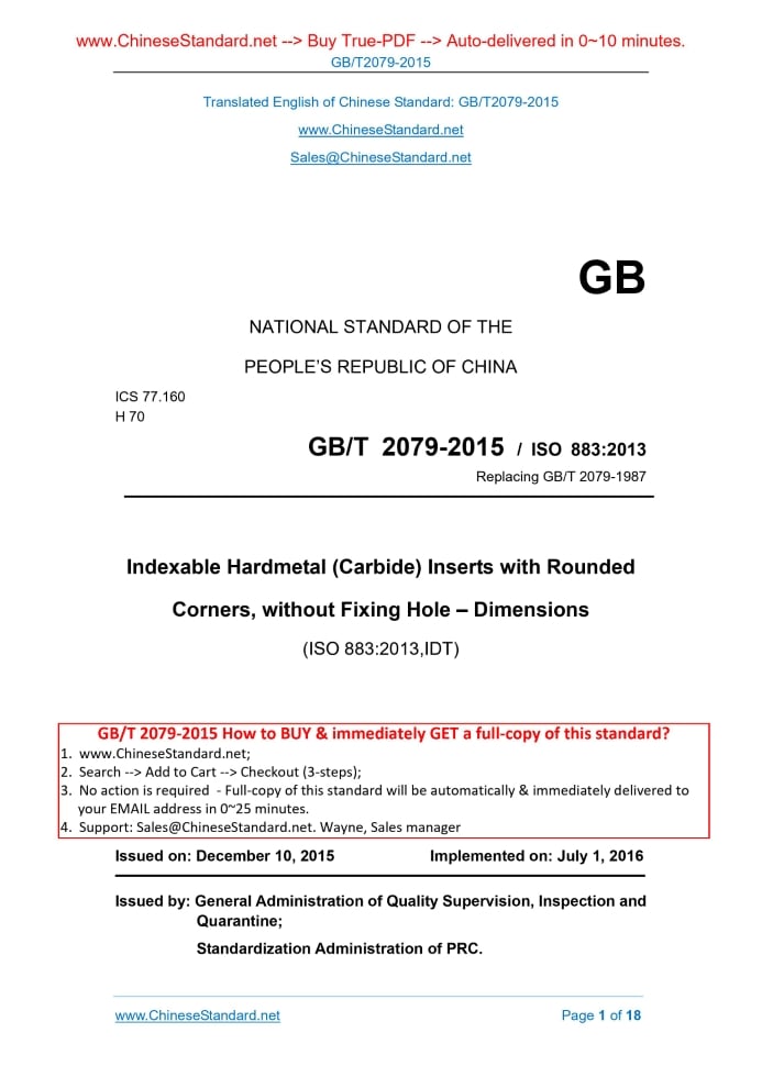 GB/T 2079-2015: Indexable hard metal (carbide) inserts with rounded corners, without fixing hole -- Dimensions Delivery: 9 seconds. True-PDF full-copy in English & invoice will be downloaded + auto-delivered via email. See step-by-step procedure Status: Valid GB/T 2079: Historical versions