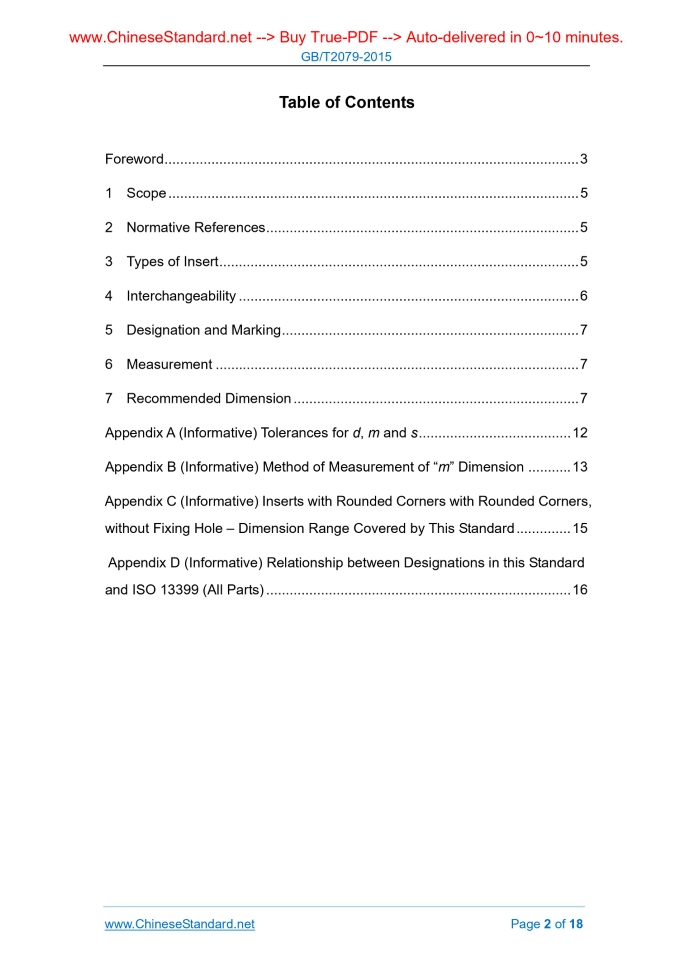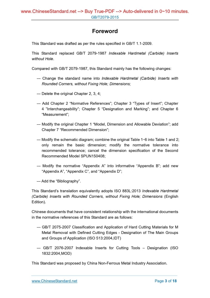 GB/T 2079-2015: Indexable hard metal (carbide) inserts with rounded corners, without fixing hole -- Dimensions---This is an excerpt. Full copy of true-PDF in English version (including equations, symbols, images, flow-chart, tables, and figures etc.), auto-downloaded/delivered in 9 seconds, can be purchased online: https://www.ChineseStandard.net/PDF.aspx/GBT2079-2015 GB NATIONAL STANDARD OF THE PEOPLE’S REPUBLIC OF CHINA ICS 77.160 H 70 GB/T 2079-2015 / ISO 883.2013 Replacing GB/T 2079-1987 Indexable Hardmetal (Carbide) Inserts with Rounded Corners, without Fixing Hole – Dimensions (ISO 883.2013,IDT) Issued on: DECEMBER 10, 2015 Implemented on: JULY 1, 2016 Issued by. General Administration of Quality Supervision, Inspection and Quarantine; Standardization Administration of PRC. Table of ContentsForeword ... 3 1 Scope ... 5 2 Normative References ... 5 3 Types of Insert ... 5 4 Interchangeability ... 6 5 Designation and Marking ... 7 6 Measurement ... 7 7 Recommended Dimension ... 7 Appendix A (Informative) Tolerances for d, m and s ... 12 Appendix B (Informative) Method of Measurement of “m” Dimension ... 13 Appendix C (Informative) Inserts with Rounded Corners with Rounded Corners, without Fixing Hole – Dimension Range Covered by This Standard ... 15 Appendix D (Informative) Relationship between Designations in this Standard and ISO 13399 (All Parts) ... 16ForewordThis Standard was drafted as per the rules specified in GB/T 1.1-2009. This Standard replaced GB/T 2079-1987 Indexable Hardmetal (Carbide) Inserts without Hole. Compared with GB/T 2079-1987, this Standard mainly has the following changes. --- Change the standard name into Indexable Hardmetal (Carbide) Inserts with Rounded Corners, without Fixing Hole; Dimensions; --- Delete the original Chapter 2, 3, 4; --- Add Chapter 2 “Normative References”; Chapter 3 “Types of Insert”; Chapter 4 ”Interchangeability”; Chapter 5 “Designation and Marking”; and Chapter 6 “Measurement”; --- Modify the original Chapter 1 “Model, Dimension and Allowable Deviation”; add Chapter 7 “Recommended Dimension”; --- Modify the schematic diagram; combine the original Table 1~6 into Table 1 and 2; only remain the basic dimension; modify the normative tolerance into recommended tolerance; cancel the dimension specification of the Second Recommended Model SPUN150408; --- Modify the normative “Appendix A” into informative “Appendix B”; add new “Appendix A”, “Appendix C”, and “Appendix D”; --- Add the “Bibliography”. This Standard’s translation equivalently adopts ISO 883L.2013 Indexable Hardmetal (Carbide) Inserts with Rounded Corners, without Fixing Hole; Dimensions (English Edition). Chinese documents that have consistent relationship with the international documents in the normative references of this Standard are as follows. --- GB/T 2075-2007 Classification and Application of Hard Cutting Materials for M Metal Removal with Defined Cutting Edges - Designation of The Main Groups and Groups of Application (ISO 513.2004,IDT) --- GB/T 2076-2007 Indexable Inserts for Cutting Tools – Designation (ISO 1832.2004,MOD) This Standard was proposed by China Non-Ferrous Metal Industry Association. Indexable Hardmetal (Carbide) Inserts with Rounded Corners, without Fixing Hole – Dimensions1 ScopeThis Standard specifies the dimensions of indexable hardmetal (carbide) inserts with rounded corners, without fixing hole. This Standard is applicable to the indexable hardmetal (carbide) inserts with rounded corners, without fixing hole.2 Normative ReferencesThe following documents are essential to the application of this document. For the dated documents, only the versions with the dates indicated are applicable to this document; for the undated documents, only the latest version (including all the amendments) are applicable to this document. ISO 513 Classification and Application of hard Cutting Materials for Metal Removal with Defined Cutting Edges – Designation of the Main Groups and Groups of Application ISO 1832 Indexable Inserts for Cutting Tools – Designation3 Types of InsertThe types of indexable hardmetal (carbide) inserts specified in this Standard are the following. — TN. triangular inserts, with 0° normal clearance; — TP. triangular inserts, with 11° normal clearance; — SN. square inserts, with 0° normal clearance; — SP. square inserts, with 11° normal clearance. Inserts with 0° normal clearance (TN and SN) are standardized only without chip breakers. Inserts with 11° normal clearance (TP and SP) are provided with and ......Source: Above contents are excerpted from the full-copy PDF -- translated/reviewed by: www.ChineseStandard.net / Wayne Zheng et al. Tips & Frequently Asked Questions:Question 1: How long will the true-PDF of English version of GB/T 2079-2015 be delivered?Answer: The full copy PDF of English version of GB/T 2079-2015 can be downloaded in 9 seconds, and it will also be emailed to you in 9 seconds (double mechanisms to ensure the delivery reliably), with PDF-invoice.Question 2: Can I share the purchased PDF of GB/T 2079-2015_English with my colleagues?Answer: Yes. The purchased PDF of GB/T 2079-2015_English will be deemed to be sold to your employer/organization who actually paid for it, including your colleagues and your employer's intranet.Question 3: Does the price include tax/VAT?Answer: Yes. Our tax invoice, downloaded/delivered in 9 seconds, includes all tax/VAT and complies with 100+ countries' tax regulations (tax exempted in 100+ countries) -- See Avoidance of Double Taxation Agreements (DTAs): List of DTAs signed between Singapore and 100+ countriesQuestion 4: Do you accept my currency other than USD?Answer: Yes. www.ChineseStandard.us -- GB/T 2079-2015 -- Click this link and select your country/currency to pay, the exact amount in your currency will be printed on the invoice. Full PDF will also be downloaded/emailed in 9 seconds.Question 5: Should I pu