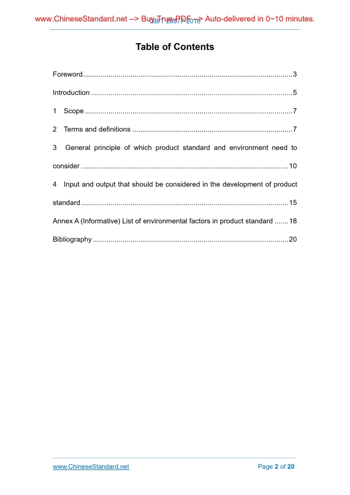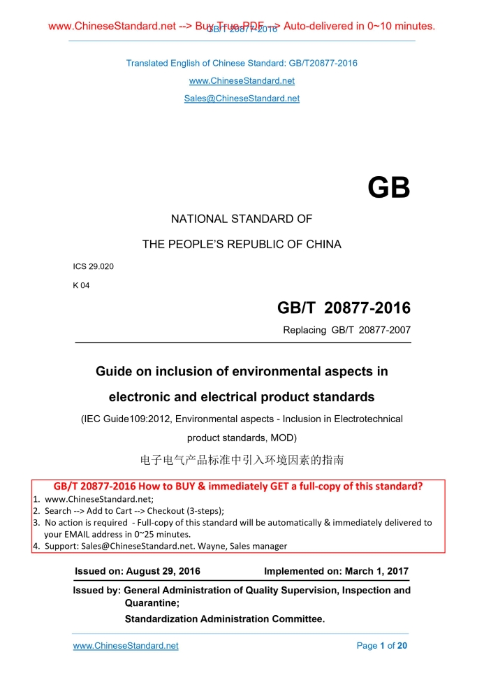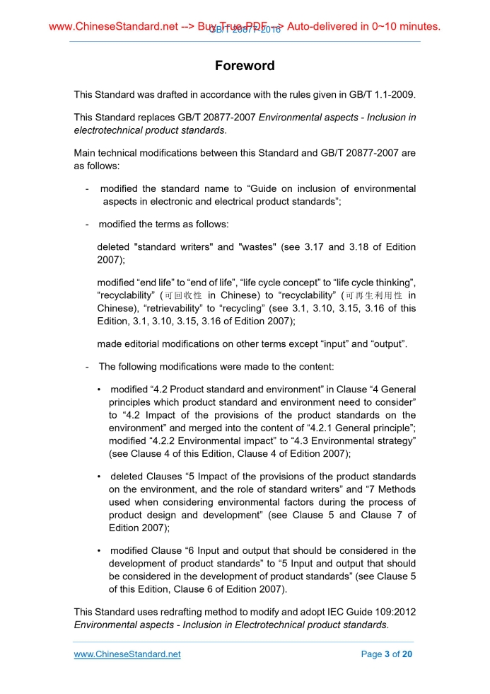 Similar standardsGB/T 20877-2016: Guide on inclusion of environmental aspects in electronic and electrical product standards---This is an excerpt. Full copy of true-PDF in English version (including equations, symbols, images, flow-chart, tables, and figures etc.), auto-downloaded/delivered in 9 seconds, can be purchased online: https://www.ChineseStandard.net/PDF.aspx/GBT20877-2016 GB NATIONAL STANDARD OF THE PEOPLE’S REPUBLIC OF CHINA ICS 29.020 K 04 Replacing GB/T 20877-2007 Guide on inclusion of environmental aspects in electronic and electrical product standards (IEC Guide109.2012, Environmental aspects - Inclusion in Electrotechnical product standards, MOD) Issued on: AUGUST 29, 2016 Implemented on: MARCH 1, 2017 Issued by. General Administration of Quality Supervision, Inspection and Quarantine; Standardization Administration Committee. Table of ContentsForeword ... 3 Introduction ... 5 1 Scope ... 7 2 Terms and definitions ... 7 3 General principle of which product standard and environment need to consider ... 10 4 Input and output that should be considered in the development of product standard ... 15 Annex A (Informative) List of environmental factors in product standard ... 18 Bibliography ... 20ForewordThis Standard was drafted in accordance with the rules given in GB/T 1.1-2009. This Standard replaces GB/T 20877-2007 Environmental aspects - Inclusion in electrotechnical product standards. Main technical modifications between this Standard and GB/T 20877-2007 are as follows. - modified the standard name to “Guide on inclusion of environmental aspects in electronic and electrical product standards”; - modified the terms as follows. deleted "standard writers" and "wastes" (see 3.17 and 3.18 of Edition 2007); modified “end life” to “end of life”, “life cycle concept” to “life cycle thinking”, Chinese), “retrievability” to “recycling” (see 3.1, 3.10, 3.15, 3.16 of this Edition, 3.1, 3.10, 3.15, 3.16 of Edition 2007); made editorial modifications on other terms except “input” and “output”. - The following modifications were made to the content. • modified “4.2 Product standard and environment” in Clause “4 General principles which product standard and environment need to consider” to “4.2 Impact of the provisions of the product standards on the environment” and merged into the content of “4.2.1 General principle”; modified “4.2.2 Environmental impact” to “4.3 Environmental strategy” (see Clause 4 of this Edition, Clause 4 of Edition 2007); • deleted Clauses “5 Impact of the provisions of the product standards on the environment, and the role of standard writers” and “7 Methods used when considering environmental factors during the process of product design and development” (see Clause 5 and Clause 7 of Edition 2007); • modified Clause “6 Input and output that should be considered in the development of product standards” to “5 Input and output that should be considered in the development of product standards” (see Clause 5 of this Edition, Clause 6 of Edition 2007). This Standard uses redrafting method to modify and adopt IEC Guide 109.2012 Environmental aspects - Inclusion in Electrotechnical product standards. This standard has structural changes compared to IEC Guide 109. 2012. It deleted the clause of normative references because there were no specific documents. The editorial differences between this Standard and IEC Guide 109. 2012 as well as reasons are as follows. - in order to keep consistent with the present standard system, modified the standard name to “Guide on inclusion of environmental aspects in electronic and electrical product standards”; - deleted “IEC Environmental Policy” in the introduction of IEC Guide 109.2012. This Part was proposed by and shall be under the jurisdiction of National Environmental Committee on Electrical and Electronic Products and Systems of Standardization Administration of China (SAC/TC 297). The drafting organizations of this Standard. Mechanical Industry Beijing Institute of Electrical and Technical Economics, Shanghai Electrical Apparatus Research Institute (Group) Co., Ltd., Changshu Switch Manufacturing Co., Ltd., China Electrical Equipment Industry Association, China Quality Certification Center, Shanghai Cable Research Institute, China Household Electrical Appliances Research Institute, Shenzhen Xinyu Central Standard Technology Co., Ltd., Rockwell Automation (China) Co., Ltd., SGS - CSTC Standards Technical Services (Shanghai) Co., Ltd., Philips (China) Investment Co., Ltd., Beijing ABB Low Voltage Electrical Appliance Co., Ltd. Main drafters of this Standard. Teng Yun, Zhang Liang, Huang Huijie, Zhou Jianxing, Ma Qiju, Sun Jiansheng, Zhu Yan, Xiao Di, Song Weihong, Du Juan, Zhang Lingzi, Wang Zhongdan. Versions of standard substituted by this Standard are. - GB/T 20877-2007. (LCA) for life cycle thinking (LCT). IEC62430 provides information for all interested parties on how to integrate ECD principles into the design and development of products. Standards writers are not required to apply the LCA principles, but are encouraged to use the ECD principles whenever possible. Manufacturers can capture more detailed design scenarios and reasons for supporting them until more data is available. This approach broadens knowledge based on these options and options, in addition to generating specific environmental standardization requirements, as well as helping to recycle and discard products at end-of-life (EoL). In this context, it is important to note that the standard compilers should carefully consider the environmental aspects of the test method when specifying test methods. Standards writers need to compare environmental data for materials and substances. In any case, they may be careful to process the information derived from the LCA study when making the choices required by the standard. Consultation may be required with specialized environ