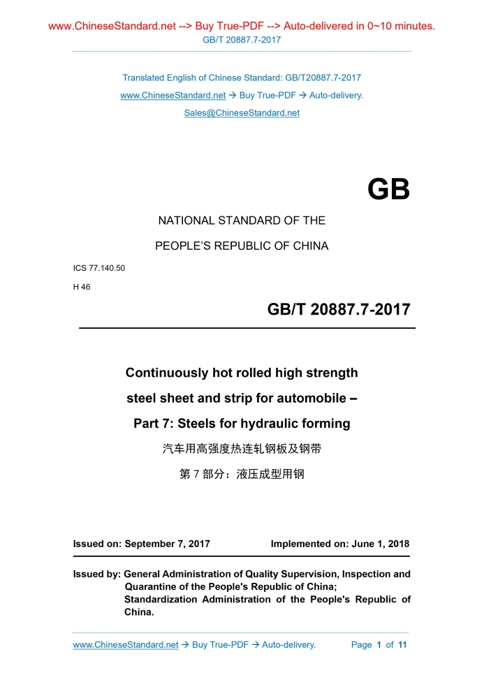 GB/T 20887.7-2017: Continuously hot rolled high strength steel sheet and strip for automobile - Part 7: Steels for hydraulic forming Delivery: 9 seconds. True-PDF full-copy in English & invoice will be downloaded + auto-delivered via email. See step-by-step procedure Status: Valid