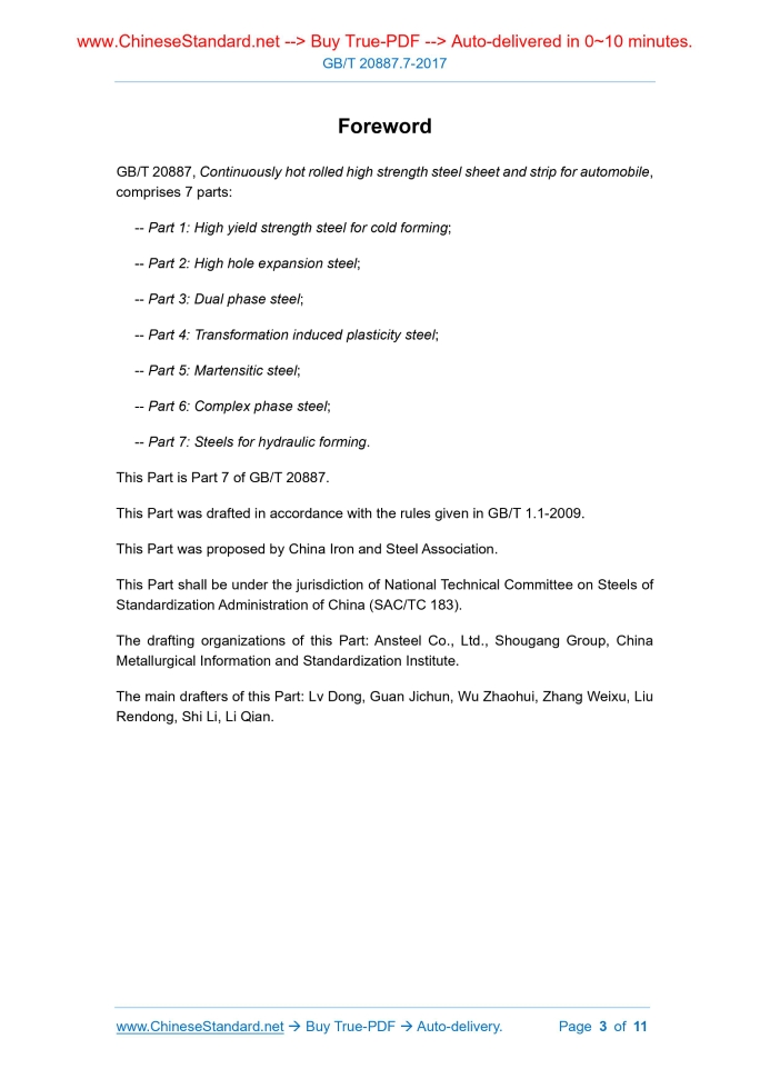 Similar standardsGB/T 20887.7-2017: Continuously hot rolled high strength steel sheet and strip for automobile - Part 7: Steels for hydraulic forming---This is an excerpt. Full copy of true-PDF in English version (including equations, symbols, images, flow-chart, tables, and figures etc.), auto-downloaded/delivered in 9 seconds, can be purchased online: https://www.ChineseStandard.net/PDF.aspx/GBT20887.7-2017 GB NATIONAL STANDARD OF THE PEOPLE’S REPUBLIC OF CHINA ICS 77.140.50 H 46 Continuously hot rolled high strength steel sheet and strip for automobile – Part 7. Steels for hydraulic forming Issued on: SEPTEMBER 7, 2017 Implemented on: JUNE 1, 2018 Issued by. General Administration of Quality Supervision, Inspection and Quarantine of the People's Republic of China; Standardization Administration of the People's Republic of China. Table of ContentsForeword ... 3 1 Scope ... 4 2 Normative references ... 4 3 Terms and definitions ... 6 4 Classification and designation ... 6 5 Ordering content ... 7 6 Dimensions, shapes and weights ... 7 7 Technical requirements ... 7 8 Test method ... 9 9 Inspection rules ... 10 10 Packaging, marking and quality certification... 11ForewordGB/T 20887, Continuously hot rolled high strength steel sheet and strip for automobile, comprises 7 parts. -- Part 1. High yield strength steel for cold forming; -- Part 2. High hole expansion steel; -- Part 3. Dual phase steel; -- Part 4. Transformation induced plasticity steel; -- Part 5. Martensitic steel; -- Part 6. Complex phase steel; -- Part 7. Steels for hydraulic forming. This Part is Part 7 of GB/T 20887. This Part was drafted in accordance with the rules given in GB/T 1.1-2009. This Part was proposed by China Iron and Steel Association. This Part shall be under the jurisdiction of National Technical Committee on Steels of Standardization Administration of China (SAC/TC 183). The drafting organizations of this Part. Ansteel Co., Ltd., Shougang Group, China Metallurgical Information and Standardization Institute. The main drafters of this Part. Lv Dong, Guan Jichun, Wu Zhaohui, Zhang Weixu, Liu Rendong, Shi Li, Li Qian. Continuously hot rolled high strength steel sheet and strip for automobile - Part 7. Steels for hydraulic forming1 ScopeThis Part of GB/T 20887 specifies the terms and definitions, classification and designation, ordering content, dimensions, shapes, weights, technical requirements, test methods, inspection rules, packaging, marking and quality certification of continuously hot rolled high strength steel sheet and strip. This Part applies to steel strip of thickness not greater than 6 mm, and steel sheet transversely cut or steel strip longitudinally cut from steel strip, which are used for the structural parts of automobile such as auxiliary frames and dashboard supports (hereinafter referred to as “steel sheet and strip”).2 Normative referencesThe following referenced documents are indispensable for the application of this document. For dated references, only the edition dated applies to this document. For undated references, the latest edition of the referenced documents (including all amendments) applies to this document. GB/T 222, Permissible tolerances for chemical composition of steel products GB/T 223.5, Steel and iron - Determination of acid-soluble silicon and total silicon content – Reduced molybdosilicate spectrophotometric method GB/T 223.9, Iron steel and alloy - Determination of aluminium content - Chrom azurol S photometric method GB/T 223.16, Methods for chemical analysis of iron, steel and alloy – The chromotropic acid photometric method for the determination of titaninm content GB/T 223.40, Iron, steel and alloy – Determination of niobium content by the sulphochlorophenol S spectrophotometric method GB/T 223.62, Methods for chemical analysis of iron, steel and alloy – The butyl acetate extraction photometric method for the determination of phosphorus content GB/T 223.64, Iron, steel and alloy - Determination of manganese content - Flame atomic absorption spectrometric method GB/T 223.76, Methods for chemical analysis of iron, steel and alloy – The flame atomic absorption spectrometric method for the determination of vanadium content GB/T 223.79, Iron and steel – Determination of multi-element contents – X-ray fluorescence spectrometry(Routine method) GB/T 223.85, Steel and iron – Determination of sulfur content – Infrared absorption method after combustion in an induction furnace GB/T 223.86, Steel and iron – Determination of total carbon content – Infrared absorption method after combustion in an induction furnace GB/T 228.1, Metallic materials – Tensile testing – Part 1 . Method of test at room temperature GB/T 247, General rule of package, mark and certification for steel plates (sheets) and strips GB/T 709, Dimension, shape, weight and tolerances for hot rolled sheets and strips GB/T 2975, Steel and steel products – Location and preparation of samples and test pieces for mechanical testing GB/T 4336, Carbon and low-alloy steel – Determination of multi-element contents – Spark discharge atomic emission spectrometric method (routine method) GB/T 5028, Metallic materials – Sheet and strip – Determination of tensile strain hardening exponent GB/T 8170, Rules of rounding off for numerical values and expression and judgement of limiting values GB/T 17505, Steel and steel products – General technical delivery requirements GB/T 20066, Steel and iron – Sampling and preparation of samples for the determination of chemical composition GB/T 20123, Steel and iron – Determination of total carbon and sulfur content Infrared absorption method after combustion in an induction furnace (routine HF – initials of “Hydraulic Forming” in English.5 Ordering content5.1 The contract or order based on this Part shall include the following content. a) product name (steel sheet or strip); b) a reference to this Part; c) designation; d) specificati