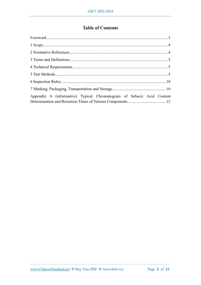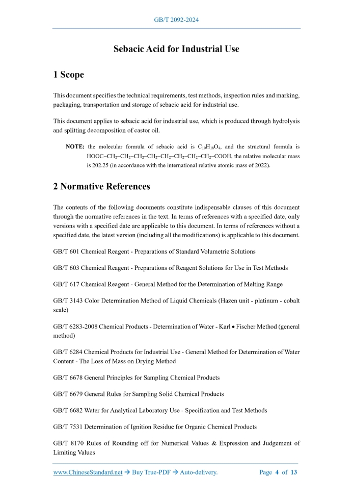 GB/T 2092-2024: Sebacic acid for industrial use Delivery: 9 seconds. True-PDF full-copy in English & invoice will be downloaded + auto-delivered via email. See step-by-step procedure Status: Valid GB/T 2092: Historical versions