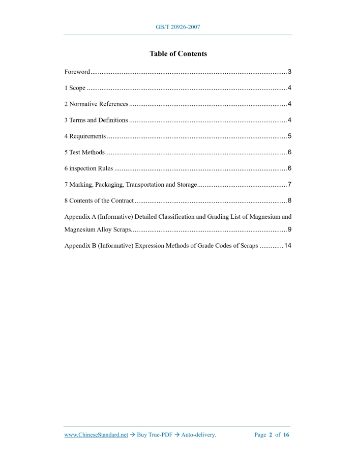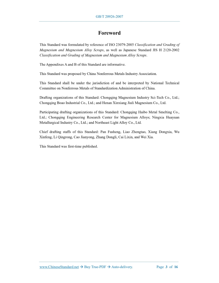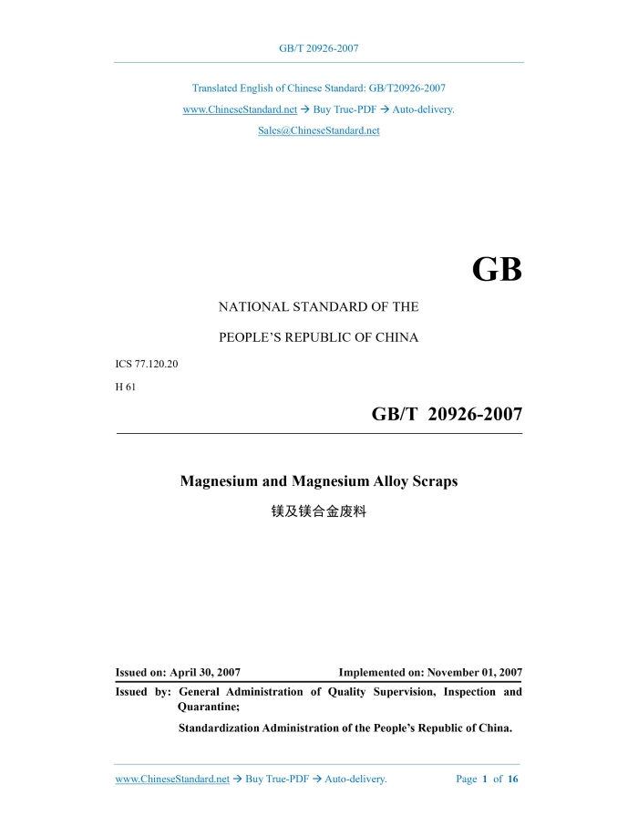 Similar standardsGB/T 20926-2007: Magnesium and magnesium alloy scraps---This is an excerpt. Full copy of true-PDF in English version (including equations, symbols, images, flow-chart, tables, and figures etc.), auto-downloaded/delivered in 9 seconds, can be purchased online: https://www.ChineseStandard.net/PDF.aspx/GBT20926-2007GB NATIONAL STANDARD OF THE PEOPLE’S REPUBLIC OF CHINA ICS 77.120.20 H 61 Magnesium and Magnesium Alloy Scraps ISSUED ON: APRIL 30, 2007 IMPLEMENTED ON: NOVEMBER 01, 2007 Issued by: General Administration of Quality Supervision, Inspection and Quarantine; Standardization Administration of the People’s Republic of China. Table of ContentsForeword ... 3 1 Scope ... 4 2 Normative References ... 4 3 Terms and Definitions ... 4 4 Requirements ... 5 5 Test Methods ... 6 6 inspection Rules ... 6 7 Marking, Packaging, Transportation and Storage ... 7 8 Contents of the Contract ... 8 Appendix A (Informative) Detailed Classification and Grading List of Magnesium and Magnesium Alloy Scraps ... 9 Appendix B (Informative) Expression Methods of Grade Codes of Scraps ... 14ForewordThis Standard was formulated by reference of ISO 23079-2005 Classification and Grading of Magnesium and Magnesium Alloy Scraps, as well as Japanese Standard JIS H 2120-2002 Classification and Grading of Magnesium and Magnesium Alloy Scraps. The Appendixes A and B of this Standard are informative. This Standard was proposed by China Nonferrous Metals Industry Association. This Standard shall be under the jurisdiction of and be interpreted by National Technical Committee on Nonferrous Metals of Standardization Administration of China. Drafting organizations of this Standard: Chongqing Magnesium Industry Sci-Tech Co., Ltd.; Chongqing Boao Industrial Co., Ltd.; and Henan Xinxiang Jiuli Magnesium Co., Ltd. Participating drafting organizations of this Standard: Chongqing Haibo Metal Smelting Co., Ltd.; Chongqing Engineering Research Center for Magnesium Alloys; Ningxia Huayuan Metallurgical Industry Co., Ltd.; and Northeast Light Alloy Co., Ltd. Chief drafting staffs of this Standard: Pan Fusheng, Liao Zhengtao, Xiang Dongxia, Wu Xinfeng, Li Qingrong, Cao Jianyong, Zhang Dongli, Cai Lixin, and Wei Xia. This Standard was first-time published. Magnesium and Magnesium Alloy Scraps1 ScopeThis Standard specifies the requirements, test methods, inspection rules and markings, packaging, transportation, storage, contract content, etc. for magnesium and magnesium alloy scraps. This Standard is applicable to magnesium and magnesium alloy scraps produced in each production process and use process.2 Normative ReferencesThe provisions in following documents become the provisions of this Standard through reference in this Standard. For dated references, the subsequent amendments (excluding corrigendum) or revisions do not apply to this Standard, however, parties who reach an agreement based on this Standard are encouraged to study if the latest versions of these documents are applicable. For undated references, the latest edition of the referenced document applies. GB/T 13748 (all parts) Chemical Analysis Methods of Magnesium and Magnesium Alloys3 Terms and DefinitionsFor the purposes of this Standard, the following terms and definitions apply. 3.1 Coatings Surface layers other than native oxide layers. Example: oil, paint, magnesium coating. 3.2 Contaminant Harmful physical or chemical foreign substances contained in returns. Example: water, foundry sand. 3.3 Inserts A part of metal or other substance that is inserted at the time of casting or at a certain location in a finished product. Example: bearings, threaded inserts. 3.4 Returns Various types of magnesium and magnesium alloy materials that are collected or recycled at various stages of production. 3.5 Turnings Magnesium and magnesium alloy materials in the shape of pellets, flakes, rolls, strips, etc. produced by machining or other processing.4 Requirements4.1 Magnesium and magnesium alloy scraps are mainly divided into three categories (Class I, Class II, Class Ill) and nine grades (Grade 1, Grade 2, Grade 3, Grade 4, Grade 5, Grade 6, Grade 7, Grade 8 and Grade 9) according to their physical forms. 4.2 Class I magnesium and magnesium alloy scraps are in the form of block and are divided into five grades, namely, Grade 1, Grade 2, Grade 3, Grade 4 and Grade 5. 4.3 Class II magnesium and magnesium alloy scarps are in the form of chip and are divided into three grades, namely, Grade 6, Grade 7 and Grade 8. 4.4 Class III magnesium and magnesium alloy scraps are in the form of slag and are divided into one grade, namely, Grade 9. 4.5 Classification and grading of magnesium and magnesium alloy scraps shall meet the requirements in Table 1. 4.6 Both the supplier and the buyer can also refer to Appendix A (informative) for the detailed classification and grading principles of magnesium and magnesium alloy scraps specified; and refer to Appendix B (informative) for the arrangement of scrap codes. Magnesium and magnesium alloy scraps shall be submitted for acceptance in batches; and each batch shall consist of scraps of the same grade. 6.3 Inspection items The inspection items of magnesium and magnesium alloy scraps shall be negotiated by both parties. The supplier should provide the alloy designation of each batch of magnesium and magnesium alloy scraps. 6.4 Sampling The sampling method for chemical composition analysis of magnesium and magnesium alloy scraps and arbitration shall be negotiated by both parties; and arbitration sampling shall be jointly conducted by both parties. 6.5 Judgment of test results When the classification and grading or the chemical composition of magnesium and magnesium alloy scraps do not meet the provisions of this Standard, the supplier and purchaser shall negotiate to resolve it.7 Marking, Packaging, Transportation and Storage7.1 Marking The outer packaging of magnesium and magnesium alloy scraps shall be marked with signs or labels of