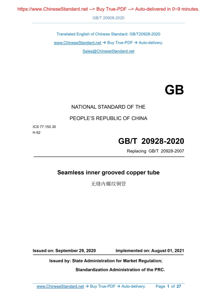 GB/T 20928-2020: Seamless inner grooved copper tube Delivery: 9 seconds. True-PDF full-copy in English & invoice will be downloaded + auto-delivered via email. See step-by-step procedure Status: Valid GB/T 20928: Historical versions