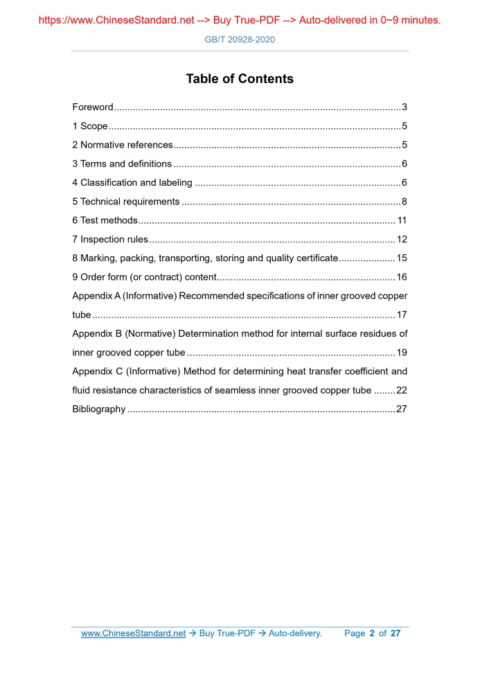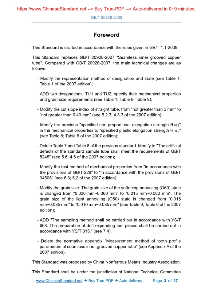 Similar standardsGB/T 20928-2020: Seamless inner grooved copper tube---This is an excerpt. Full copy of true-PDF in English version (including equations, symbols, images, flow-chart, tables, and figures etc.), auto-downloaded/delivered in 9 seconds, can be purchased online: https://www.ChineseStandard.net/PDF.aspx/GBT20928-2020GB NATIONAL STANDARD OF THE PEOPLE’S REPUBLIC OF CHINA ICS 77.150.30 H 62 Replacing GB/T 20928-2007 Seamless inner grooved copper tube 无缝内螺纹铜管 ISSUED ON: SEPTEMBER 29, 2020 IMPLEMENTED ON: AUGUST 01, 2021 Issued by: State Administration for Market Regulation; Standardization Administration of the PRC. Table of ContentsForeword ... 3 1 Scope ... 5 2 Normative references ... 5 3 Terms and definitions ... 6 4 Classification and labeling ... 6 5 Technical requirements ... 8 6 Test methods ... 11 7 Inspection rules ... 12 8 Marking, packing, transporting, storing and quality certificate ... 15 9 Order form (or contract) content ... 16 Appendix A (Informative) Recommended specifications of inner grooved copper tube ... 17 Appendix B (Normative) Determination method for internal surface residues of inner grooved copper tube ... 19 Appendix C (Informative) Method for determining heat transfer coefficient and fluid resistance characteristics of seamless inner grooved copper tube ... 22 Bibliography ... 27ForewordThis Standard is drafted in accordance with the rules given in GB/T 1.1-2009. This Standard replaces GB/T 20928-2007 "Seamless inner grooved copper tube". Compared with GB/T 20928-2007, the main technical changes are as follows: - Modify the representation method of designation and state (see Table 1; Table 1 of the 2007 edition); - ADD two designations: TU1 and TU2; specify their mechanical properties and grain size requirements (see Table 1, Table 8, Table 9); - Modify the cut slope index of straight tube, from "not greater than 2 mm" to "not greater than 0.40 mm" (see 5.2.3; 4.3.3 of the 2007 edition); - Modify the previous "specified non-proportional elongation strength RP0.2" in the mechanical properties to "specified plastic elongation strength RP0.2" (see Table 8; Table 6 of the 2007 edition); - Delete Table 7 and Table 8 of the previous standard. Modify to "The artificial defects of the standard sample tube shall meet the requirements of GB/T 5248" (see 5.6; 4.6 of the 2007 edition); - Modify the test method of mechanical properties from "in accordance with the provisions of GB/T 228" to "in accordance with the provisions of GB/T 34505" (see 6.3; 5.2 of the 2007 edition); - Modify the grain size. The grain size of the softening annealing (O60) state is changed from "0.020 mm~0.060 mm" to "0.015 mm~0.060 mm". The grain size of the light annealing (O50) state is changed from "0.015 mm~0.035 mm" to "0.010 mm~0.035 mm" (see Table 9; Table 6 of the 2007 edition); - ADD "The sampling method shall be carried out in accordance with YS/T 668. The preparation of drift-expending test pieces shall be carried out in accordance with YS/T 815." (see 7.4); - Delete the normative appendix "Measurement method of tooth profile parameters of seamless inner grooved copper tube" (see Appendix A of the 2007 edition). This Standard was proposed by China Nonferrous Metals Industry Association. This Standard shall be under the jurisdiction of National Technical Committee Seamless inner grooved copper tube1 ScopeThis Standard specifies the classification and labeling, technical requirements, test methods, inspection rules, marking, packing, transporting, storing and quality certificate, and order form (or contract) content of seamless inner grooved copper tube. This Standard applies to seamless inner grooved copper tube for air conditioning and refrigeration equipment (hereinafter referred to as "tube").2 Normative referencesThe following documents are indispensable for the application of this document. For the dated references, only the editions with the dates indicated are applicable to this document. For the undated references, the latest edition (including all the amendments) are applicable to this document. GB/T 242 Metal materials - Tube - Drift-expending test GB/T 2828.1 Sampling procedures for inspection by attributes - Part 1: Sampling schemes indexed by acceptance quality limit (AQL) for lot-by-lot inspection GB/T 5121 (all parts) Methods for chemical analysis of copper and copper alloys GB/T 5231 Designation and chemical composition of wrought copper and copper alloys GB/T 5248 Electromagnetic (eddy-current) examination of copper and copper alloy seamless tube GB/T 8170 Rules of rounding off for numerical values and expression and judgement of limiting values GB/T 8888 Wrought heavy non-ferrous metal products - Packing, marking, transporting, storing and quality certificate GB/T 26303.1 Measuring method for dimensions and shapes of wrought copper and copper alloy - Part 1: Tube GB/T 34505 Copper and copper alloy materials - Tensile testing at room temperature YS/T 347 Copper and copper alloys - Estimation of average grain size YS/T 482 Methods for analysis of copper and copper alloys - The atomic emission spectrometry YS/T 483 Methods for analysis of copper and copper alloys - X-Ray fluorescence spectrometric (wavelength dispersive) YS/T 668 The sampling method of physical and chemical testing for copper and copper alloys YS/T 815 Preparation method of test pieces for mechanical and technological properties of copper and copper alloys3 Terms and definitionsThe following terms and definitions apply to this document. 3.1 Seamless inner grooved copper tube The copper tube with a smooth outer surface, a certain number of regular grooves on the inner surface, and a continuous section circumference. 3.2 Weight per metre The mass of the inner grooved copper tube per 1 m length, in grams per metre (g/m).4 Classification and labeling4.1 Product classification The designation, code, state and supply shape of the tube shall meet the requirements of Table 1. The tooth p
