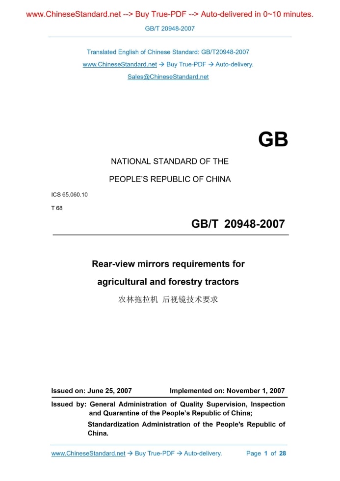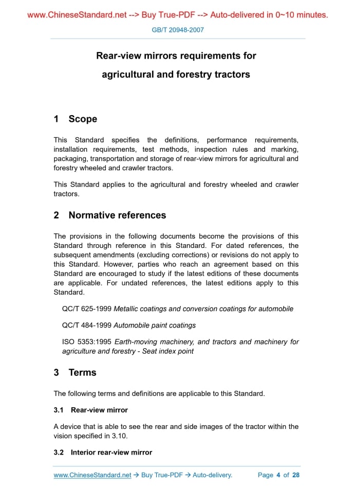 Similar standardsGB/T 20948-2007: Rear-view mirrors requirements for agricultural and forestry tractors---This is an excerpt. Full copy of true-PDF in English version (including equations, symbols, images, flow-chart, tables, and figures etc.), auto-downloaded/delivered in 9 seconds, can be purchased online: https://www.ChineseStandard.net/PDF.aspx/GBT20948-2007NATIONAL STANDARD OF THE PEOPLE’S REPUBLIC OF CHINA ICS 65.060.10 T 68 Rear-view mirrors requirements for agricultural and forestry tractors ISSUED ON: JUNE 25, 2007 IMPLEMENTED ON: NOVEMBER 1, 2007 Issued by: General Administration of Quality Supervision, Inspection and Quarantine of the People’s Republic of China; Standardization Administration of the People's Republic of China. Table of ContentsForeword ... 3 1 Scope ... 4 2 Normative references ... 4 3 Terms ... 4 4 Performance requirements ... 7 5 Installation requirements ... 11 6 Measurement and devices and test methods ... 12 7 Inspection rules ... 24 8 Marking, packaging, transportation and storage ... 26 Appendix A (Normative) Spectral tristimulus values of the CIE standard colorimetric observer ... 28 Rear-view mirrors requirements for agricultural and forestry tractors1 ScopeThis Standard specifies the definitions, performance requirements, installation requirements, test methods, inspection rules and marking, packaging, transportation and storage of rear-view mirrors for agricultural and forestry wheeled and crawler tractors. This Standard applies to the agricultural and forestry wheeled and crawler tractors.2 Normative referencesThe provisions in the following documents become the provisions of this Standard through reference in this Standard. For dated references, the subsequent amendments (excluding corrections) or revisions do not apply to this Standard. However, parties who reach an agreement based on this Standard are encouraged to study if the latest editions of these documents are applicable. For undated references, the latest editions apply to this Standard. QC/T 625-1999 Metallic coatings and conversion coatings for automobile QC/T 484-1999 Automobile paint coatings ISO 5353:1995 Earth-moving machinery, and tractors and machinery for agriculture and forestry - Seat index point3 TermsThe following terms and definitions are applicable to this Standard. 3.1 Rear-view mirror A device that is able to see the rear and side images of the tractor within the vision specified in 3.10. 3.2 Interior rear-view mirror A device that meets the vision defined in 3.1 and is mounted in the tractor cab. 3.3 Exterior rear-view mirror A device that meets the vision defined in 3.1 and is mounted on the outer surface of the tractor. 3.4 Class of rear-view mirror Various rear-view mirrors with one or more common features or functions. Class I is an interior rear-view mirror; and Class II is an exterior rear-view mirror. 3.5 Center of the mirror The center of mass of the visible area on the reflecting surface. 3.6 Principal radius of curvature at one point obtained on the reflecting surface (ri, ri’) The radius of curvature measured by the instrument specified in 6.3.1 through the center of the reflecting surface, parallel to the line segment b of the mirror and perpendicular to the direction of the line. See 4.3.1.2 for the determination of line segment b. 3.7 Radius of curvature at one point on the reflecting surface (rpi) Refer to the arithmetic mean value of the principal radius of curvature: Where: rpi - Radius of curvature at the ith point, in millimeters (mm); ri, ri’ - Principal radius of curvature measured in two mutually perpendicular directions at the ith point, in millimeters (mm). 3.8 Radius of curvature of the constituent parts of the rear-view mirror (C) C refers to the radius of the arc of the curved shape of the components such as protective frame, support frame, and connecting member of the rear-view mirror. 3.9 Driver’s ocular points 4.1.5 For the edge of the fixed hole or recess with a diameter or a maximum diagonal of less than 12mm on the rear-view mirror, if it has been rounded, the requirements for radius of curvature in 4.1.4 are not necessarily met. 4.1.6 The connection of the rear-view mirror to the tractor is designed to ensure that the rear-view mirror is offset from the axis of rotation or the center of rotation in the direction of impact, or either of them, to form a cylinder with a radius of 50mm. The cylinder shall be cut at least to the surface portion to which the connector is attached. 4.1.7 For exterior rear-view mirrors, if the parts involved in 4.1.3, 4.1.4, and 4.1.5 are made of materials not greater than Shore hardness of A60, it is not necessary to meet the above requirements. 4.1.8 For interior rear-view mirrors, if the parts on the rear-view mirrors are made of materials less than Shore hardness of A50 and mounted on a steel support, the tests of 4.1.3 and 4.1.4 apply only to this support. 4.2 Appearance requirements 4.2.1 Under the illumination condition of 500 lx, when the mirror surface is viewed from the 45° direction at 500mm from the naked eye, there shall be no defects such as deformation, blur, streaks, bubbles, scratches, cracks and inclusions on the rear-view mirror surface. 4.2.2 Rubber parts shall not have obvious defects such as damages and cracks. 4.2.3 Plastic parts shall not have obvious defects such as fading, cracks, scratches and deformation. 4.3 Performance requirements 4.3.1 Size requirements 4.3.1.1 Interior rear-view mirror (Class I) It shall be possible to draw a rectangle with a base of a and a height of 40mm on the reflecting surface. The size a is calculated according to the Formula (2). Where: 4.4.3.2 The difference between rpi (rp1, rp2 and rp3) value and r value of the radius of curvature at any point shall be no more than 0.15r. 4.5 Reflectance 4.5.1 The reflectance value determined according to the method specified in 6.4 shall be not less than 40%. If the rear-view mirror has two working positions