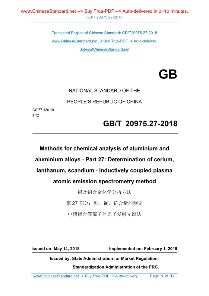 GB/T 20975.27-2018: Methods for chemical analysis of aluminium and aluminium alloys - Part 27: Determination of cerium, lanthanum, scandium - Inductively coupled plasma atomic emission spectrometry method Delivery: 9 seconds. True-PDF full-copy in English & invoice will be downloaded + auto-delivered via email. See step-by-step procedure Status: Valid