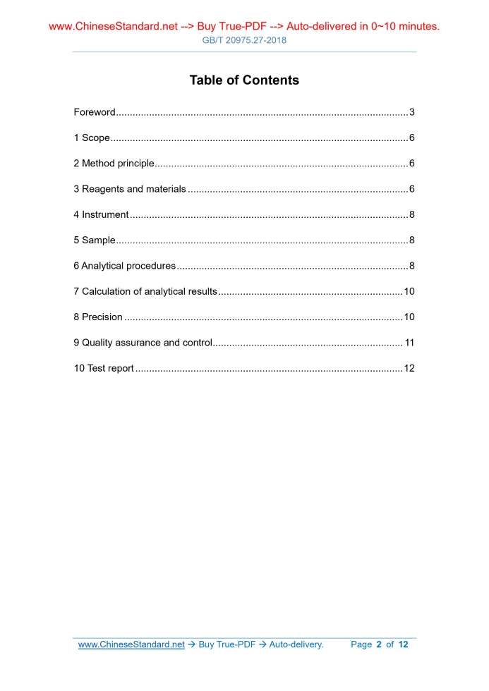 Similar standardsGB/T 20975.27-2018: Methods for chemical analysis of aluminium and aluminium alloys - Part 27: Determination of cerium, lanthanum, scandium - Inductively coupled plasma atomic emission spectrometry method---This is an excerpt. Full copy of true-PDF in English version (including equations, symbols, images, flow-chart, tables, and figures etc.), auto-downloaded/delivered in 9 seconds, can be purchased online: https://www.ChineseStandard.net/PDF.aspx/GBT20975.27-2018 GB NATIONAL STANDARD OF THE PEOPLE’S REPUBLIC OF CHINA ICS 77.120.10 H 12 Methods for chemical analysis of aluminium and aluminium alloys - Part 27. Determination of cerium, lanthanum, scandium - Inductively coupled plasma atomic emission spectrometry method Issued on: MAY 14, 2018 Implemented on: FEBRUARY 1, 2019 Issued by. State Administration for Market Regulation; Standardization Administration of the PRC. Table of ContentsForeword ... 3 1 Scope ... 6 2 Method principle ... 6 3 Reagents and materials ... 6 4 Instrument ... 8 5 Sample ... 8 6 Analytical procedures ... 8 7 Calculation of analytical results ... 10 8 Precision ... 10 9 Quality assurance and control ... 11 10 Test report ... 12ForewordGB/T 20975 “Methods for chemical analysis of aluminium and aluminium alloys” is divided into 31 parts. - Part 1. Determination of mercury content; - Part 2. Determination of arsenic content; - Part 3. Determination of copper content; - Part 4. Determination of iron content - Orthopenanthroline photometric method; - Part 5. Determination of silicon content; - Part 6. Determination of cadmium content - Flame atomic absorption spectrometric method; - Part 7. Determination of manganese content - Potassium periodate spectrophotometric method; - Part 8. Determination of zinc content; - Part 9. Determination of lithium content - Flame atomic absorption spectrometric method; - Part 10. Determination of tin content; - Part 11. Determination of lead content; - Part 12. Determination of titanium content; - Part 13. Determination of vanadium content - N-benzoyl- Nphenylhydroxylamine spectrophotometric method; - Part 14. Determination of nickel content; - Part 15. Determination of boron content; - Part 16. Determination of magnesium content; - Part 17. Determination of strontium content - Flame atomic absorption spectrometric method; - Part 18. Determination of chromium content; Methods for chemical analysis of aluminium and aluminium alloys - Part 27. Determination of cerium, lanthanum, scandium - Inductively coupled plasma atomic emission spectrometry method1 ScopeThis Part of GB/T 20975 specifies the method for determination of cerium, lanthanum, scandium content in aluminium and aluminium alloys. This Part is applicable to the determination of cerium, lanthanum, and scandium content in aluminium and aluminium alloys. The aluminium in aluminium and aluminium alloys interferes with the determination of cerium, lanthanum, and scandium. The same amount of aluminium is added to the working curve to eliminate the interference. Cerium, lanthanum, and scandium do not interfere with each other, and other coexisting elements do not interfere with the determination. Measurement range. cerium. 0.005%~0.90%; lanthanum. 0.005%~0.50%; scandium. 0.0002%~0.50%.2 Method principleAfter the sample is dissolved, in dilute hydrochloric acid medium, using inductively coupled plasma atomic emission spectrometer (ICP-AES), the content of cerium, lanthanum, and scandium elements is determined. By matrix matching method, the influence of the matrix on the measurement results is corrected.3 Reagents and materialsUnless otherwise stated, in the analysis, only Grade 2 water is used. 3.1 Hydrogen peroxide (ρ=1.10 g/mL). 3.2 Hydrochloric acid (ρ=1.19 g/mL), analytically pure. 3.3 Nitric acid (ρ=1.42 g/mL), analytically pure. 3.4 Argon ( >99.99%). 3.5 Hydrochloric acid (1+1). 3.6 Sodium hydroxide (200 g/L). 3.7 Aluminium [w(Al)≥99.99%], before use, dip-rinse with a small amount of acid; then WASH off the acid with water, RINSE 2~3 times with absolute ethyl alcohol, and air dry. 3.8 Aluminium matrix solution (20 mg/mL). WEIGH 10.00 g of aluminium (3.7) into a 500 mL beaker; COVER the watch glass; and ADD a total of 300 mL of hydrochloric acid (3.5) in portions. After the violent reaction is stopped, ADD a few drops of hydrogen peroxide (3.1); slowly HEAT until completely dissolved; then BOIL for a few minutes, COOL; and TRANSFER the solution to a 500 mL volumetric flask; USE water to dilute to volume, and MIX well. 3.9 Standard stock solution of cerium (1 mg/mL). WEIGH 0.3071 g of cerium oxide [w(CeO2)≥99.99%, pre-burned at 1000 °C for 1 h, and cooled in a desiccator] in a 100 mL beaker; ADD 15 mL of nitric acid (3.3). PLACE for a while and HEAT to boil; then ADD 1 mL of hydrogen peroxide (3.1); HEAT at low temperature for 4 times~5 times until complete dissolution; HEAT to boil, and COOL. TRANSFER to a 250 mL volumetric flask; USE water to dilute to volume, and MIX well. 3.10 Standard stock solution of lanthanum (1 mg/mL). WEIGH 0.2932 g of lanthanum trioxide [w(La2O3)≥99.99%, pre-burned at 1000 °C for 1 h, and cooled in a desiccator] in a 100 mL beaker; ADD 50 mL of hydrochloric acid (3.5); HEAT until complete dissolution, and COOL. TRANSFER to a 250 mL volumetric flask; USE water to dilute to volume, and MIX well. 3.11 Standard stock solution of scandium (1 mg/mL). WEIGH 0.3835 g of scandium oxide [w(Sc2O3)≥99.99%, pre-burned at 800 °C for 1 h, and cooled in a desiccator] into a 100 mL beaker; ADD 25 mL of nitric acid (3.3); dropwise ADD hydrogen peroxide (3.1) until completely dissolved. Then BOIL for a few minutes, COOL; and TRANSFER to a 250 mL volumetric flask; ADD 25 mL of nitric acid (3.3); USE water to dilute to volume, and MIX well. 3.12 Cerium standard solution. PIPETTE 10.00 mL of standard stock solution of cerium (3.9) into a 100 mL volumetric flask; USE water to dilute to volume, and MIX well, to obtain cerium standard sol