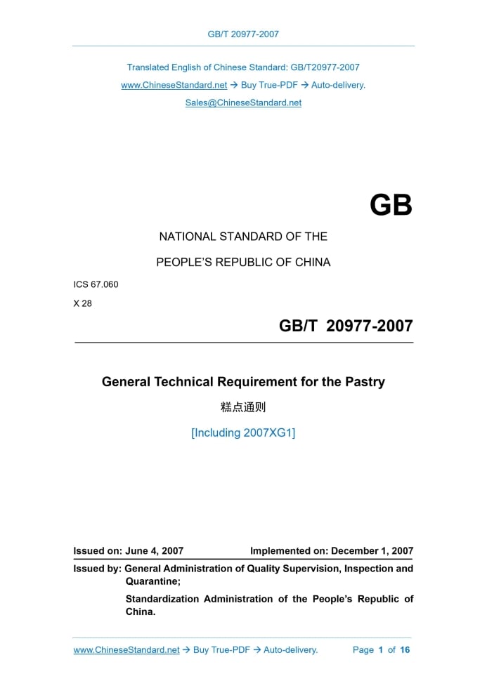 GB/T 20977-2007: [Including 2017XG1] General technical requirement for the pastry Delivery: 9 seconds. True-PDF full-copy in English & invoice will be downloaded + auto-delivered via email. See step-by-step procedure Status: Valid GB/T 20977: Historical versions