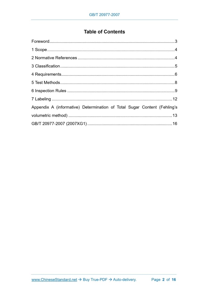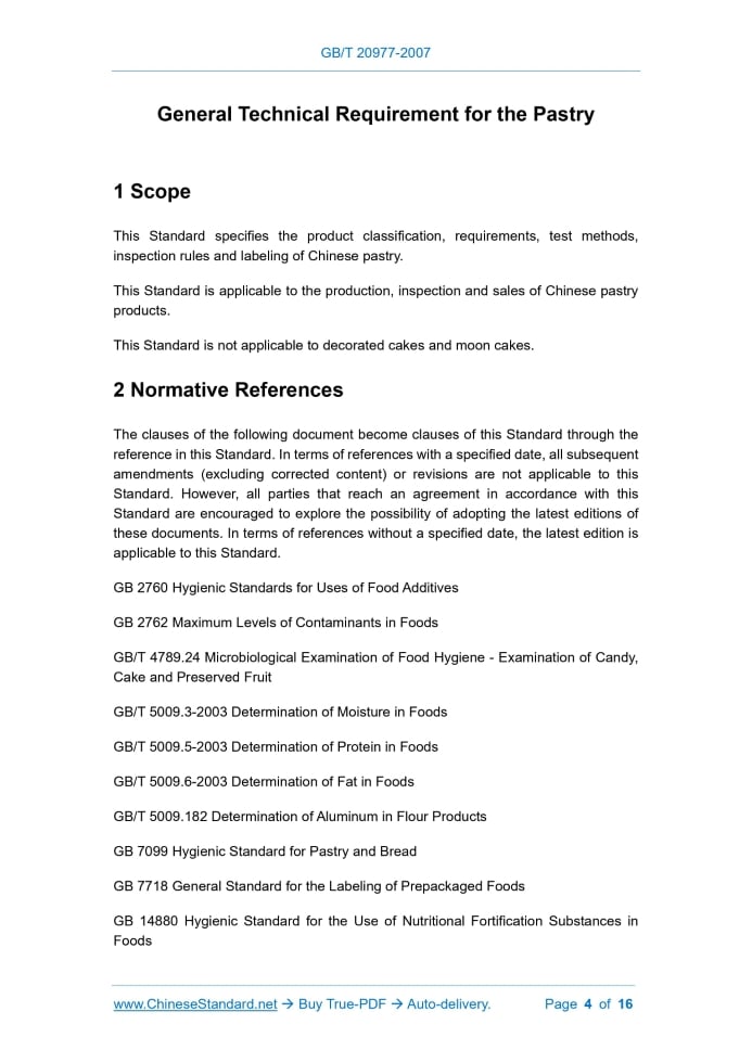Similar standardsGB/T 20977-2007: [Including 2017XG1] General technical requirement for the pastry---This is an excerpt. Full copy of true-PDF in English version (including equations, symbols, images, flow-chart, tables, and figures etc.), auto-downloaded/delivered in 9 seconds, can be purchased online: https://www.ChineseStandard.net/PDF.aspx/GBT20977-2007GB NATIONAL STANDARD OF THE PEOPLE’S REPUBLIC OF CHINA ICS 67.060 X 28 General Technical Requirement for the Pastry [Including 2007XG1] Issued on: JUNE 4, 2007 Implemented on: DECEMBER 1, 2007 Issued by. General Administration of Quality Supervision, Inspection and Quarantine; Standardization Administration of the People’s Republic of China. Table of ContentsForeword... 3 1 Scope... 4 2 Normative References... 4 3 Classification... 5 4 Requirements... 6 5 Test Methods... 8 6 Inspection Rules... 9 7 Labeling... 12 Appendix A (informative) Determination of Total Sugar Content (Fehling’s volumetric method)... 13 GB/T 20977-2007 (2007XG1)... 16 General Technical Requirement for the Pastry1 ScopeThis Standard specifies the product classification, requirements, test methods, inspection rules and labeling of Chinese pastry. This Standard is applicable to the production, inspection and sales of Chinese pastry products. This Standard is not applicable to decorated cakes and moon cakes.2 Normative ReferencesThe clauses of the following document become clauses of this Standard through the reference in this Standard. In terms of references with a specified date, all subsequent amendments (excluding corrected content) or revisions are not applicable to this Standard. However, all parties that reach an agreement in accordance with this Standard are encouraged to explore the possibility of adopting the latest editions of these documents. In terms of references without a specified date, the latest edition is applicable to this Standard. GB 2760 Hygienic Standards for Uses of Food Additives GB 2762 Maximum Levels of Contaminants in Foods GB/T 4789.24 Microbiological Examination of Food Hygiene - Examination of Candy, Cake and Preserved Fruit GB/T 5009.3-2003 Determination of Moisture in Foods GB/T 5009.5-2003 Determination of Protein in Foods GB/T 5009.6-2003 Determination of Fat in Foods GB/T 5009.182 Determination of Aluminum in Flour Products GB 7099 Hygienic Standard for Pastry and Bread GB 7718 General Standard for the Labeling of Prepackaged Foods GB 14880 Hygienic Standard for the Use of Nutritional Fortification Substances in Foods JJF 1070 Rules of Metrological Testing for Net Quantity of Products in Prepackages with Fixed Content General Administration of Quality Supervision, Inspection and Quarantine, No. 75 Order [2005], Measures for the Supervision and Administration of Quantitative Packaging Commodities Measurement General Administration of Quality Supervision, Inspection and Quarantine, State Administration for Industry and Commerce, jointly issued No. 66 Order, Measures for the Supervision and Administration of Weighing and Measurement of Retail Commodities Ministry of Health, P.R. China, supervised and issued [2003] No. 180, Bulk Food Hygiene Management Code3 ClassificationPastry is classified in accordance with hot processing and cold processing. 3.1 Hot-processed Pastry 3.1.1 Baked pastry Baked pastry is divided into. puffy pastry, soft pastry, crispy pastry, flaky pastry, meringue pastry, water-oiled crust pastry, syrup crust pastry, soft crust pastry, hard crust pastry, fermented pastry, baked pastry and bake cakes. 3.1.2 Fried pastry Fried pastry is divided into. meringue pastry, water-oiled crust pastry, soft pastry, flaky pastry, water-conditioned pastry, fermented pastry and glutinous rice pastry. 3.1.3 Steamed pastry Steamed pastry is divided into. steamed cakes, impression cakes, tough cakes, steamed sponge cakes and sponge cakes. 3.1.4 Cooked flour pastry Cooked flour pastry is divided into. hot-adjusted soft cakes, impression cakes and sliced cakes. 3.1.5 Others Cooked processed pastry other than baked pastry, fried pastry, steamed pastry and cooked flour pastry. 5.2 Inspection of Physical and Chemical Indicators 5.2.1 Inspection of loss on drying In accordance with Method 1 of GB/T 5009.3-2003, conduct the determination. 5.2.2 Inspection of protein In accordance with Method 1 of GB/T 5009.5-2003, conduct the determination. 5.2.3 Inspection of fat In accordance with Method 1 of GB/T 5009.6-2003, conduct the determination. 5.2.4 Inspection of total sugar Take Appendix A as a reference. 5.3 Inspection of Hygienic Indexes In accordance with the method specified in GB 7099, conduct the determination. 5.4 Inspection of Aluminum In accordance with the method specified in GB/T 5009.182, conduct the determination. 5.5 Inspection of Net Quantity In accordance with the method specified in JJF 1070, conduct the determination.6 Inspection Rules6.1 Exit-factory Inspection / On-site Inspection 6.1.1 Products exiting factory shall be inspected batch by batch by the inspection department, and a product qualification certificate shall be issued. 6.1.2 Exit-factory inspection / on-site inspection. 6.1.2.1 Before exiting factory, the prepackaged products shall receive sampling inspection batch by batch. The exit-factory inspection items include. sensory inspection and allowable shortage of net quantity. In the sensory inspection, the inspection of appearance, color, luster and impurities needs to cover every product. This inspection shall be carried out before packaging. 6.1.2.2 Before the sales of products made on site, on-site sampling inspection shall be performed. The on-site inspection items include sensory inspection and allowable shortage of net quantity. In the sensory inspection, the inspection of appearance, color,Appendix A(informative) Determination of Total Sugar Content (Fehling’s volumetric method) A.1 Principle When Fehling solution A and B are mixed, the generated potassium sodium copper tartrate is reduced by reducin