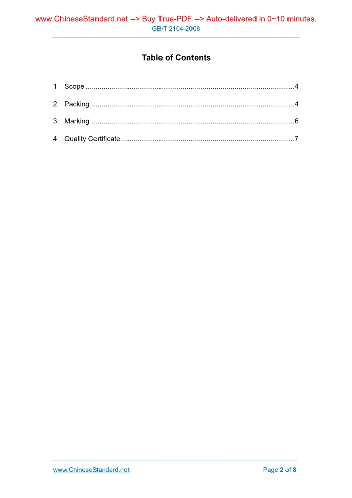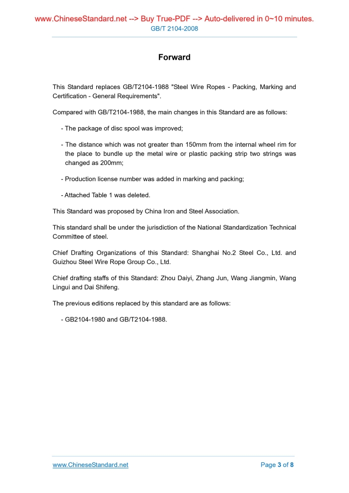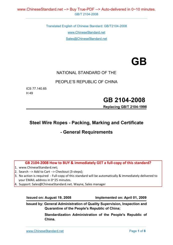 GB/T 2104-2008: Steel wire ropes -- Packing, marking and certificate -- General requirements---This is an excerpt. Full copy of true-PDF in English version (including equations, symbols, images, flow-chart, tables, and figures etc.), auto-downloaded/delivered in 9 seconds, can be purchased online: https://www.ChineseStandard.net/PDF.aspx/GBT2104-2008GB NATIONAL STANDARD OF THE PEOPLE’S REPUBLIC OF CHINA ICS 77.140.65 H 49 GB 2104-2008 Replacing GB/T 2104-1998 Steel Wire Ropes - Packing, Marking and Certificate - General Requirements Issued on. AUGUST 19, 2008 Implemented on. APRIL 01, 2009 Issued by. General Administration of Quality Supervision, Inspection and Quarantine of the People's Republic of China; Standardization Administration of the People's Republic of China. Table of Contents1 Scope... 4 2 Packing... 4 3 Marking... 6 4 Quality Certificate... 7 Forward This Standard replaces GB/T2104-1988 "Steel Wire Ropes - Packing, Marking and Certification - General Requirements". Compared with GB/T2104-1988, the main changes in this Standard are as follows. - The package of disc spool was improved; - The distance which was not greater than 150mm from the internal wheel rim for the place to bundle up the metal wire or plastic packing strip two strings was changed as 200mm; - Production license number was added in marking and packing; - Attached Table 1 was deleted. This Standard was proposed by China Iron and Steel Association. This standard shall be under the jurisdiction of the National Standardization Technical Committee of steel. Chief Drafting Organizations of this Standard. Shanghai No.2 Steel Co., Ltd. and Guizhou Steel Wire Rope Group Co., Ltd. Chief drafting staffs of this Standard. Zhou Daiyi, Zhang Jun, Wang Jiangmin, Wang Lingui and Dai Shifeng. The previous editions replaced by this standard are as follows. - GB2104-1980 and GB/T2104-1988. Steel Wire Ropes - Packing, Marking and Certificate - General Requirements1 ScopeThis Standard specifies items such as packing method, marking and quality certificate for steel wire ropes. This Standard is applicable to general requirements on packing, marking and quality specification of steel wire ropes. If there are specific requirements in the product standard or from the demander, it shall be implemented according to corresponding requirements.2 Packing2.1 Generally, each piece of steel wire rope shall be individually packed. 2.2 Packing methods include the following three methods. The packing type shall be indicated in the Contract. If unindicted, it shall be selected by the supplier. 2.2.1 Method I. packing without disc spool Materials such as galvanized wire (or low carbon steel wire), steel strips or those without influence on the surface quality of steel wire ropes and that meet the requirements of bundling shall be adopted to bundle up the steel wire ropes firmly and uniformly; damp-proof materials shall be adopted to pack and wind them tightly. Metal wires (strips) are adopted to fasten the ends of packing materials; finally galvanized wires (or low carbon steel wires), steel strips or plastic packing strips are adopted to bundle up the steel wire ropes firmly and uniformly; whether transversal or longitudinal bundling (See Figure 1) to be adopted shall be considered according to sizes and weight of steel wire rope coils. 2.2.3 (Box) Packing 2.2.3.1 Packing shall be carried out firstly according to those specified in 2.2.1 or 2.2.2 and then steel wire ropes are packed into dry and clean bucket (box); the bucket (box) shall be sealed tightly for the purpose of anti-dirt or damp-proof. 2.2.3.2 As for packed steel wire ropes in coils on which there is requirements, after single piece is attached with labels, multiple pieces are allowable to be in the same bucket (box); as for steel wire ropes in nude packing, damp-proof materials shall be added in the bucket (box).3 MarkingThe external package of steel wire ropes shall be accompanied with firm and clear plates and the following items shall be indicated on them.4 Quality CertificateThe delivered steel wire ropes shall be accompanied with quality certificate with the following items indicated in it. ......Source: Above contents are excerpted from the full-copy PDF -- translated/reviewed by: www.ChineseStandard.net / Wayne Zheng et al. Tips & Frequently Asked Questions:Question 1: How long will the true-PDF of English version of GB/T 2104-2008 be delivered?Answer: The full copy PDF of English version of GB/T 2104-2008 can be downloaded in 9 seconds, and it will also be emailed to you in 9 seconds (double mechanisms to ensure the delivery reliably), with PDF-invoice.Question 2: Can I share the purchased PDF of GB/T 2104-2008_English with my colleagues?Answer: Yes. The purchased PDF of GB/T 2104-2008_English will be deemed to be sold to your employer/organization who actually paid for it, including your colleagues and your employer's intranet.Question 3: Does the price include tax/VAT?Answer: Yes. Our tax invoice, downloaded/delivered in 9 seconds, includes all tax/VAT and complies with 100+ countries' tax regulations (tax exempted in 100+ countries) -- See Avoidance of Double Taxation Agreements (DTAs): List of DTAs signed between Singapore and 100+ countriesQuestion 4: Do you accept my currency other than USD?Answer: Yes. www.ChineseStandard.us -- GB/T 2104-2008 -- Click this link and select your country/currency to pay, the exact amount in your currency will be printed on the invoice. Full PDF will also be downloaded/emailed in 9 seconds.Question 5: Should I purchase the latest version GB/T 2104-2008?Answer: Yes. Unless special scenarios such as technical constraints or academic study, you should always prioritize to purchase the latest version GB/T 2104-2008 even if the enforcement date is in future. Complying with the latest version means that, by default, it also complies with all the earlier versions, technically.How to buy and download a true PDF of English version of GB/T 2104