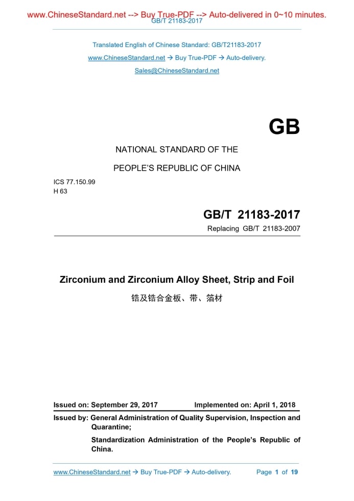 GB/T 21183-2017: Zirconium and Zirconium Alloy Sheet, Strip and Foil Delivery: 9 seconds. True-PDF full-copy in English & invoice will be downloaded + auto-delivered via email. See step-by-step procedure Status: Valid GB/T 21183: Historical versions