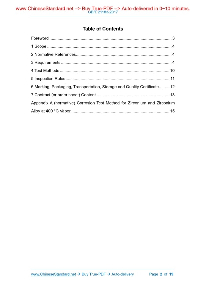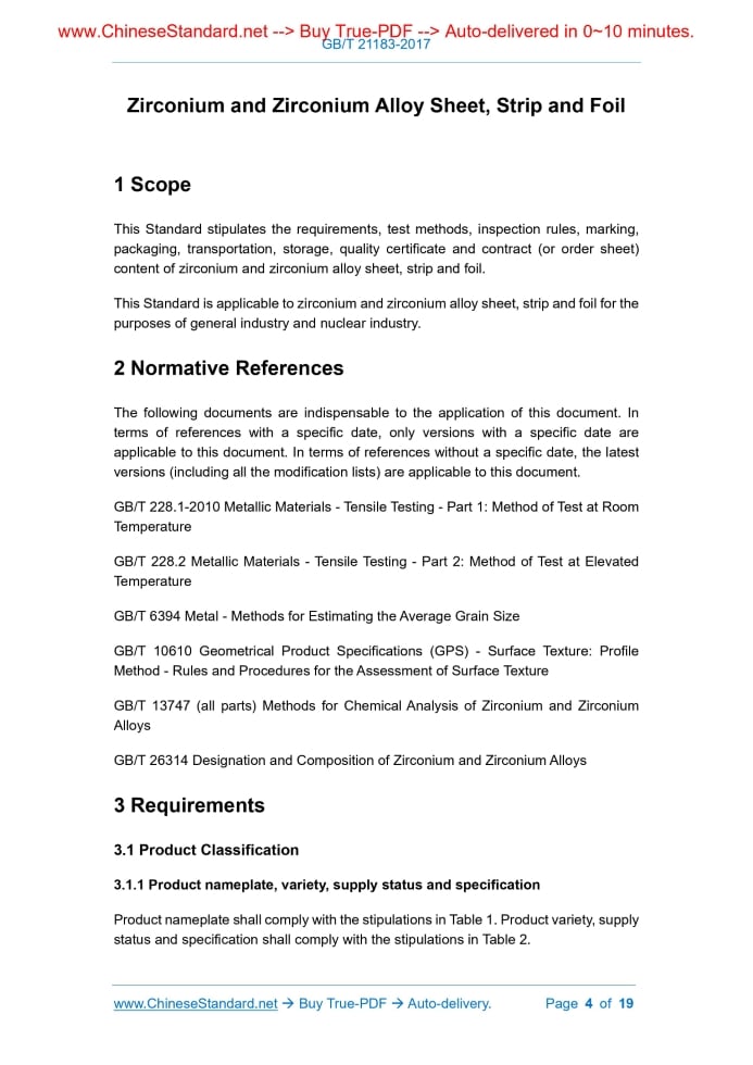 Similar standardsGB/T 21183-2017: Zirconium and Zirconium Alloy Sheet, Strip and Foil---This is an excerpt. Full copy of true-PDF in English version (including equations, symbols, images, flow-chart, tables, and figures etc.), auto-downloaded/delivered in 9 seconds, can be purchased online: https://www.ChineseStandard.net/PDF.aspx/GBT21183-2017NATIONAL STANDARD OF THE PEOPLE’S REPUBLIC OF CHINA ICS 77.150.99 H 63 Replacing GB/T 21183-2007 Zirconium and Zirconium Alloy Sheet, Strip and Foil ISSUED ON: SEPTEMBER 29, 2017 IMPLEMENTED ON: APRIL 1, 2018 Issued by: General Administration of Quality Supervision, Inspection and Quarantine; Standardization Administration of the People’s Republic of China. Table of ContentsForeword ... 3 1 Scope ... 4 2 Normative References ... 4 3 Requirements ... 4 4 Test Methods ... 10 5 Inspection Rules ... 11 6 Marking, Packaging, Transportation, Storage and Quality Certificate ... 12 7 Contract (or order sheet) Content ... 13 Appendix A (normative) Corrosion Test Method for Zirconium and Zirconium Alloy at 400 °C Vapor ... 15ForewordThis Standard was drafted in accordance with the rules in GB/T 1.1-2009. This Standard serves as a replacement of GB/T 21183-2007 Zirconium and Zirconium Alloy Sheet, Strip and Foil. In comparison with GB/T 21183-2007, there are several main technical changes as follows: ---Product specification is refined; ---Table of chemical composition is deleted; requirements in GB/T 26314 are implemented; ---In dimensions and allowable deviations, the allowable deviations for thickness and width are refined; requirements towards unevenness are added; ---Mechanical properties are adjusted; ---Requirements towards ultrasonic inspection are added; ---Requirements towards surface roughness are added; ---Pickling process of sample preparation in Appendix A is adjusted. This Standard was proposed by China Nonferrous Metals Industry Association. This Standard shall be under the jurisdiction of National Technical Committee 243 on Nonferrous Metals of Standardization Administration of China (SAC/TC 243). The drafting organizations of this Standard: Western Energy Material Technologies Co., Ltd., Northwest Institute for Non-ferrous Metal Research, Western Titanium Technologies Co., Ltd., State Nuclear BAO TI Zirconium Industry Company, Guangdong Orient Zirconic Industry Sci & Tech Co., Ltd., Baoji Titanium Industry Co., Ltd., China Nonferrous Metals Techno-Economic Research Institute. The main drafters of this Standard: Jiao Yonggang, Li Zhongkui, Lijia, Zhang Jianjun, Li Laiping, Guo Linjiang, Wuhua, Gaobo, Xu Xiaojun, Ma Zhongxian, Wu Yanhua. The issuance of the previous versions of the standard being replaced by this Standard is as follows: ---GB/T 21183-2007. Zirconium and Zirconium Alloy Sheet, Strip and Foil1 ScopeThis Standard stipulates the requirements, test methods, inspection rules, marking, packaging, transportation, storage, quality certificate and contract (or order sheet) content of zirconium and zirconium alloy sheet, strip and foil. This Standard is applicable to zirconium and zirconium alloy sheet, strip and foil for the purposes of general industry and nuclear industry.2 Normative ReferencesThe following documents are indispensable to the application of this document. In terms of references with a specific date, only versions with a specific date are applicable to this document. In terms of references without a specific date, the latest versions (including all the modification lists) are applicable to this document. GB/T 228.1-2010 Metallic Materials - Tensile Testing - Part 1: Method of Test at Room Temperature GB/T 228.2 Metallic Materials - Tensile Testing - Part 2: Method of Test at Elevated Temperature GB/T 6394 Metal - Methods for Estimating the Average Grain Size GB/T 10610 Geometrical Product Specifications (GPS) - Surface Texture: Profile Method - Rules and Procedures for the Assessment of Surface Texture GB/T 13747 (all parts) Methods for Chemical Analysis of Zirconium and Zirconium Alloys GB/T 26314 Designation and Composition of Zirconium and Zirconium Alloys3 Requirements3.1 Product Classification 3.1.1 Product nameplate, variety, supply status and specification Product nameplate shall comply with the stipulations in Table 1. Product variety, supply status and specification shall comply with the stipulations in Table 2. Table 1 -- Product Nameplate Table 2 -- Product Variety, Supply Status and Specification Unit: millimeter Table 2 (continued from previous page) Unit: millimeter 3.1.2 Product designation Product designation shall be expressed in accordance with the sequence: product name, standard serial No., nameplate, supply status and specification. Please see designation examples as follows: Example 1: Zr-0 manufactured, cold processing status of foil, thickness: 0.05 mm, width: 100 mm and length: L mm, shall be marked as: foil GB/T 21183-2017 Zr-0 Y 0.05 100 L. Example 2: Zr-2 manufactured, annealing status of strip, thickness: 1.0 mm, width: 100 mm and length: L mm, shall be marked as: strip GB/T 21183-2017 Zr-2 M 1.0 100 L. Classification Nameplate General Industry Nuclear Industry Variety Foil Strip Sheet Variety Supply Status Supply Status Thickness Width Length Thickness Width Length Cold Processing Status (Y) Annealing Status (M) Cold Processing Status (Y) Annealing Status (M) Cold Processing Status (Y) Annealing Status (M) Thermal Processing Status (R) Annealing Status (M) NOTE: when the demand-side indicates in the contract (or order sheet), stress-relieving annealing status (m) of products may be provided. Example 3: Zr-4 manufactured, thermal processing status of sheet, thickness: 10 mm, width: 600 mm and length: L mm, shall be marked as: sheet GB/T 21183- 2017 Zr-4 R 10.0 600 L. 3.2 Chemical Composition Product’s chemical composition shall comply with the requirements in GB/T 26314. 3.3 Dimensions and Allowable Deviation 3.3.1 Dimensions and allowable deviation for sheet, strip and foil are shown