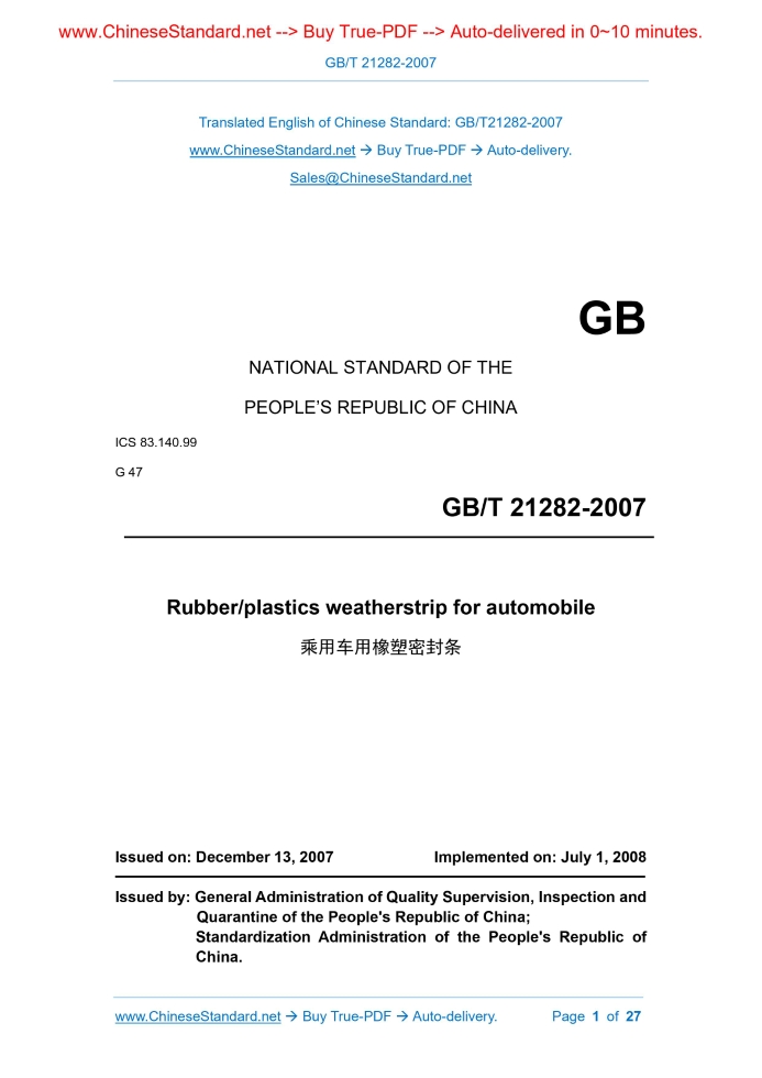 GB/T 21282-2007: Rubber/plastics weatherstrip for automobile Delivery: 9 seconds. True-PDF full-copy in English & invoice will be downloaded + auto-delivered via email. See step-by-step procedure Status: Valid