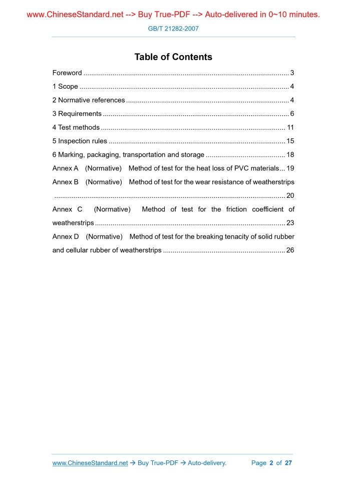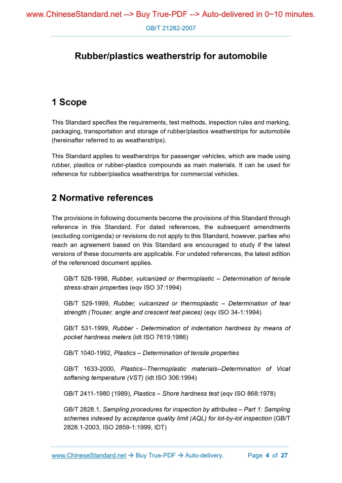 Similar standardsGB/T 21282-2007: Rubber/plastics weatherstrip for automobile---This is an excerpt. Full copy of true-PDF in English version (including equations, symbols, images, flow-chart, tables, and figures etc.), auto-downloaded/delivered in 9 seconds, can be purchased online: https://www.ChineseStandard.net/PDF.aspx/GBT21282-2007NATIONAL STANDARD OF THE PEOPLE’S REPUBLIC OF CHINA ICS 83.140.99 G 47 Rubber/plastics weatherstrip for automobile Issued on. DECEMBER 13, 2007 Implemented on. JULY 1, 2008 Issued by. General Administration of Quality Supervision, Inspection and Quarantine of the People's Republic of China; Standardization Administration of the People's Republic of China. Table of ContentsForeword... 3 1 Scope... 4 2 Normative references... 4 3 Requirements... 6 4 Test methods... 11 5 Inspection rules... 15 6 Marking, packaging, transportation and storage... 18 Annex A (Normative) Method of test for the heat loss of PVC materials... 19 Annex B (Normative) Method of test for the wear resistance of weatherstrips ... 20 Annex C (Normative) Method of test for the friction coefficient of weatherstrips... 23 Annex D (Normative) Method of test for the breaking tenacity of solid rubber and cellular rubber of weatherstrips... 26ForewordAnnex A, Annex B, Annex C and Annex D of this Standard are normative. This Standard was proposed by the China Petroleum and Chemical Industry Association. This Standard shall be under the jurisdiction of Subcommittee on Rubber Miscellaneous Goods of National Technical Committee on Rubber and Rubber Products. The drafting organizations of this Standard. SAIC-METZELER Sealing Systems Co., Ltd., Beijing Wanyuan-GDX Automobile Sealing Products Co., Ltd., Hongyang Sealing Systems Company of Guizhou Guihang Automobile Components Co., Ltd., Tianjin Xingguang Rubber/Plastics Co., Ltd., Chongqing Jiaxuan Automobile Sealing Systems Co., Ltd., Xiamen Baiji Sealing Materials Co., Ltd., Hubei Nuoke Rubber/Plastics Sealing Technology Co., Ltd. The main drafters of this Standard. Chen Haiyan, Wang Xinhui, Chen Jie, Chen Daye, Deng Mingxiang, He Wenbing, You Jianfeng. This Standard was made for the first time. Rubber/plastics weatherstrip for automobile1 ScopeThis Standard specifies the requirements, test methods, inspection rules and marking, packaging, transportation and storage of rubber/plastics weatherstrips for automobile (hereinafter referred to as weatherstrips). This Standard applies to weatherstrips for passenger vehicles, which are made using rubber, plastics or rubber-plastics compounds as main materials. It can be used for reference for rubber/plastics weatherstrips for commercial vehicles.2 Normative referencesThe provisions in following documents become the provisions of this Standard through reference in this Standard. For dated references, the subsequent amendments (excluding corrigenda) or revisions do not apply to this Standard, however, parties who reach an agreement based on this Standard are encouraged to study if the latest versions of these documents are applicable. For undated references, the latest edition of the referenced document applies. GB/T 528-1998, Rubber, vulcanized or thermoplastic – Determination of tensile stress-strain properties (eqv ISO 37.1994) GB/T 529-1999, Rubber, vulcanized or thermoplastic – Determination of tear strength (Trouser, angle and crescent test pieces) (eqv ISO 34-1.1994) GB/T 531-1999, Rubber - Determination of indentation hardness by means of pocket hardness meters (idt ISO 7619.1986)3 Requirements3.1 Dimensions and tolerances The cross-section shapes, dimensions and tolerances of products, and the lengths and tolerances of products shall be as required by design drawings; if it is not explicitly specified in drawings, the supplier and the purchaser shall choose and use in accordance with the classes specified in GB/T 3672.1. 3.2 Appearance quality The appearance quality of weatherstrips shall be as specified. 3.3 Performance requirements for materials The matrix materials of weatherstrips can be based on EPDM, PVC and TPE, whose performance requirements shall be as specified in Tables 1 ~ 4.The performance requirements for other matrix materials shall be as agreed by the supplier and the purchaser.4 Test methods4.1 Measurement of dimensions 4.2 Appearance measurement Use the visual inspection method for examination. 4.3 Material performance test methods 4.3.1 The determination of the hardness of rubber materials shall be carried out using the method specified in GB/T 531-1999; the determination of the hardness of plastic and TPE materials shall be carried out using the method specified in GB/T 2411- 1980(1989). 4.4 Performance test methods of finished products 4.4.1 Quantity of test specimens Unless specified otherwise, three test specimens shall be cut out from different finished products which shall be of the length required by the test. 4.4.2 Corner binding force (joint breaking tenacity) test 4.4.3 The test of the wear resistance shall be carried out using the method specified in Annex B.5 Inspection rules5.1 Inspection classification 5.1.1 The inspection of weatherstrips include exit-factory inspection and type inspection. For the detailed inspection items see Table 10. 5.2 Batching, sampling plans and criteria 5.2.1 Batching The basal materials and finished products of weatherstrips shall be subjected to inspection by batch. Materials of the same type and the same production lot constitute a batch of basal materials. 5.2.2 Sampling plans and criteria 5.2.2.1 Exit-factory inspection 5.2.2.2.2 In normal production, the appearance quality, sectional shapes and dimensions and product length shall be subjected to inspection by batch; if it is a fail, then the batch of products is rejected. 5.2.2.2.3 The corner binding force (joint breaking tenacity), compression load, insertion force and pullout force of finished products shall be subjected to inspection by batch; the wear resistance shall be subjec