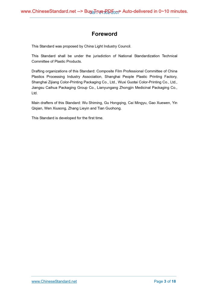 Similar standardsGB/T 21302-2007: General rules of laminated films and pouches for packaging---This is an excerpt. Full copy of true-PDF in English version (including equations, symbols, images, flow-chart, tables, and figures etc.), auto-downloaded/delivered in 9 seconds, can be purchased online: https://www.ChineseStandard.net/PDF.aspx/GBT21302-2007GB ICS 83.140.10 G 33 General rules of laminated films and pouches for packaging Issued on. DECEMBER 05, 2007 Implemented on. SEPTEMBER 01, 2008 Issued by. General Administration of Quality Supervision, Inspection and Quarantine of the People’s Republic of China; Standardization Administration of the People’s Republic of China. Table of ContentsForeword... 3 1 Scope... 4 2 Normative references... 4 3 Terms, definitions, symbols and abbreviations... 5 4 Classification... 8 5 Requirements... 9 6 Test methods... 13 7 Inspection rules... 17 8 Marking, packaging, transportation and storage... 18ForewordThis Standard was proposed by China Light Industry Council. This Standard shall be under the jurisdiction of National Standardization Technical Committee of Plastic Products. Drafting organizations of this Standard. Composite Film Professional Committee of China Plastics Processing Industry Association, Shanghai People Plastic Printing Factory, Shanghai Zijiang Color-Printing Packaging Co., Ltd., Wuxi Guotai Color-Printing Co., Ltd., Jiangsu Caihua Packaging Group Co., Lianyungang Zhongjin Medicinal Packaging Co., Ltd. Main drafters of this Standard. Wu Shiming, Gu Hongqing, Cai Mingyu, Gao Xuewen, Yin Qiqian, Wen Xiusong, Zhang Lieyin and Tian Guohong. This Standard is developed for the first time. General Rules of Laminated Films and Pouches for Packaging1 ScopeThis Standard specifies the terms, definitions, symbols, abbreviations, classification, requirements, test methods, inspection rules, packaging, transportation and storage of laminated films and pouches for packaging that are made of different materials through different lamination methods. This Standard applies to laminated films and pouches for food and non-food packaging; it is not applicable to laminated films and pouches for pharmaceutical packaging.2 Normative referencesThe articles contained in the following documents have become part of this document when they are quoted herein. For the dated documents so quoted, all subsequent modifications (excluding corrigendum’s contents) or revisions made thereafter do not apply to this Standard. However, the parties who reach an agreement according to this Standard are encouraged to study whether the latest versions of these documents may be used. For the undated documents so quoted, the latest versions (including all modification sheets) apply to this document. GB/T 191 Packaging - Pictorial marking for handling of goods (GB/T 191-2000, eqv ISO 780.1997) GB/T 1037-1988 Test method for water vapor transmission of plastic film and sheet - Cup method (neq ASTM E96.1980) GB/T 1038-2000 Plastics - Film and sheeting - Determination of gas transmission - Differential-pressure method (neq ISO 2556.1974) GB/T 1410-2006 Methods of test for volume resistivity and surface resistivity of solid electrical insulating materials (IEC 60093.1980, IDT) GB/T 1040.3-2006 Plastics - Determination of tensile properties - Part 3.Test conditions for films and sheets (ISO 527-3.1995, IDT) GB/T 2410-1980 Transparent plastics - Transmissivity and haze test (eqv ASTM D1003.1977) GB/T 2918-1998 Plastics - Standard atmospheres for conditioning and testing (idt ISO 291.1997)3 Terms, definitions, symbols and abbreviationsThe following terms, definitions, symbols and abbreviations apply to this Standard. 3.1 Terms, definitions and symbols 3.1.1 Material Here it refers to different types of resins, plastic films, coated films, paper, aluminum foil, etc. 3.1.2 Lamination method Dry lamination, wet lamination, wet lamination, extrusion lamination, coextru-lamination, etc. 3.2 Abbreviations4 Classification4.1 Classification by structure Products are divided into 4 categories, based on material structure, as shown in Table 1. 4.3 Classification by application Products are divided into food packaging and non-food packaging based on application.5 Requirements5.1 Appearance quality Appearance quality of films and pouches shall comply with the provisions in Table 2. 5.2 Printing quality 5.2.1 Gravure-printing Gravure-printing quality shall comply with the provisions of GB/T 7707-1987. 5.3 Specifications 5.3.1 Dimensional deviation of flat film Dimensional deviation of flat film in length is determined by both supplying-demanding sides through negotiation; dimensional deviation in width is ±2 mm; average width deviation is ±10%.6 Test methods6.1 Sample state adjustment and standard test environment Follow the standard environment prescribed in GB/T 2918-1998 and normal deviation range; air temperature is (23±2)°C; relative humidity is (50±10)%; state adjustment time is not les than 4 h; and test is carried out under this condition. 6.2 Appearance quality Visually test in natural light; and measure with the measuring tool of which the precision is not less than 0.5 mm. 6.3 Printing quality 6.4 Dimensional deviation 6.4.1 Dimensional deviation of films and pouches in length and width follows the provisions of GB/T 6673-2001. 6.4.2 Thickness deviation of films and pouches follow the provisions of GB/T 6672-2001. 6.5 Physical and mechanical properties 6.5.1 Pulling strength and elongation at break Follow the provisions of GB/T 1040.3-2006.Use strip sample; the length is ≥ 150 mm; the width is ≥ 15 mm; gauge length is (100±1) mm; tensile speed (no load) of the sample is (250±25) mm/min. Mount the test piece of which the diameter is 100 mm TO sample-film fixing ring; then puncture with a steel-needle, of which the diameter is 1.0 mm and the spherical top diameter is 0.5 mm, at speed of (50±5) mm/min; read the maximum load when the steel-needle penetrates the test piece. Te