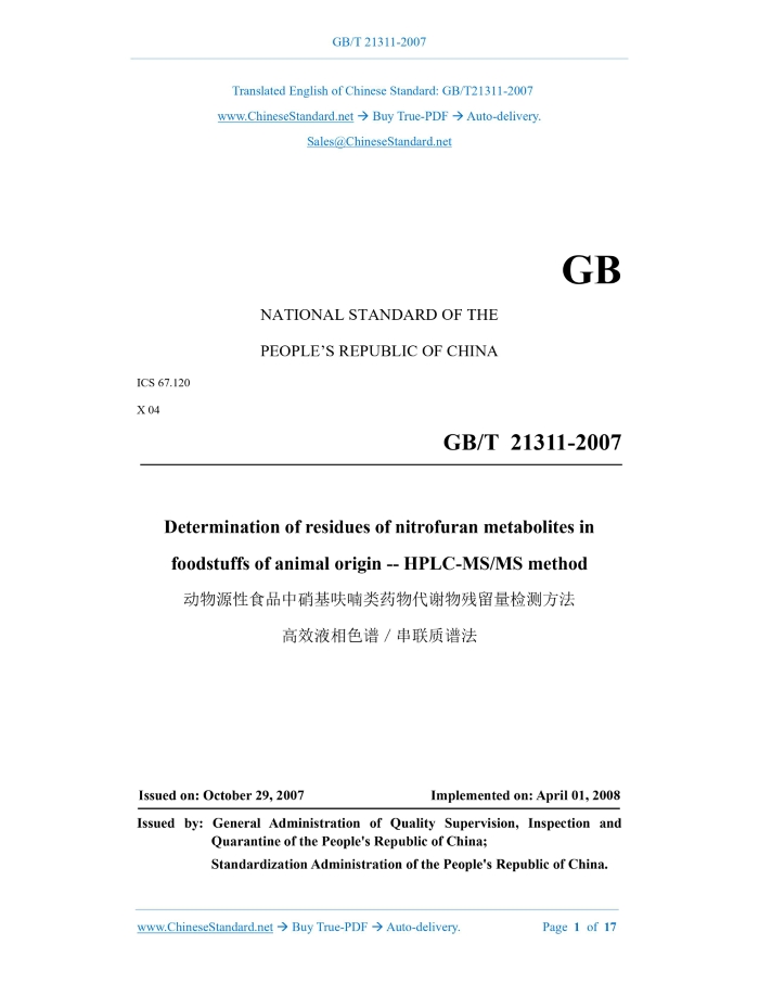 GB/T 21311-2007: Determination of residues of nitrofuran metabolites in foodstuffs of animal origin - HPLC-MS/MS method Delivery: 9 seconds. True-PDF full-copy in English & invoice will be downloaded + auto-delivered via email. See step-by-step procedure Status: Valid