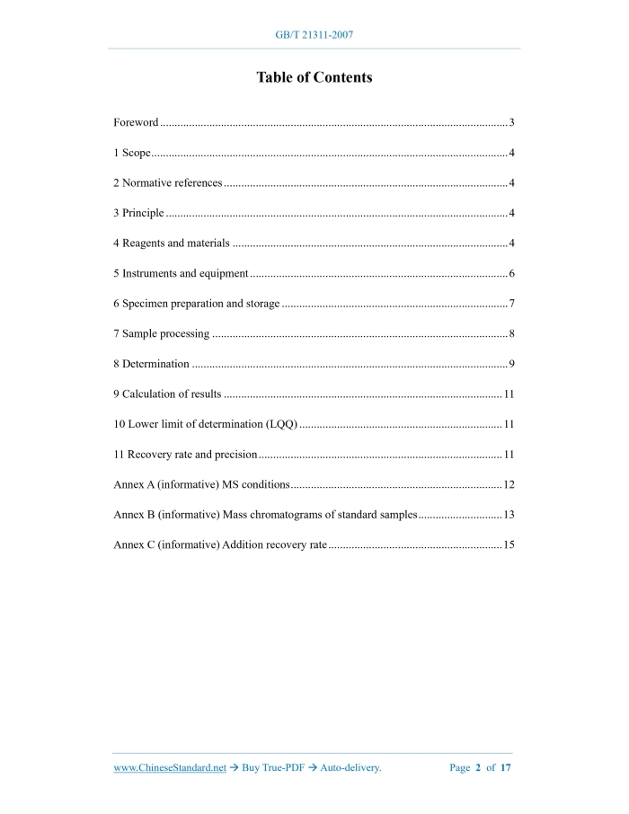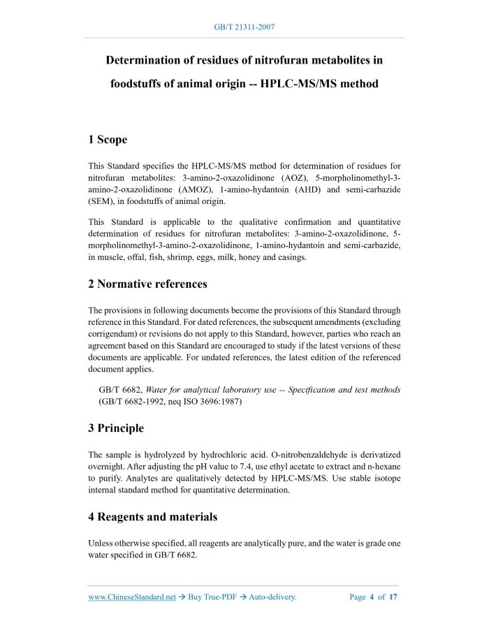 Similar standardsGB/T 21311-2007: Determination of residues of nitrofuran metabolites in foodstuffs of animal origin - HPLC-MS/MS method---This is an excerpt. Full copy of true-PDF in English version (including equations, symbols, images, flow-chart, tables, and figures etc.), auto-downloaded/delivered in 9 seconds, can be purchased online: https://www.ChineseStandard.net/PDF.aspx/GBT21311-2007 GB NATIONAL STANDARD OF THE PEOPLE’S REPUBLIC OF CHINA ICS 67.120 X 04 Determination of residues of nitrofuran metabolites in foodstuffs of animal origin -- HPLC-MS/MS method ISSUED ON: OCTOBER 29, 2007 IMPLEMENTED ON: APRIL 01, 2008 Issued by: General Administration of Quality Supervision, Inspection and Quarantine of the People's Republic of China; Standardization Administration of the People's Republic of China. Table of ContentsForeword ... 3 1 Scope ... 4 2 Normative references ... 4 3 Principle ... 4 4 Reagents and materials ... 4 5 Instruments and equipment ... 6 6 Specimen preparation and storage ... 7 7 Sample processing ... 8 8 Determination ... 9 9 Calculation of results ... 11 10 Lower limit of determination (LQQ) ... 11 11 Recovery rate and precision ... 11 Annex A (informative) MS conditions ... 12 Annex B (informative) Mass chromatograms of standard samples ... 13 Annex C (informative) Addition recovery rate ... 15 Determination of residues of nitrofuran metabolites in foodstuffs of animal origin -- HPLC-MS/MS method1 ScopeThis Standard specifies the HPLC-MS/MS method for determination of residues for nitrofuran metabolites: 3-amino-2-oxazolidinone (AOZ), 5-morpholinomethyl-3- amino-2-oxazolidinone (AMOZ), 1-amino-hydantoin (AHD) and semi-carbazide (SEM), in foodstuffs of animal origin. This Standard is applicable to the qualitative confirmation and quantitative determination of residues for nitrofuran metabolites: 3-amino-2-oxazolidinone, 5- morpholinomethyl-3-amino-2-oxazolidinone, 1-amino-hydantoin and semi-carbazide, in muscle, offal, fish, shrimp, eggs, milk, honey and casings.2 Normative referencesThe provisions in following documents become the provisions of this Standard through reference in this Standard. For dated references, the subsequent amendments (excluding corrigendum) or revisions do not apply to this Standard, however, parties who reach an agreement based on this Standard are encouraged to study if the latest versions of these documents are applicable. For undated references, the latest edition of the referenced document applies. GB/T 6682, Water for analytical laboratory use -- Specification and test methods (GB/T 6682-1992, neq ISO 3696:1987)3 PrincipleThe sample is hydrolyzed by hydrochloric acid. O-nitrobenzaldehyde is derivatized overnight. After adjusting the pH value to 7.4, use ethyl acetate to extract and n-hexane to purify. Analytes are qualitatively detected by HPLC-MS/MS. Use stable isotope internal standard method for quantitative determination.4 Reagents and materialsUnless otherwise specified, all reagents are analytically pure, and the water is grade one water specified in GB/T 6682. 4.1 Methanol: HPLC level. 4.2 Acetonitrile: HPLC level. 4.3 Ethyl acetate: HPLC level. 4.4 N-hexane: HPLC level. 4.5 Concentrated hydrochloric acid. 4.6 Sodium hydroxide. 4.7 Formic acid: HPLC level. 4.8 O-nitrobenzaldehyde. 4.9 Potassium phosphate trihydrate. 4.10 Ammonium acetate. 4.11 0.2 mol/L hydrochloric acid solution: Accurately measure 17 mL of concentrated hydrochloric acid (4.5). Use water to set the volume constant to 1 L. 4.12 2.0 mol/L sodium hydroxide solution: Accurately weigh 80 g of sodium hydroxide (4.6). Use water to dissolve and set the volume constant to 1 L. 4.13 0.1 mol/L o-nitrobenzaldehyde solution: Accurately weigh 1.5 g of o- nitrobenzaldehyde (4.8). Use methanol to dissolve and set the volume constant to 100 mL. 4.14 0.3 mol/L potassium phosphate solution: Accurately weigh 79.893 g of potassium phosphate trihydrate (4.9). Use water to dissolve and set the volume constant to 1 L. 4.15 Acetonitrile saturated n-hexane: Measure 80 mL of n-hexane into a 100 mL separating funnel. After adding an appropriate amount of acetonitrile, shake vigorously. After the distribution is balanced, discard the acetonitrile layer to obtain. 4.16 0.1% formic acid aqueous solution (containing 0.0005 mol/L ammonium acetate): Accurately measure 1 mL of formic acid (4.7) and 0.0386 g of ammonium acetate (4.10) into a 1 L volumetric flask. Use water to set the volume constant to 1 L. 4.17 Standard material: 3-amino-2-oxazolidinone, 5-morpholinomethyl-3-amino-2- oxazolidinone, 1-amino-hydantoin and semi-carbazide. The purity is ≥ 99%. 4.18 Internal standard substances: Internal standard substance of 3-amino-2- oxazolidinone, D4-AOZ; internal standard substance of 5-morpholinomethyl-3-amino- 2-oxazolidinone, D5-AMOZ; internal standard substance of 1-amino-hydantoin, 13C- AHD; and internal standard substance of semi-carbazide, 13C15N-SEM. The purity is ≥ 99%. 5.3 Analytical balance: resolution is 0.0001 g, 0.01 g. 5.4 Homogenizer: 10000 r/min. 5.5 Oscillator. 5.6 Constant temperature box. 5.7 pH meter: measurement accuracy is ±0.02pH unit. 5.8 Centrifuge: 10000 r/min. 5.9 Nitrogen blowing instrument. 5.10 Vortex mixer. 5.11 Volumetric flasks: 1 L, 100 mL, 10 mL. 5.12 Stoppered plastic centrifuge tube: 50 mL. 5.13 Graduated test tube: 10 mL. 5.14 Pipette guns: 5 mL, 1 mL, 100 μL.6 Specimen preparation and storage6.1 Muscle, viscera, fish and shrimp Take about 500 g of representative sample from the original sample. Use the tissue masher to thoroughly mash and mix. Divide into two equal parts. Respectively put them into clean containers as samples. Seal. Indicate the mark. Store the specimens in a freezer at -18°C from light. 6.2 Casing Take about 100 g of representative sample from the original sample. Use scissors to cut into squares with side length < 5 mm. Divide into two equal parts after mixing. Respectively put them into clean containers as samples. Seal. Ind