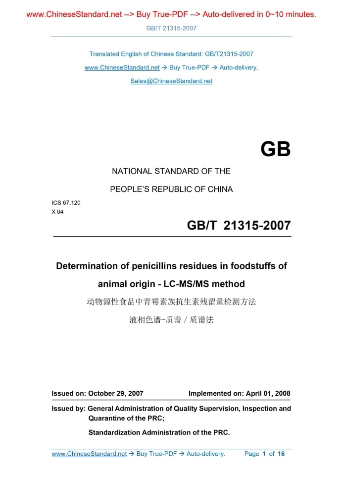 GB/T 21315-2007: Determination of penicillins residues in foodstuffs of animal origin - LC-MS/MS method Delivery: 9 seconds. True-PDF full-copy in English & invoice will be downloaded + auto-delivered via email. See step-by-step procedure Status: Valid