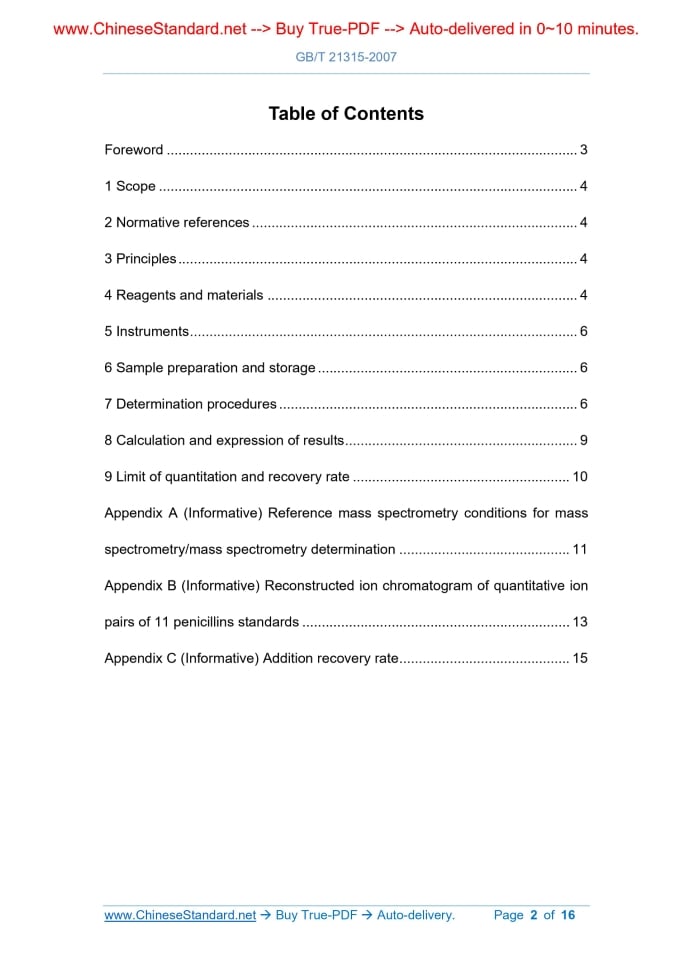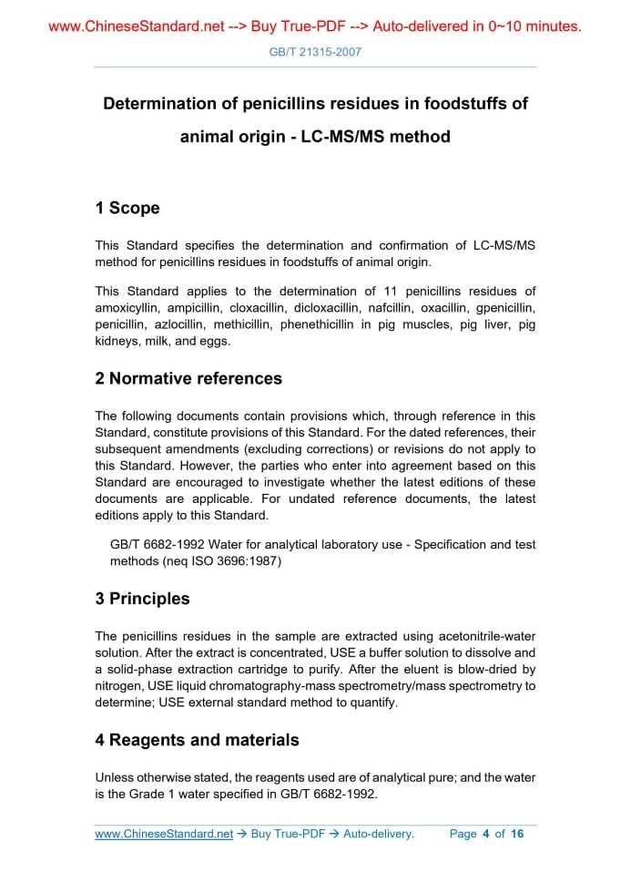 Similar standardsGB/T 21315-2007: Determination of penicillins residues in foodstuffs of animal origin - LC-MS/MS method---This is an excerpt. Full copy of true-PDF in English version (including equations, symbols, images, flow-chart, tables, and figures etc.), auto-downloaded/delivered in 9 seconds, can be purchased online: https://www.ChineseStandard.net/PDF.aspx/GBT21315-2007 NATIONAL STANDARD OF THE PEOPLE’S REPUBLIC OF CHINA ICS 67.120 X 04 Determination of penicillins residues in foodstuffs of animal origin - LC-MS/MS method ISSUED ON: OCTOBER 29, 2007 IMPLEMENTED ON: APRIL 01, 2008 Issued by: General Administration of Quality Supervision, Inspection and Quarantine of the PRC; Standardization Administration of the PRC. Table of ContentsForeword ... 3 1 Scope ... 4 2 Normative references ... 4 3 Principles ... 4 4 Reagents and materials ... 4 5 Instruments ... 6 6 Sample preparation and storage ... 6 7 Determination procedures ... 6 8 Calculation and expression of results ... 9 9 Limit of quantitation and recovery rate ... 10 Appendix A (Informative) Reference mass spectrometry conditions for mass spectrometry/mass spectrometry determination ... 11 Appendix B (Informative) Reconstructed ion chromatogram of quantitative ion pairs of 11 penicillins standards ... 13 Appendix C (Informative) Addition recovery rate ... 15 Determination of penicillins residues in foodstuffs of animal origin - LC-MS/MS method1 ScopeThis Standard specifies the determination and confirmation of LC-MS/MS method for penicillins residues in foodstuffs of animal origin. This Standard applies to the determination of 11 penicillins residues of amoxicyllin, ampicillin, cloxacillin, dicloxacillin, nafcillin, oxacillin, gpenicillin, penicillin, azlocillin, methicillin, phenethicillin in pig muscles, pig liver, pig kidneys, milk, and eggs.2 Normative referencesThe following documents contain provisions which, through reference in this Standard, constitute provisions of this Standard. For the dated references, their subsequent amendments (excluding corrections) or revisions do not apply to this Standard. However, the parties who enter into agreement based on this Standard are encouraged to investigate whether the latest editions of these documents are applicable. For undated reference documents, the latest editions apply to this Standard. GB/T 6682-1992 Water for analytical laboratory use - Specification and test methods (neq ISO 3696:1987)3 PrinciplesThe penicillins residues in the sample are extracted using acetonitrile-water solution. After the extract is concentrated, USE a buffer solution to dissolve and a solid-phase extraction cartridge to purify. After the eluent is blow-dried by nitrogen, USE liquid chromatography-mass spectrometry/mass spectrometry to determine; USE external standard method to quantify.4 Reagents and materialsUnless otherwise stated, the reagents used are of analytical pure; and the water is the Grade 1 water specified in GB/T 6682-1992. WEIGH about 5 g (accurate to 0.01 g) of sample in a 50 mL centrifuge tube; ADD 15 mL of acetonitrile-water solution (4.9); homogenize for 30 s; CENTRIFUGE at 4000 r/min for 5 min; TRANSFER the supernatant to a 50 mL centrifuge tube. TAKE another centrifuge tube; ADD 10 mL of acetonitrile-water solution (4.9); WASH the homogenizer head. USE a glass rod to mash the precipitate in the centrifuge tube; ADD the above-mentioned washing homogenizer head solution; oscillate on a vortex mixer for 1 min; CENTRIFUGE at 4000 r/min for 5 min. The supernatant is combined into a 50 mL centrifuge tube. The head is washed repeatedly using 10 mL of acetonitrile-water solution (4.9) and extracted once. The supernatant is combined into a 50 mL centrifuge tube. USE acetonitrile-water solution (4.9) to dilute to 40 mL. Accurately PIPETTE 20 mL into a 100 mL heart-shaped bottle. 7.1.2 Milk sample WEIGH 10 g (accurate to 0.01 g) of sample in a 50 mL centrifuge tube; ADD 20 mL of acetonitrile (4.9); homogeneous extraction for 30 s; CENTRIFUGE at 4000 r/min for 5 min; TRANSFER the supernatant to a 50 mL centrifuge tube. TAKE another centrifuge tube; ADD 10 mL of acetonitrile-water solution (4.9); WASH the homogenizer head. USE a glass rod to mash the precipitate in the centrifuge tube; ADD the above-mentioned washing homogenizer head solution; oscillate on a vortex mixer for 1 min; CENTRIFUGE at 4000 r/min for 5 min. The supernatant is combined into a 50 mL centrifuge tube. The head is washed repeatedly using 10 mL of acetonitrile-water solution (4.9) and extracted once. The supernatant is combined into a 50 mL centrifuge tube. USE acetonitrile- water solution (4.9) to dilute to 50 mL. Accurately PIPETTE 25 mL into a 100 mL heart-shaped bottle. The heart-shaped bottle is evaporated on a rotary evaporator (37 °C water bath) to remove acetonitrile (Easy-to-foam sample can be added with 4 mL of saturated sodium chloride solution). 7.2 Purification Immediately ADD 25 mL of phosphate buffer solution (4.11) to the heart-shaped bottle from which acetonitrile has been removed; vortex-mix for 1 min; USE 0.1 mol/L sodium hydroxide to adjust the pH to 8.5. At a rate of 1 mL/min, PASS the pretreated solid-phase extraction cartridge; first USE 2 mL of phosphate buffer solution (4.11) to rinse twice; then USE 1 mL of ultrapure water to rinse; and USE 3 mL of acetonitrile to elute (The speed is controlled at 1 mL/min). The eluent, at 45 °C, is blown dry with nitrogen. USE 0.025 mol/L phosphate buffer solution (4.12) to dilute to 1 mL. After passing through a 0.45 μm filter membrane, immediately USE liquid chromatograph-mass spectrometer/mass spectrometer to determine. reference retention time of 11 penicillins is approximately: amoxicyllin 8.5 min, ampicillin 12.2 min, azlocillin 16.5 min, methicillin 16.8 min, gpenicillin 18.1 min, penicillin 19.4 min, oxacillin 20.3 min, phenethicillin 20.5 min, cloxacillin 21.5 min, nafcillin 22.3 min, dicloxacillin 23.5 min. The reconstructed ion chromatogr