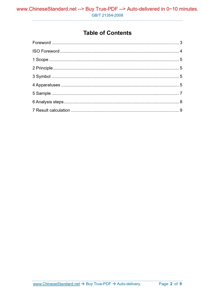Similar standardsGB/T 21354-2008: Powders -- Determination of tap density---This is an excerpt. Full copy of true-PDF in English version (including equations, symbols, images, flow-chart, tables, and figures etc.), auto-downloaded/delivered in 9 seconds, can be purchased online: https://www.ChineseStandard.net/PDF.aspx/GBT21354-2008Powders.Determination of tap density ICS 71.060.01 G10 National Standards of People's Republic of China GB/T 21354-2008/ISO 3953..1993 General method for determination of tap density of powder products (ISO 3953..1993, Metalogic Devices-Determination Information, IDT) 2008-01-11 released 2008-07-01 implementation General Administration of Quality Supervision, Inspection and Quarantine of the People's Republic of China Issued by China National Standardization Management Committee ForewordThis standard is equivalent to the use of ISO 3953..1993 "Determination of tap density of metal powder" (Third Edition) (English version). This standard was drafted according to ISO 3953..1993 "Determination of tap density of metal powders". This standard was proposed by China Petroleum and Chemical Industry Association. This standard is under the jurisdiction of the National Chemical Standardization Technical Committee Inorganic Chemical Branch (SAC/TC63/SC1). This standard was drafted by. Tianjin Chemical Research and Design Institute, Qingdao Entry-Exit Inspection and Quarantine Bureau. Drafters of this standard. Li Guangming, Zhao Zuliang, Wang Jun. GB/T 21354-2008/ISO 3953..1993 ISO Foreword ISO (International Organization for Standardization) is a worldwide federation of national standards bodies (ISO member bodies). Set international standards The work is usually done by ISO technical committees. Each member group has the right to participate if it is interested in a project established by a technical committee The work of the committee. International organizations (official or unofficial) that maintain contact with ISO can also participate in related work. In electrical engineering In terms of technical standardization, ISO maintains close cooperation with the International Electrotechnical Commission (IEC ). The draft international standards adopted by the technical committee shall be decided by voting by member groups. Publishing as an international standard requires membership of the group 75% voted through. International standard ISO 3953 "Sampling and test methods for powders (including hard metals)" by Technical Committee ISO /T C119, Powder Metallurgy Developed by subcommittee SC2. The third edition abridged and modified Table 2 in the second edition (ISO 3953. 1985). GB/T 21354-2008/ISO 3953..1993 General method for determination of tap density of powder products1 ScopeThis standard specifies the method for measuring the tap density, that is, the powder in the container is tapped under certain conditions.2 PrincipleUse a vibrating machine to vibrate the specified amount of powder in the container until the volume of the powder no longer decreases. The mass of the powder divided by the volume gives The result is the tap density. It can also be tapped by hand.3 SymbolSee Table 1. Table 1 Symbol description unit ρt Tap density Powder quality Volume after powder compaction g/cm3 cm34 Instruments4.1 Balance The weighing range and accuracy should meet the requirements of Table 2. Table 2 Tap density ρt/(g/cm ≥1 < 1 100 ± 0.5 50 ± 0.2 > 7 2 ~ 7 0.8 ~ 2 < 0.8 100 ± 0.5 50 ± 0.2 20 ± 0.1 10 ± 0.1 4.2 Glass measuring cylinder 4.2.1 The calibration volume is 100cm3, the height of the scale area is about 175mm, the sub-scale is 1cm3, and the measurement accuracy can reach ± 0.5cm3. 4.2.2 The calibration volume is 25 cm3, the height of the scale area is about 135 mm, and the sub-scale is 0.2 cm3. 4.2.3 A measuring cylinder with a nominal volume of 25 cm3 is mainly used for products with a tap density higher than 4 g/cm3. The tap density of the powder is Can also be used at low times. 4.3 Vibration instrument The bottom of the instrument is required to be strong and able to withstand the vibration of the measuring cylinder. Vibration should be carried out under sealed conditions to avoid any loosening of the surface layer. The stroke should be 3mm, and the vibration frequency should be between 100 times/min and 300 times/min. The vibration instrument is shown in Figure 1. You can also use a manual method. use a thick rubber pad (size about 100mm × 100mm × 5mm). GB/T 21354-2008/ISO 3953..1993 Picture 15 samples5.1 The sample quality required for each test is shown in Table 2. 5.2 In general, the test sample should maintain its original form, and in some cases the sample needs to be dried. However, if the sample is oxidizable It should be dried in vacuum or inert gas. If the sample contains volatile substances, it cannot be dried. 5.3 The test is carried out in 3 steps.6 Analysis steps6.1 Cleaning Use a brush to clean the glass graduated cylinder (4.2), or use a solvent (such as acetone) if necessary. If a solvent is used, the amount used again Wash thoroughly before the tube. It must be dried before use. GB/T 21354-2008/ISO 3953..1993 6.2 Weighing Weigh the sample with the balance (4.1) according to the sampling amount specified in Table 2, accurate to 0.1g. 6.3 Determination Place the sample in the graduated cylinder. Note that the sample should be flat. Place the measuring cylinder on the vibrating instrument (4.3) and vibrate the measuring cylinder until the sample body The product no longer decreases by 1). It is also allowed to use the following method of tapping. take the measuring cylinder by hand and vibrate on the thick rubber pad (4.3) until the sample volume no longer decreases until. Before the end of this process, the tapping should be light to avoid loosening of the sample surface 2). 6.4 Reading Read the volume of the surface that has reached the level after tapping. If the surface is uneven, read the average value of the highest and lowest points o