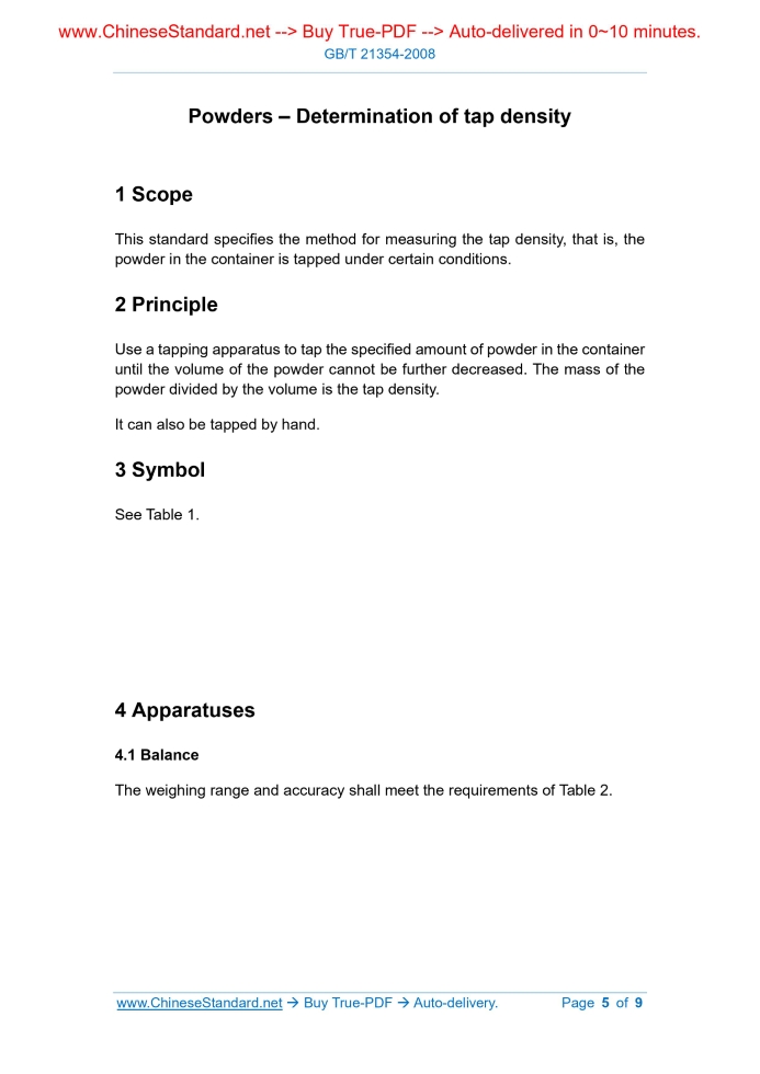 | GB/T 21354-2008 PDF EnglishUS$70.00 · In stock · Download in 9 seconds GB/T 21354-2008: Powders -- Determination of tap density Delivery: 9 seconds. True-PDF full-copy in English & invoice will be downloaded + auto-delivered via email. See step-by-step procedure Status: Valid