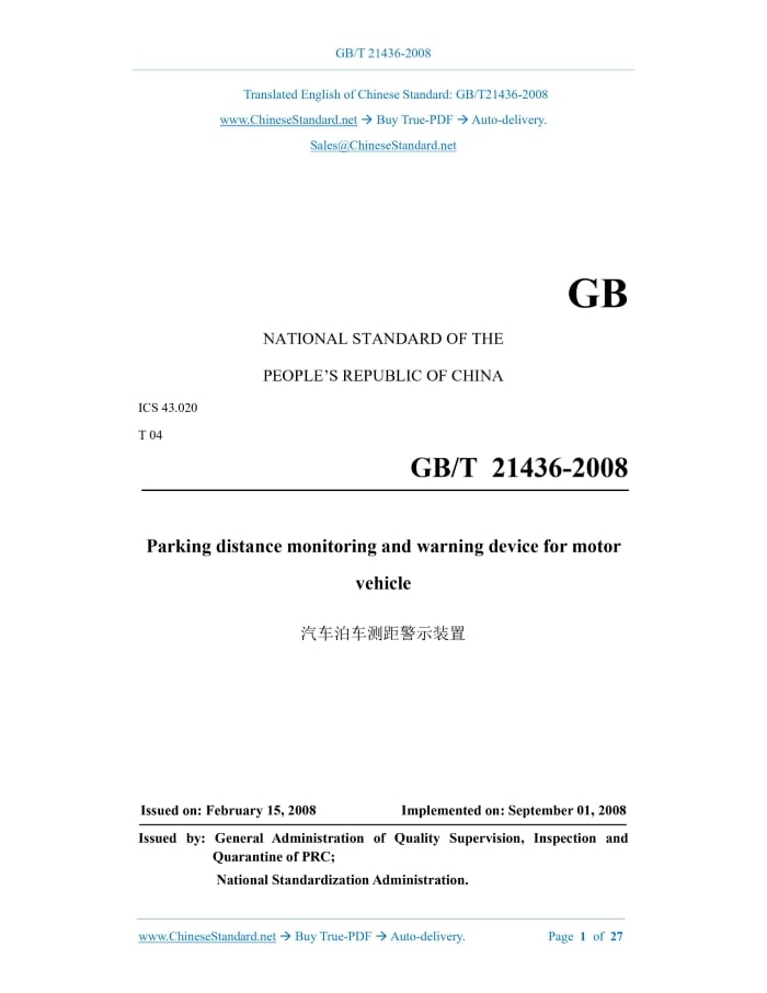 GB/T 21436-2008: Parking distance monitoring and warning device for motor vehicle Delivery: 9 seconds. True-PDF full-copy in English & invoice will be downloaded + auto-delivered via email. See step-by-step procedure Status: Valid