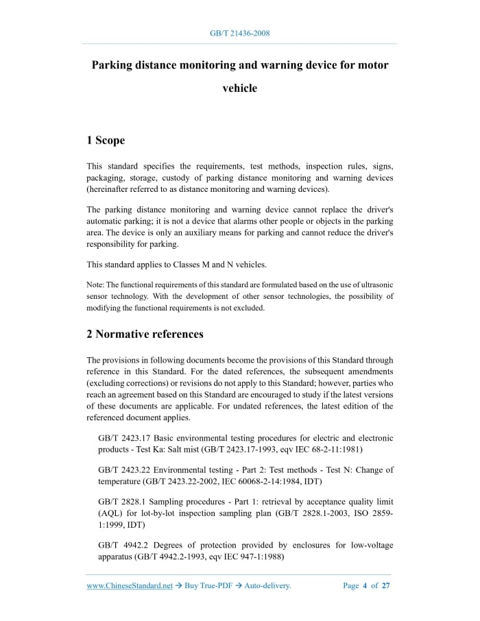 Similar standardsGB/T 21436-2008: Parking distance monitoring and warning device for motor vehicle---This is an excerpt. Full copy of true-PDF in English version (including equations, symbols, images, flow-chart, tables, and figures etc.), auto-downloaded/delivered in 9 seconds, can be purchased online: https://www.ChineseStandard.net/PDF.aspx/GBT21436-2008GB NATIONAL STANDARD OF THE PEOPLE’S REPUBLIC OF CHINA ICS 43.020 T 04 Parking distance monitoring and warning device for motor vehicle ISSUED ON: FEBRUARY 15, 2008 IMPLEMENTED ON: SEPTEMBER 01, 2008 Issued by: General Administration of Quality Supervision, Inspection and Quarantine of PRC; National Standardization Administration. Table of ContentsForeword ... 3 1 Scope ... 4 2 Normative references ... 4 3 Terms and definitions ... 5 4 Model compilation rules ... 6 4.1 Product code ... 7 4.2 Category code ... 7 4.3 Group code ... 7 4.4 Design No... 7 4.5 Variant code ... 7 5 Requirements ... 8 5.1 General provisions ... 8 5.2 Structure ... 10 5.3 Functional requirements ... 11 5.4 Protection performance ... 15 5.5 Abnormal power supply voltage resistance ... 16 5.6 Electromagnetic compatibility ... 17 5.7 Temperature resistance ... 17 5.8 Vibration resistance ... 18 5.9 Salt spray resistance ... 18 5.10 Temperature and humidity cyclic change resistance ... 18 6 Test method ... 19 6.1 Structural inspection ... 19 6.2 Functional inspection ... 19 6.3 Protection performance test ... 23 6.4 Abnormal power supply voltage resistance test ... 23 6.5 Electromagnetic compatibility test ... 23 6.6 Temperature resistance test ... 24 6.7 Vibration resistance test ... 24 6.8 Salt spray resistance test ... 24 6.9 Temperature and humidity cycle resistance test ... 24 7 Inspection rules ... 24 7.1 Qualified documents and marks ... 24 7.2 Inspection categories ... 24 7.3 Exit-factory inspection ... 24 7.4 Type inspection ... 25 7.5 Acceptance inspection ... 27 8 Marking, packaging, storage, preservation ... 27 Parking distance monitoring and warning device for motor vehicle1 ScopeThis standard specifies the requirements, test methods, inspection rules, signs, packaging, storage, custody of parking distance monitoring and warning devices (hereinafter referred to as distance monitoring and warning devices). The parking distance monitoring and warning device cannot replace the driver's automatic parking; it is not a device that alarms other people or objects in the parking area. The device is only an auxiliary means for parking and cannot reduce the driver's responsibility for parking. This standard applies to Classes M and N vehicles. Note: The functional requirements of this standard are formulated based on the use of ultrasonic sensor technology. With the development of other sensor technologies, the possibility of modifying the functional requirements is not excluded.2 Normative referencesThe provisions in following documents become the provisions of this Standard through reference in this Standard. For the dated references, the subsequent amendments (excluding corrections) or revisions do not apply to this Standard; however, parties who reach an agreement based on this Standard are encouraged to study if the latest versions of these documents are applicable. For undated references, the latest edition of the referenced document applies. GB/T 2423.17 Basic environmental testing procedures for electric and electronic products - Test Ka: Salt mist (GB/T 2423.17-1993, eqv IEC 68-2-11:1981) GB/T 2423.22 Environmental testing - Part 2: Test methods - Test N: Change of temperature (GB/T 2423.22-2002, IEC 60068-2-14:1984, IDT) GB/T 2828.1 Sampling procedures - Part 1: retrieval by acceptance quality limit (AQL) for lot-by-lot inspection sampling plan (GB/T 2828.1-2003, ISO 2859- 1:1999, IDT) GB/T 4942.2 Degrees of protection provided by enclosures for low-voltage apparatus (GB/T 4942.2-1993, eqv IEC 947-1:1988) GB/T 17619 Limits and methods of testing for immunity of electrical/electronic sub- assemblies in vehicles to electromagnetic radiation GB 18655 Limits and methods of measurement of radio disturbance characteristics for the protection of receivers used on board vehicles (GB 18655-2002, IDT IEC/CISPR 25:1995) GB/T 21437.2 Road vehicles - Electrical disturbances from conduction and coupling - Part 2: Electrical transient conduction along supply lines only (GB/T 21437.2-2008, ISO 7637-2:2004, IDT) QC/T 413-2002 Basic technical conditions of automotive electrical equipment3 Terms and definitionsThe following terms and definitions apply to this standard. 3.1 Parking distance monitoring & warning device An auxiliary device, that can detect obstacles within the monitoring range when the parking speed does not exceed 0.5 m/s, send a warning signal to the driver, improve the safety of automobile parking. 3.2 Sensor It is an important component of the distance monitoring & warning device, which is used to transmit and/or receive obstacle detection signals. 3.3 Controller It is an important component of the distance monitoring & warning device, which is used to control the sensor to send signals, process the sensor received signals, make the indicator work. 3.4 Indicator It is an important component of the distance monitoring & warning device, which is used to send a warning signal to the driver. 3.5 Monitoring range A specific three-dimensional spatial range in the parking area. 3.6 Standard test tube White PVC tube used to simulate obstacles when testing the monitoring range, including vertical standard test tube and horizontal standard test tube. Vertical standard test tube refers to a white PVC tube which has a diameter of 75 mm and a length of 1000 mm placed vertically. Horizontal standard test tube refers to a white PVC tube which has a diameter of 75 mm and a length of 300 mm placed horizontally. 3.7 Maximum detectable distance The maximum distance of the vertical standard test tube within the monitoring range, that can be continuously detected within 2/