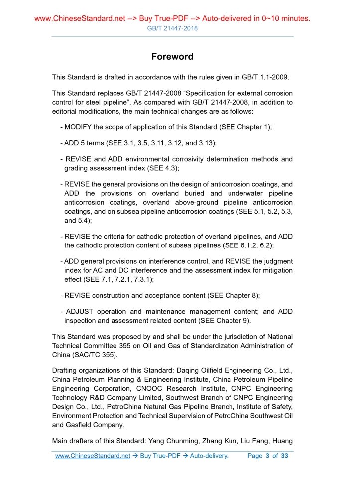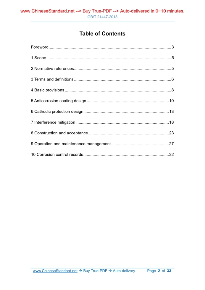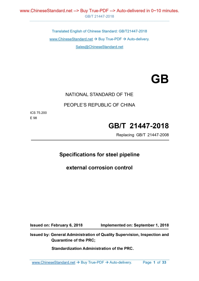 Similar standardsGB/T 21447-2018: Specifications for steel pipeline external corrosion control---This is an excerpt. Full copy of true-PDF in English version (including equations, symbols, images, flow-chart, tables, and figures etc.), auto-downloaded/delivered in 9 seconds, can be purchased online: https://www.ChineseStandard.net/PDF.aspx/GBT21447-2018GB NATIONAL STANDARD OF THE PEOPLE’S REPUBLIC OF CHINA ICS 75.200 E 98 Replacing GB/T 21447-2008 Specifications for steel pipeline external corrosion control Issued on: FEBRUARY 6, 2018 Implemented on: SEPTEMBER 1, 2018 Issued by. General Administration of Quality Supervision, Inspection and Quarantine of the PRC; Standardization Administration of the PRC. Table of ContentsForeword ... 3 1 Scope ... 5 2 Normative references ... 5 3 Terms and definitions ... 6 4 Basic provisions ... 8 5 Anticorrosion coating design ... 10 6 Cathodic protection design ... 13 7 Interference mitigation ... 18 8 Construction and acceptance ... 23 9 Operation and maintenance management ... 27 10 Corrosion control records ... 32ForewordThis Standard is drafted in accordance with the rules given in GB/T 1.1-2009. This Standard replaces GB/T 21447-2008 “Specification for external corrosion control for steel pipeline”. As compared with GB/T 21447-2008, in addition to editorial modifications, the main technical changes are as follows. - MODIFY the scope of application of this Standard (SEE Chapter 1); - ADD 5 terms (SEE 3.1, 3.5, 3.11, 3.12, and 3.13); - REVISE and ADD environmental corrosivity determination methods and grading assessment index (SEE 4.3); - REVISE the general provisions on the design of anticorrosion coatings, and ADD the provisions on overland buried and underwater pipeline anticorrosion coatings, overland above-ground pipeline anticorrosion coatings, and on subsea pipeline anticorrosion coatings (SEE 5.1, 5.2, 5.3, and 5.4); - REVISE the criteria for cathodic protection of overland pipelines, and ADD the cathodic protection content of subsea pipelines (SEE 6.1.2, 6.2); - ADD general provisions on interference control, and REVISE the judgment index for AC and DC interference and the assessment index for mitigation effect (SEE 7.1, 7.2.1, 7.3.1); - REVISE construction and acceptance content (SEE Chapter 8); - ADJUST operation and maintenance management content; and ADD inspection and assessment related content (SEE Chapter 9). This Standard was proposed by and shall be under the jurisdiction of National Technical Committee 355 on Oil and Gas of Standardization Administration of China (SAC/TC 355). Drafting organizations of this Standard. Daqing Oilfield Engineering Co., Ltd., China Petroleum Planning & Engineering Institute, China Petroleum Pipeline Engineering Corporation, CNOOC Research Institute, CNPC Engineering Technology R&D Company Limited, Southwest Branch of CNPC Engineering Design Co., Ltd., PetroChina Natural Gas Pipeline Branch, Institute of Safety, Environment Protection and Technical Supervision of PetroChina Southwest Oil and Gasfield Company. Main drafters of this Standard. Yang Chunming, Zhang Kun, Liu Fang, Huang Specifications for steel pipeline external corrosion control1 ScopeThis Standard specifies the minimum requirements for the design, construction, and management, etc. of steel pipeline (hereinafter known as pipeline for short) external corrosion control engineering, including basic provisions, anticorrosion coating design, cathodic protection design, interference mitigation, construction and acceptance, operation and maintenance management, and other contents. This Standard is applicable to the external corrosion control of oil, gas, and water pipelines, which are newly-built, expanded, and re-built overland and subsea, with conveying medium temperature of less than 100 °C.2 Normative referencesThe following documents are indispensable for the application of this document. For the dated references, only the versions with the dates indicated are applicable to this document. For the undated references, the latest version (including all the amendments) are applicable to this document. GB/T 8923.1 Preparation of steel substrates before application of paints and related products - Visual assessment of surface cleanliness - Part 1. Rust grades and preparation grades of uncoated steel substrates and of steel substrates after overall removal of previous GB/T 19292.1 Corrosion of metals and alloys - Corrosivity of atmospheres - Part 1. Classification GB/T 21246 Measurement method for cathodic protection parameters of buried steel pipelines GB/T 21448 Specification of cathodic protection for underground steel pipelines GB/T 23257 Polyethylene coating for buried steel pipeline GB 32167 Oil and gas pipeline integrity management specification GB/T 50538 Technical standard for anti-corrosion and insulation coating of buried steel pipeline GB/T 50698 Standard for AC interference mitigation of buried steel pipelines GB 50991 Technical standard for DC interference mitigation of buried steel pipeline GB/T 51172 Inspection code for in-service oil & gas pipeline GB/T 35988 Cathodic protection of offshore pipeline in petroleum, natural gas industries SY/T 0029 Specification of application for underground steel coupons SY/T 0087.1 Standard of steel pipeline and tank corrosion assessment - Steel pipeline external corrosion direct assessment SY/T 0315 Technological specification of external fusion bonded epoxy coating for steel pipeline SY/T 0407 Specification of Steel Surface Preparation Before Application of Paint SY/T 0414 Specification of polyolefin tape coating for steel pipeline SY/T 0447 Standard of coal tar epoxy coating for buried steel pipeline SY/T 5918 Technical specification for thermal insulation repair of buried steel pipeline exterior coating SY/T 6854 Technical standard of liquid epoxy external coating for buried steel pipeline SY/T 6878 Cathodic protection of submarine pipelines by galvanic anodes SY/T 6964 Specification o