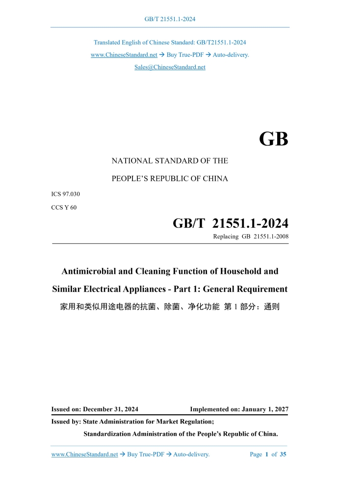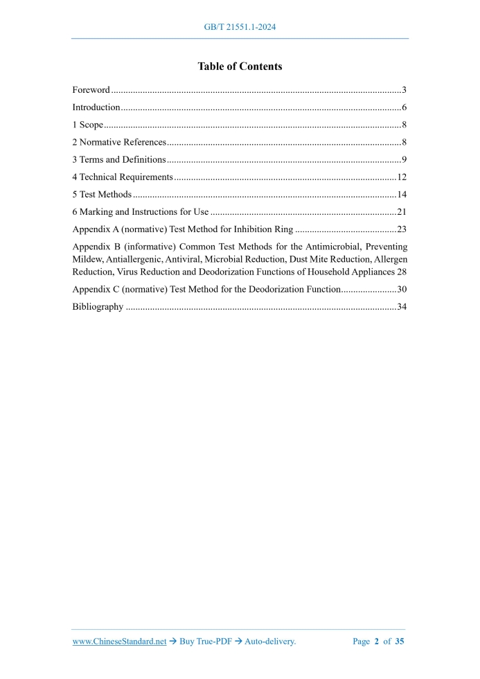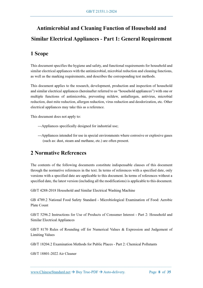 Similar standardsGB/T 21551.1-2024: Antimicrobial and cleaning function of household and similar electrical appliances - Part 1: General requirement---This is an excerpt. Full copy of true-PDF in English version (including equations, symbols, images, flow-chart, tables, and figures etc.), auto-downloaded/delivered in 9 seconds, can be purchased online: https://www.ChineseStandard.net/PDF.aspx/GBT21551.1-2024 GB NATIONAL STANDARD OF THE PEOPLE’S REPUBLIC OF CHINA ICS 97.030 CCS Y 60 Replacing GB 21551.1-2008 Antimicrobial and Cleaning Function of Household and Similar Electrical Appliances - Part 1.General Requirement Issued on. DECEMBER 31, 2024 Implemented on. JANUARY 1, 2027 Issued by. State Administration for Market Regulation; Standardization Administration of the People’s Republic of China. Table of ContentsForeword... 3 Introduction... 6 1 Scope... 8 2 Normative References... 8 3 Terms and Definitions... 9 4 Technical Requirements... 12 5 Test Methods... 14 6 Marking and Instructions for Use... 21 Appendix A (normative) Test Method for Inhibition Ring... 23 Appendix B (informative) Common Test Methods for the Antimicrobial, Preventing Mildew, Antiallergenic, Antiviral, Microbial Reduction, Dust Mite Reduction, Allergen Reduction, Virus Reduction and Deodorization Functions of Household Appliances 28 Appendix C (normative) Test Method for the Deodorization Function... 30 Bibliography... 341 ScopeThis document specifies the hygiene and safety, and functional requirements for household and similar electrical appliances with the antimicrobial, microbial reduction and cleaning functions, as well as the marking requirements, and describes the corresponding test methods. This document applies to the research, development, production and inspection of household and similar electrical appliances (hereinafter referred to as “household appliances”) with one or multiple functions of antimicrobia, preventing mildew, antiallergen, antivirus, microbial reduction, dust mite reduction, allergen reduction, virus reduction and deodorization, etc. Other electrical appliances may take this as a reference. This document does not apply to. ---Appliances specifically designed for industrial use; ---Appliances intended for use in special environments where corrosive or explosive gases (such as. dust, steam and methane, etc.) are often present.2 Normative ReferencesThe contents of the following documents constitute indispensable clauses of this document through the normative references in the text. In terms of references with a specified date, only versions with a specified date are applicable to this document. In terms of references without a specified date, the latest version (including all the modifications) is applicable to this document. GB/T 4288-2018 Household and Similar Electrical Washing Machine GB 4789.2 National Food Safety Standard - Microbiological Examination of Food. Aerobic Plate Count GB/T 5296.2 Instructions for Use of Products of Consumer Interest - Part 2.Household and Similar Electrical Appliances GB/T 8170 Rules of Rounding off for Numerical Values & Expression and Judgement of Limiting Values GB/T 18204.2 Examination Methods for Public Places - Part 2.Chemical Pollutants GB/T 18801-2022 Air Cleaner GB/T 18883 Standards for Indoor Air Quality GB 19489 Laboratories - General Requirements for Biosafety GB/T 21551.2 Antimicrobial and Cleaning Function of Household and Similar Electrical Appliances - Part 2.Particular Requirements for Material GB 44498 Household and Similar Electrical Appliances - Health Technical Specification HJ 865 Technical Specification for Olfactory Laboratory Construction HJ 1262 Ambient Air and Waste Gas - Determination of Odor - Triangle Odor Bag Method3 Terms and DefinitionsThe following terms and definitions are applicable to this document. 3.1 Antimicrobia 3.1.1 antimicrobia The process of adopting chemical, physical and other methods to kill bacteria, fungi and other microorganisms, or hinder their growth and reproduction, and make them inactive. [source. WS/T 466-2014, 3.14, modified]. 3.1.2 antimicrobial materials Materials that have the functions of killing bacteria, fungi and other microorganisms, or hindering their growth and reproduction, and making them inactive. 3.1.3 antimicrobial rate In the antimicrobia (3.1.1) test, the reduction in the count of bacteria, fungi and other microorganisms, which is expressed as a percentage. 3.1.4 inhibition ring The antimicrobial agent in the material is continuously dissolved and diffused through agar to form different gradients, thereby inhibiting the growth of bacteria around it and forming a transparent circle. 3.1.5 preventing mildew The process of adopting chemical, physical and other methods to kill mold or hinder its growth and reproduction and make it inactive.4 Technical Requirements4.1 Hygiene and Safety Requirements 4.1.1 Hygiene and safety requirements for the whole machine Household appliances that are explicitly stated to have the functions, such as. microbial reduction and cleaning, have executable product-related standards, and the hygiene and safety of the whole machine shall comply with the standards implemented by the product. If there is no executable product-related standard, except for the special use conditions specified by the appliance, the hazardous substances that may be produced shall all comply with the requirements of Table 1. 4.1.2 Hygiene and safety requirements for components and parts For materials that are explicitly stated to have the antimicrobial function and are in contact with food or in close contact with the human body during use, the diameter of the inhibition ring shall not be greater than 10 mm (including the diameter of the sample piece). 4.2 Requirements for Antimicrobial, Microbial Reduction and Cleaning Functions 4.2.1 Functional requirements for materials and components and parts For materials that are explicitly stated to have the antimicrobial, preventing 