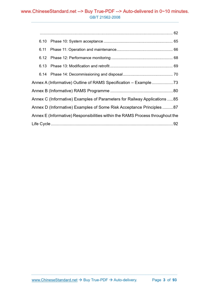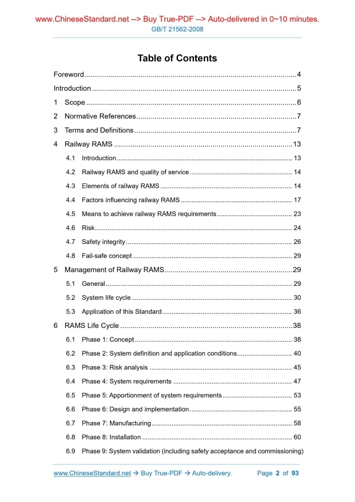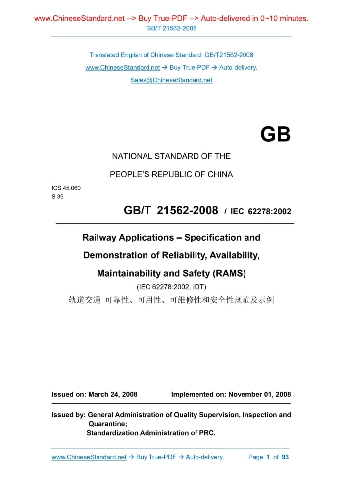 Similar standardsGB/T 21562-2008: Railway applications -- Specification and demonstration of Reliability, Availability, Maintainability and Safety (RAMS)---This is an excerpt. Full copy of true-PDF in English version (including equations, symbols, images, flow-chart, tables, and figures etc.), auto-downloaded/delivered in 9 seconds, can be purchased online: https://www.ChineseStandard.net/PDF.aspx/GBT21562-2008 GB NATIONAL STANDARD OF THE PEOPLE’S REPUBLIC OF CHINA ICS 45.060 S 39 GB/T 21562-2008 / IEC 62278.2002 Railway Applications – Specification and Demonstration of Reliability, Availability, Maintainability and Safety (RAMS) (IEC 62278.2002, IDT) Issued on. MARCH 24, 2008 Implemented on. NOVEMBER 01, 2008 Issued by. General Administration of Quality Supervision, Inspection and Quarantine; Standardization Administration of PRC. Table of ContentsForeword... 4 Introduction... 5 1 Scope... 6 2 Normative References... 7 3 Terms and Definitions... 7 4 Railway RAMS... 13 4.1 Introduction... 13 4.2 Railway RAMS and quality of service... 14 4.3 Elements of railway RAMS... 14 4.4 Factors influencing railway RAMS... 17 4.5 Means to achieve railway RAMS requirements... 23 4.6 Risk... 24 4.7 Safety integrity... 26 4.8 Fail-safe concept... 29 5 Management of Railway RAMS... 29 5.1 General... 29 5.2 System life cycle... 30 5.3 Application of this Standard... 36 6 RAMS Life Cycle... 38 6.1 Phase 1.Concept... 38 6.2 Phase 2.System definition and application conditions... 40 6.3 Phase 3.Risk analysis... 45 6.4 Phase 4.System requirements... 47 6.5 Phase 5.Apportionment of system requirements... 53 6.6 Phase 6.Design and implementation... 55 6.7 Phase 7.Manufacturing... 58 6.8 Phase 8.Installation... 60 6.9 Phase 9.System validation (including safety acceptance and commissioning) ... 62 6.10 Phase 10.System acceptance... 65 6.11 Phase 11.Operation and maintenance... 66 6.12 Phase 12.Performance monitoring... 68 6.13 Phase 13.Modification and retrofit... 69 6.14 Phase 14.Decommissioning and disposal... 70 Annex A (Informative) Outline of RAMS Specification – Example... 73 Annex B (Informative) RAMS Programme... 80 Annex C (Informative) Examples of Parameters for Railway Applications... 85 Annex D (Informative) Examples of Some Risk Acceptance Principles... 87 Annex E (Informative) Responsibilities within the RAMS Process throughout the Life Cycle... 92ForewordThis Standard equivalently adopts IEC 62278.2002 Railway Applications – Specification and Demonstration of Reliability, Availability, Maintainability and Safety (RAMS) (English version). This Standard equivalently translates IEC 62278.2002. For the benefit of use, this Standard makes the following editorial modifications. a) Modify “this International Standard” into “this Standard”; b) Delete the foreword of the international standard. The Annex A, B, C, D, E in this Standard are informative. This Standard was proposed by and shall be under the jurisdiction of National Technical Committee for Standardization of Traction Electrical Equipment and System. Drafting organizations of this Standard. Zhuzhou CSR Times Electric Co., Ltd., CSR Sifang Locomotives & Rolling Stock Co., Ltd., CSR Zhuzhou Electric Locomotive Co., Ltd., China Railway Electrification Survey Design & Research Institute, Tongji University, and Ministry of Railways – Research Institute of Standard and Metrology. Chief drafting staffs of this Standard. Yan Yunsheng, Fan Zuocheng, Liu Gui, Guo Liping, Gao Daoxing, Zhang Zhilong, Su Guanghui, Cheng Zuguo, and Hu Aichan.1 ScopeThis Standard defines RAMS in terms of reliability, availability, maintainability and safety and their interaction; defines a process, based on the system life cycle and tasks within it, for managing RAMS; enables conflicts between RAMS elements to be controlled and managed effectively.2 Normative ReferencesThe provisions in following documents become the provisions of this Standard through reference in this Standard. For dated references, the subsequent amendments (excluding corrigendum) or revisions do not apply to this Standard, however, parties who reach an agreement based on this Standard are encouraged to study if the latest versions of these documents are applicable. For undated references, the latest edition of the referenced document applies. GB/T 19001-2000 Quality Management Systems – Requirements (idt ISO 9001.2000)3 Terms and DefinitionsFor the purposes of this Standard, the following definitions apply. Ability of a product to be in a state to perform a required function under given conditions at a given instant of time or over a given time interval assuming that the required external resources are provided.4 Railway RAMSA system can be defined as an assembly of sub-systems and components, connected together in an organized way, to achieve specified functionality.5 Management of Railway RAMSThis representation is effective in showing verification and validation tasks within the life cycle. The objective of verification is to demonstrate that, for the specific inputs, the deliverables of each phase meet in all respects the requirements of that phase.6 RAMS Life CycleThis clause details objectives, requirements, deliverables and verification and validation activities to be undertaken throughout each life cycle phase. The scope and application of the requirements shall be assessed and adapted to meet the particular requirements of the system under consideration. The input to this phase shall include all relevant information, and where appropriate, data, necessary to meet the requirements of the phase, including the deliverables of phase 1.Annex A(Informative) Outline of RAMS Specification – Example In order to facilitate the application of this standard, a principal outline of a RAMS specification for railway systems is presented in this annex. This outline example relates to Figure 8 and Figure 9 of this standard and the corresponding descriptions of the life cycle phases detailed i