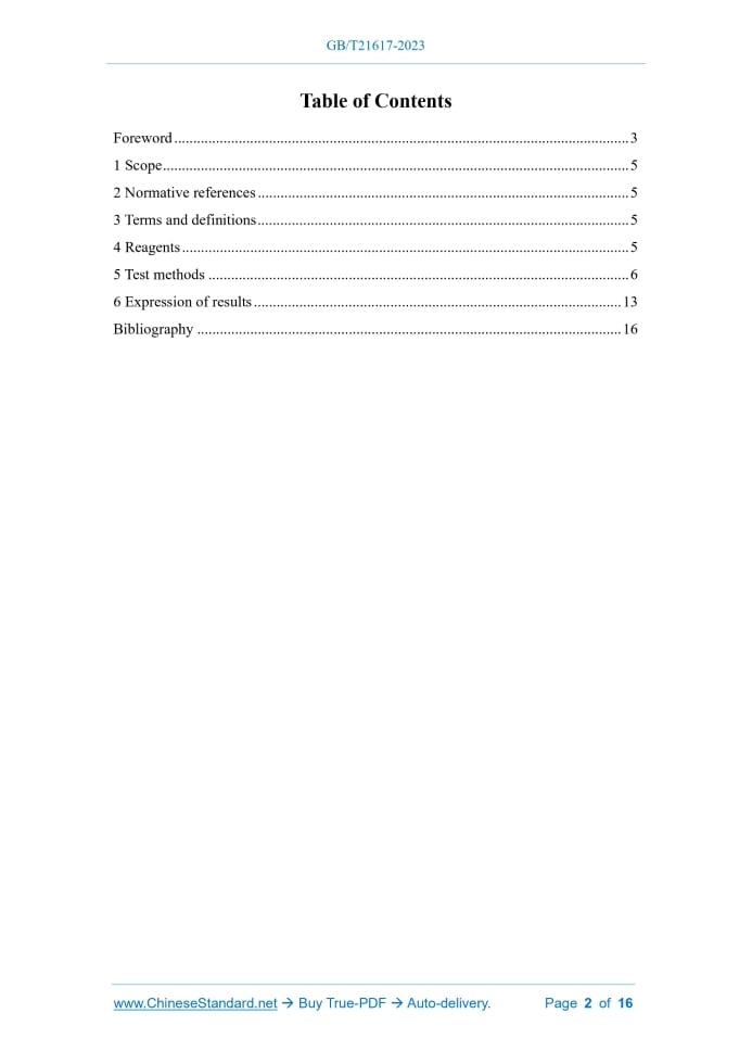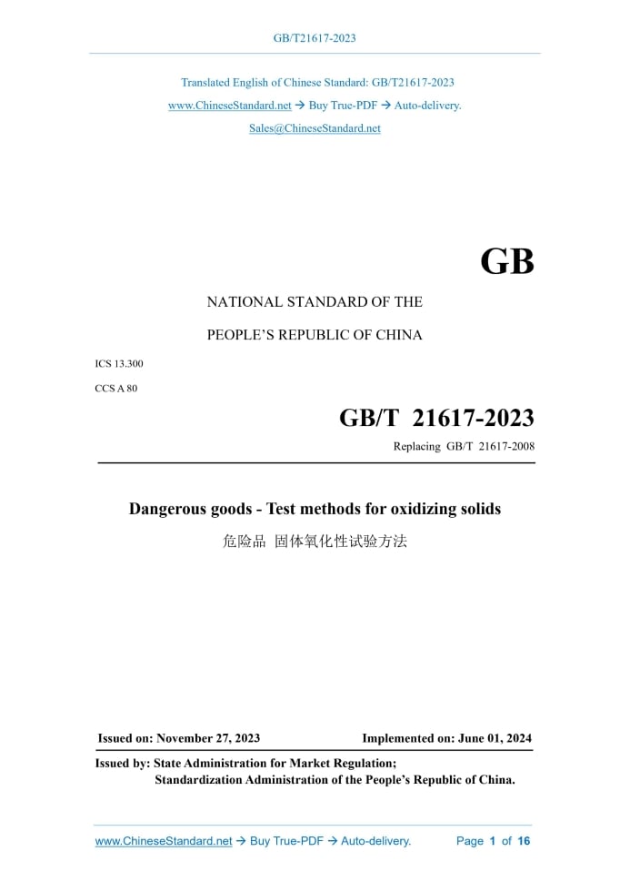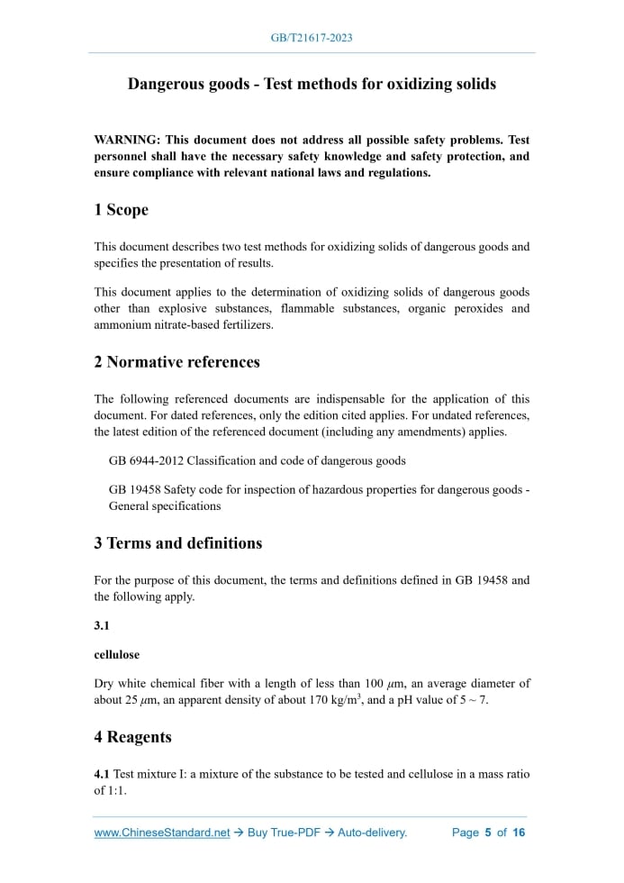 Similar standardsGB/T 21617-2023: Dangerous goods - Test methods for oxidizing solids---This is an excerpt. Full copy of true-PDF in English version (including equations, symbols, images, flow-chart, tables, and figures etc.), auto-downloaded/delivered in 9 seconds, can be purchased online: https://www.ChineseStandard.net/PDF.aspx/GBT21617-2023GB NATIONAL STANDARD OF THE PEOPLE’S REPUBLIC OF CHINA ICS 13.300 CCS A 80 GB/T 21617-2023 Replacing GB/T 21617-2008 Dangerous goods - Test methods for oxidizing solids Issued on: NOVEMBER 27, 2023 Implemented on: JUNE 01, 2024 Issued by. State Administration for Market Regulation; Standardization Administration of the People’s Republic of China. Table of ContentsForeword... 3 1 Scope... 5 2 Normative references... 5 3 Terms and definitions... 5 4 Reagents... 5 5 Test methods... 6 6 Expression of results... 13 Bibliography... 16 Dangerous goods - Test methods for oxidizing solids WARNING. This document does not address all possible safety problems. Test personnel shall have the necessary safety knowledge and safety protection, and ensure compliance with relevant national laws and regulations.1 ScopeThis document describes two test methods for oxidizing solids of dangerous goods and specifies the presentation of results. This document applies to the determination of oxidizing solids of dangerous goods other than explosive substances, flammable substances, organic peroxides and ammonium nitrate-based fertilizers.2 Normative referencesThe following referenced documents are indispensable for the application of this document. For dated references, only the edition cited applies. For undated references, the latest edition of the referenced document (including any amendments) applies. GB 6944-2012 Classification and code of dangerous goods GB 19458 Safety code for inspection of hazardous properties for dangerous goods - General specifications3 Terms and definitionsFor the purpose of this document, the terms and definitions defined in GB 19458 and the following apply. 3.1 cellulose Dry white chemical fiber with a length of less than 100 μm, an average diameter of about 25 μm, an apparent density of about 170 kg/m3, and a pH value of 5 ~ 7.4 Reagents4.1 Test mixture I. a mixture of the substance to be tested and cellulose in a mass ratio of 1.1. e) particle size. the proportion of particles with a particle size less than 75 μm is greater than or equal to 99 %, of which the proportion of particles with a particle size less than 20 μm is greater than or equal to 50 %. 5.1.2.2 Preparation of cellulose Make the cellulose into a layer with a thickness of not more than 25 mm, dry it at 105 ℃ to constant mass (for at least 4 h), and then place it in a desiccator (with desiccant) until it cools down and is ready for use. The moisture content shall be less than 0.5 % on a dry weight basis. If necessary, the drying time shall be extended to ensure that the moisture content is less than 0.5 %. 5.1.2.3 Sample inspection Inspect the substance to be used for transportation. If the powder with a diameter of less than 500 μm accounts for more than 10 % of the total mass, or it is fragile, all test samples shall be ground into powder before test to avoid particle size reduction during loading and unloading and transportation. Since particle size has a great influence on the results, the particle size of the tested solid shall be stated in the test report. 5.1.2.4 Preparation of test mixtures 30.0 g ± 0.1 g of the substance to be tested (of which the particle size meets the requirements of 5.1.2.3) and cellulose are prepared into test mixture I and test mixture II respectively. Each test mixture shall be stirred for at least 1 min to mix as completely as possible, avoiding excessive stirring. Each test mixture shall be prepared separately and used as soon as possible. It shall be extracted from different batches of mixtures. 5.1.2.5 Preparation of standard mixtures 30.0 g ± 0.1 g of calcium peroxide standard substance and cellulose are prepared into standard mixtures I, II and III respectively. Each standard mixture shall be stirred for at least 1 min to mix as completely as possible, avoiding excessive stirring. Each standard mixture shall be prepared separately and used as soon as possible. It shall be extracted from different batches of mixtures. 5.1.3 Instruments and equipment 5.1.3.1 Balance and accessories 5.1.3.1.1 The balance shall have a measurement range and accuracy that meet the test requirements, and have data transmission function and data acquisition interface. It can record the required data (time, mass), and check the time frequency of the data acquisition software through a stopwatch, with a frequency of more than 5 Hz. 5.1.3.1.2 Use a base plate made of solid material, a positioning plate made of flame- retardant material, and several guide rods to construct a support structure for the burning test on the balance. 5.1.3.1.3 Use a windshield to ensure that the balance is not affected by ventilation or ambient airflow. 5.1.3.1.4 The burning cone stack shall always be placed in the center of the balance to protect the balance from contact with heat sources and burning particles during the test. 5.1.3.1.5 The balance and accessories should be constructed as follows (the letters in brackets correspond to the key in Figure 1). a) Use a sufficiently strong base plate (H) (such as a 4 mm steel plate or a 16 mm polyamide plate) to keep the metal guide rods (G) in a stable position at all times, and the base plate is larger than the balance; fix the bottom of the plate on some buffer material to reduce environmental vibration; fix 2 to 4 metal guide rods (G) on the base plate to ensure that the positioning plate (F) and the test plate (C) protect the balance during the test and are always in the same position on the balance; the balance shall always be in the center of the base plate. b) The positioning plate (F) is made of flame-retardant, low thermal 