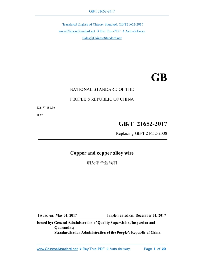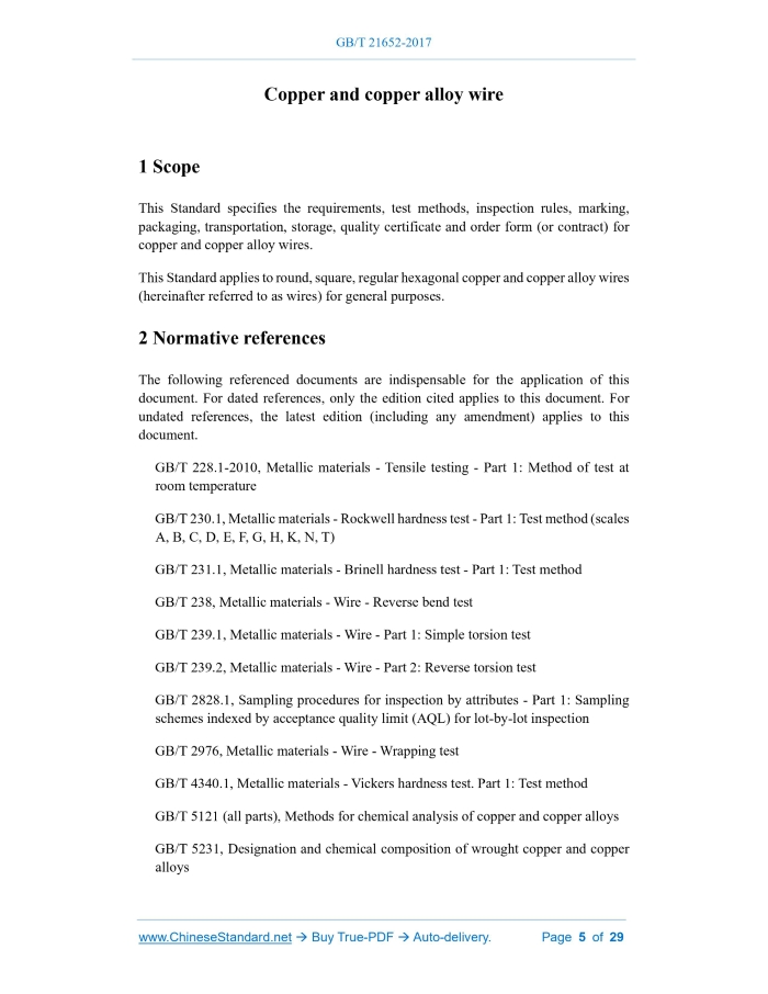 Similar standardsGB/T 21652-2017: Copper and copper alloy wire---This is an excerpt. Full copy of true-PDF in English version (including equations, symbols, images, flow-chart, tables, and figures etc.), auto-downloaded/delivered in 9 seconds, can be purchased online: https://www.ChineseStandard.net/PDF.aspx/GBT21652-2017GB NATIONAL STANDARD OF THE PEOPLE’S REPUBLIC OF CHINA ICS 77.150.30 H 62 Replacing GB/T 21652-2008 Copper and copper alloy wire Issued on. MAY 31, 2017 Implemented on. DECEMBER 01, 2017 Issued by. General Administration of Quality Supervision, Inspection and Quarantine; Standardization Administration of the People’s Republic of China. Table of ContentsForeword... 3 1 Scope... 5 2 Normative references... 5 3 Requirements... 6 4 Test methods... 24 5 Inspection rules... 26 6 Marking, packaging, transportation, storage and quality certificate... 28 7 Order form (or contract) contents... 291 ScopeThis Standard specifies the requirements, test methods, inspection rules, marking, packaging, transportation, storage, quality certificate and order form (or contract) for copper and copper alloy wires. This Standard applies to round, square, regular hexagonal copper and copper alloy wires (hereinafter referred to as wires) for general purposes.2 Normative referencesThe following referenced documents are indispensable for the application of this document. For dated references, only the edition cited applies to this document. For undated references, the latest edition (including any amendment) applies to this document. GB/T 228.1-2010, Metallic materials - Tensile testing - Part 1.Method of test at room temperature GB/T 230.1, Metallic materials - Rockwell hardness test - Part 1.Test method (scales A, B, C, D, E, F, G, H, K, N, T) GB/T 231.1, Metallic materials - Brinell hardness test - Part 1.Test method GB/T 238, Metallic materials - Wire - Reverse bend test GB/T 239.1, Metallic materials - Wire - Part 1.Simple torsion test GB/T 239.2, Metallic materials - Wire - Part 2.Reverse torsion test GB/T 2828.1, Sampling procedures for inspection by attributes - Part 1.Sampling schemes indexed by acceptance quality limit (AQL) for lot-by-lot inspection GB/T 2976, Metallic materials - Wire - Wrapping test GB/T 4340.1, Metallic materials - Vickers hardness test. Part 1.Test method GB/T 5121 (all parts), Methods for chemical analysis of copper and copper alloys GB/T 5231, Designation and chemical composition of wrought copper and copper alloys3 Requirements3.1 Product classification 3.2 Chemical composition The chemical composition of each designation of the wire shall comply with the provisions of GB/T 5231. 3.3 External dimensions and their allowable deviation 3.4 Mechanical properties 3.4.1 The tensile strength at room temperature and the elongation after fracture of the wire shall meet the requirements in Table 4. 3.7 Torsion test Wires can be subjected to the torsion test, where the requirements shall be negotiated between the supplier and the buyer. 3.8 Wrapping test The silicon bronze and tin bronze wires used as springs shall be subjected to a wrapping test, where they shall be wound 10 times on a cylinder twice the diameter of the wire without cracking. 3.9 Residual stress 3.10 Fracture inspection The fracture of the wire shall be dense, without shrinkage, while slight defects that do not affect the use are allowed. The size and quantity of the defects shall comply with the provisions of YS/T 336. 3.11 Grain size Wires can be tested for grain size, where the requirements shall be negotiated between the supplier and the buyer. 3.12 Surface quality The surface of the wire shall be smooth and clean, and there shall be no defects that affect its use. 3.13 Coil weight4 Test methods4.1 Chemical composition The chemical composition analysis method of the wire shall be carried out according to the provisions of GB/T 5121 (all parts), YS/T 482 or YS/T 483, and the arbitration shall be carried out according to the provisions of GB/T 5121 (all parts). 4.2 Dimensions and their allowable deviation The measurement method of the outer dimension of the wire shall be carried out in accordance with the provisions of GB/T 26303.2. 4.3 Mechanical properties 4.4 Hydrogen embrittlement test The hydrogen embrittlement test method of the wire shall be carried out according to the provisions of GB/T 23606 for closed bending test method. 4.5 Reverse bend test The reverse bend test method of the wire shall be carried out according to the provisions of GB/T 238. 4.8 Residual stress The residual stress test method of the wire shall be carried out according to the provisions of GB/T 10567.2. 4.9 Fracture The fracture test method of the wire with diameter (or distance across sides) ≥ 5.0 mm shall be carried out according to the provisions of YS/T 336, and the fracture of the wire with diameter (or distance across sides) < 5.0 mm shall be sampled and inspected at the wire blank. 4.10 Grain size The grain size test method of the wire shall be carried out according to the provisions of YS/T 347. 4.11 Surface quality The surface quality of the wire shall be inspected visually.5 Inspection rules5.1 Inspection and acceptance 5.1.1 The wire shall be inspected by the technical supervision department of the supplier to ensure that the product quality complies with the provisions of this Standard and the order form (or contract); the quality certificate shall be filled. 5.2 Batch Wires shall be submitted in batches. Each batch shall consist of products of the same designation, state and specification, and the weight of each batch shall not exceed 1 500 kg. 5.3 Inspection items 5.3.1 Each batch of wires shall be inspected for chemical composition, external dimensions and deviation, tensile strength and elongation after fracture, fracture, surface quality and coil weight. 5.3.6 When required by the buyer, each batch of wires shall also be inspected for hardness, torsion test, and grain size. 5.4 Sampling The sampling of 